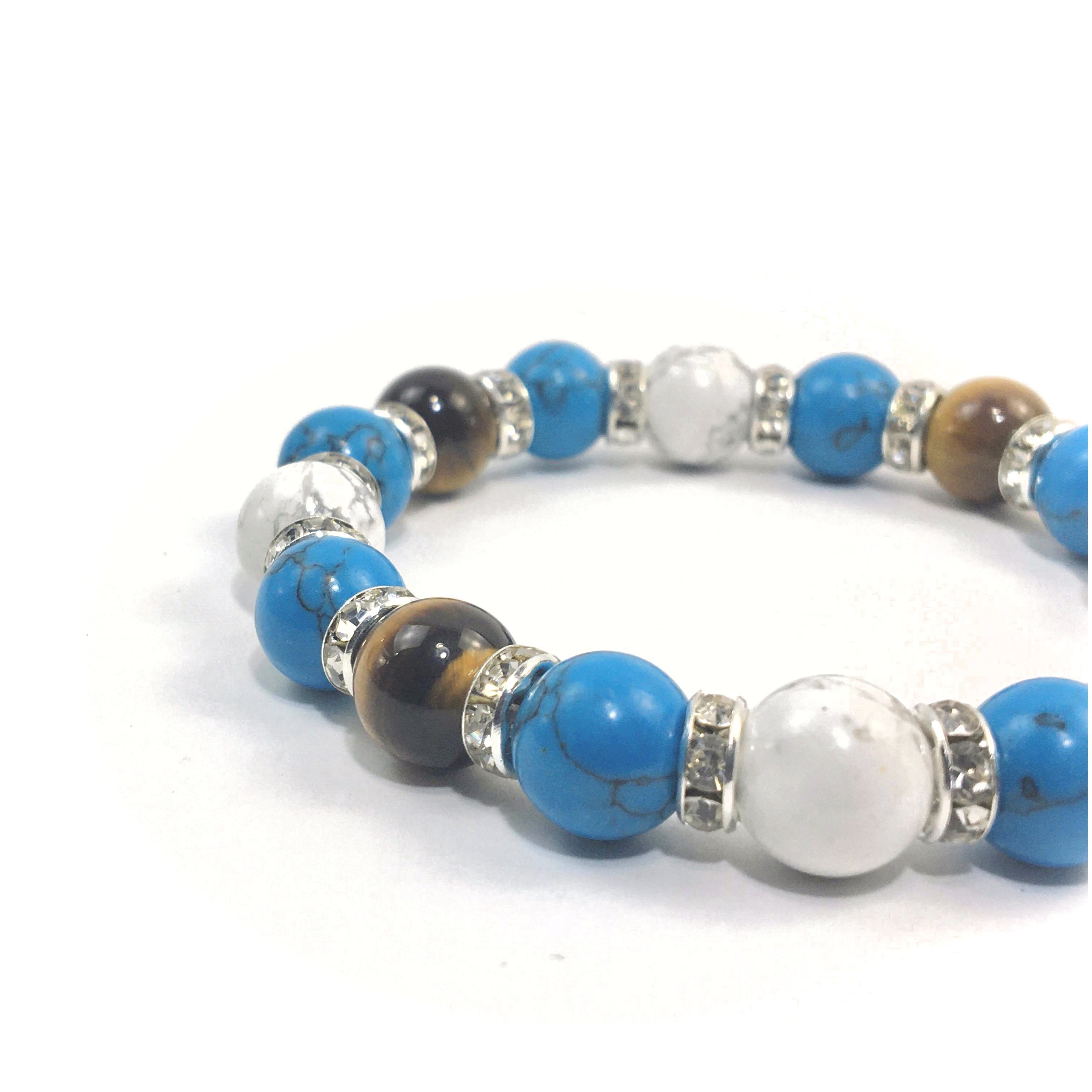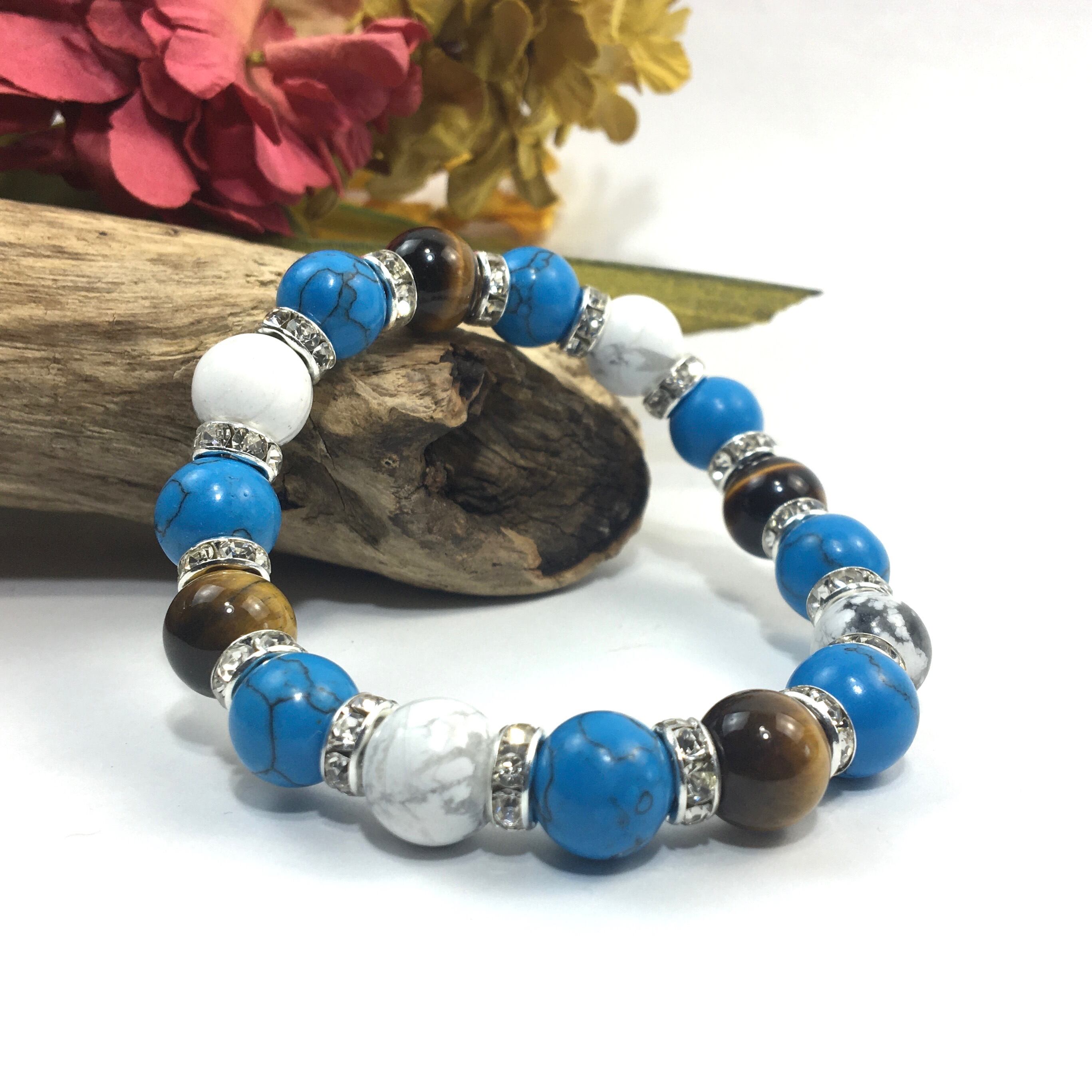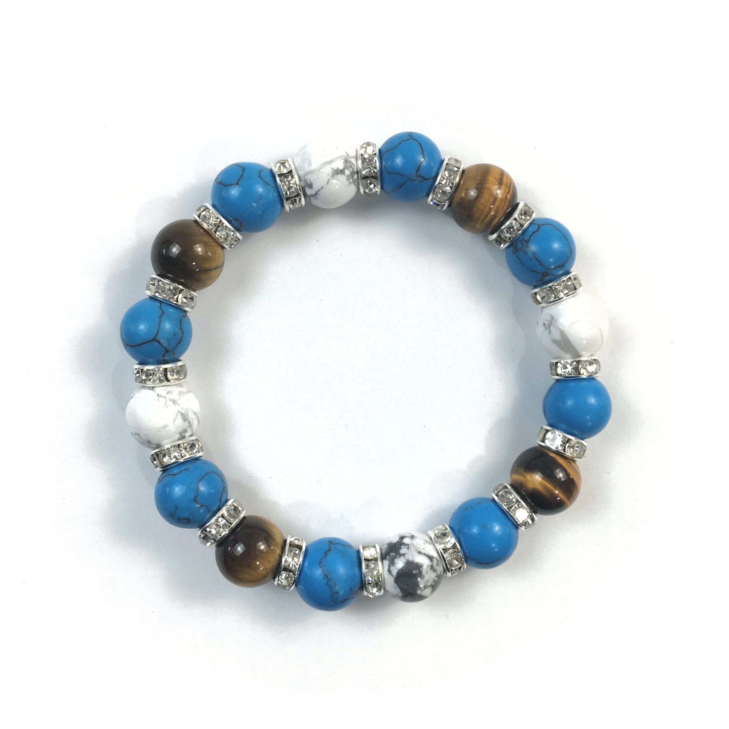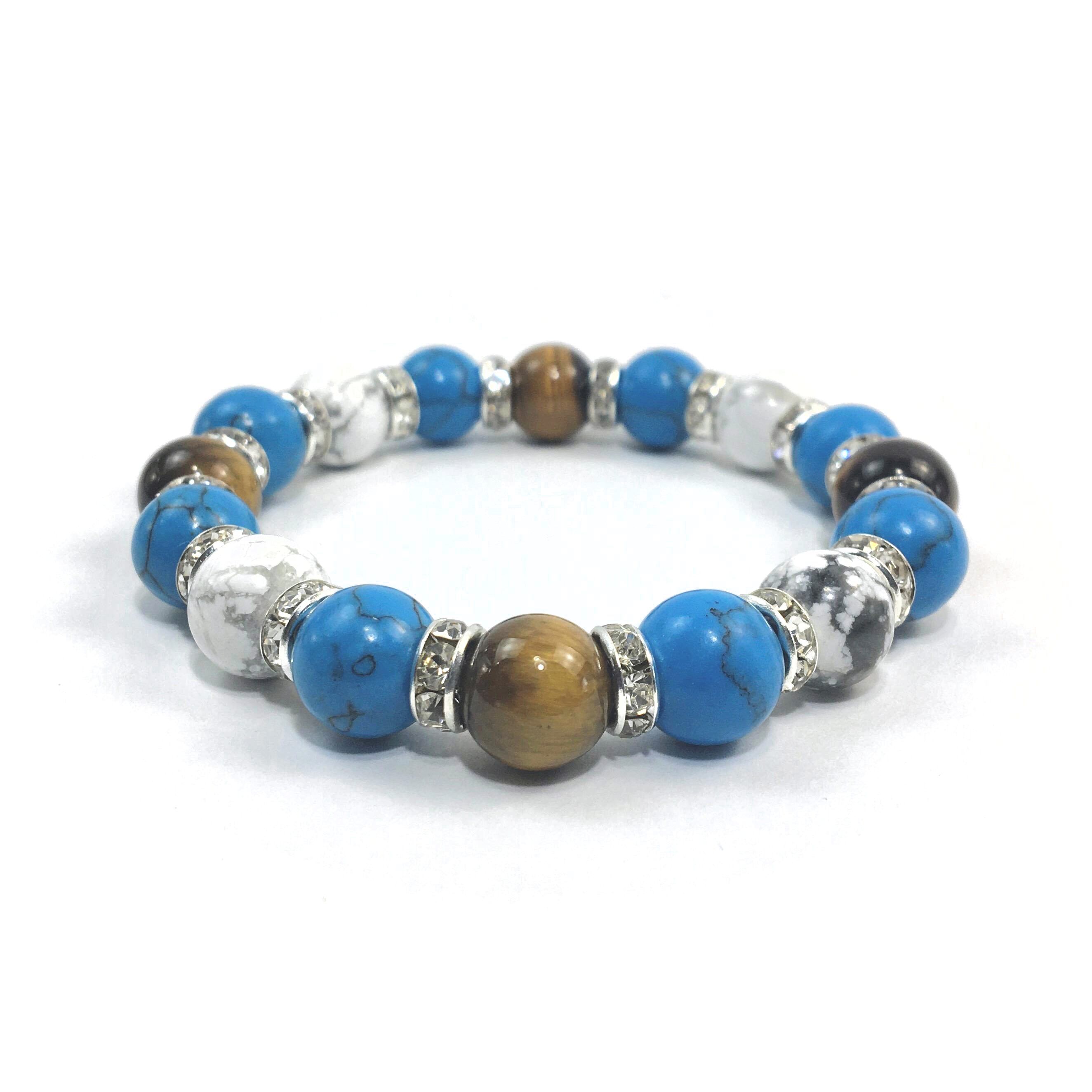 こちらは、タイガーアイとハウライトとターコイズを組み合わせたブレスレットです。間にはロンデルを挟み高級感あるデザインに仕上がっています。石大きさは腕にも馴染みやすいように10mm玉で内周約16cm(伸可能)です。数に限りがございますので気になる方はお早めにどうぞ。