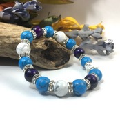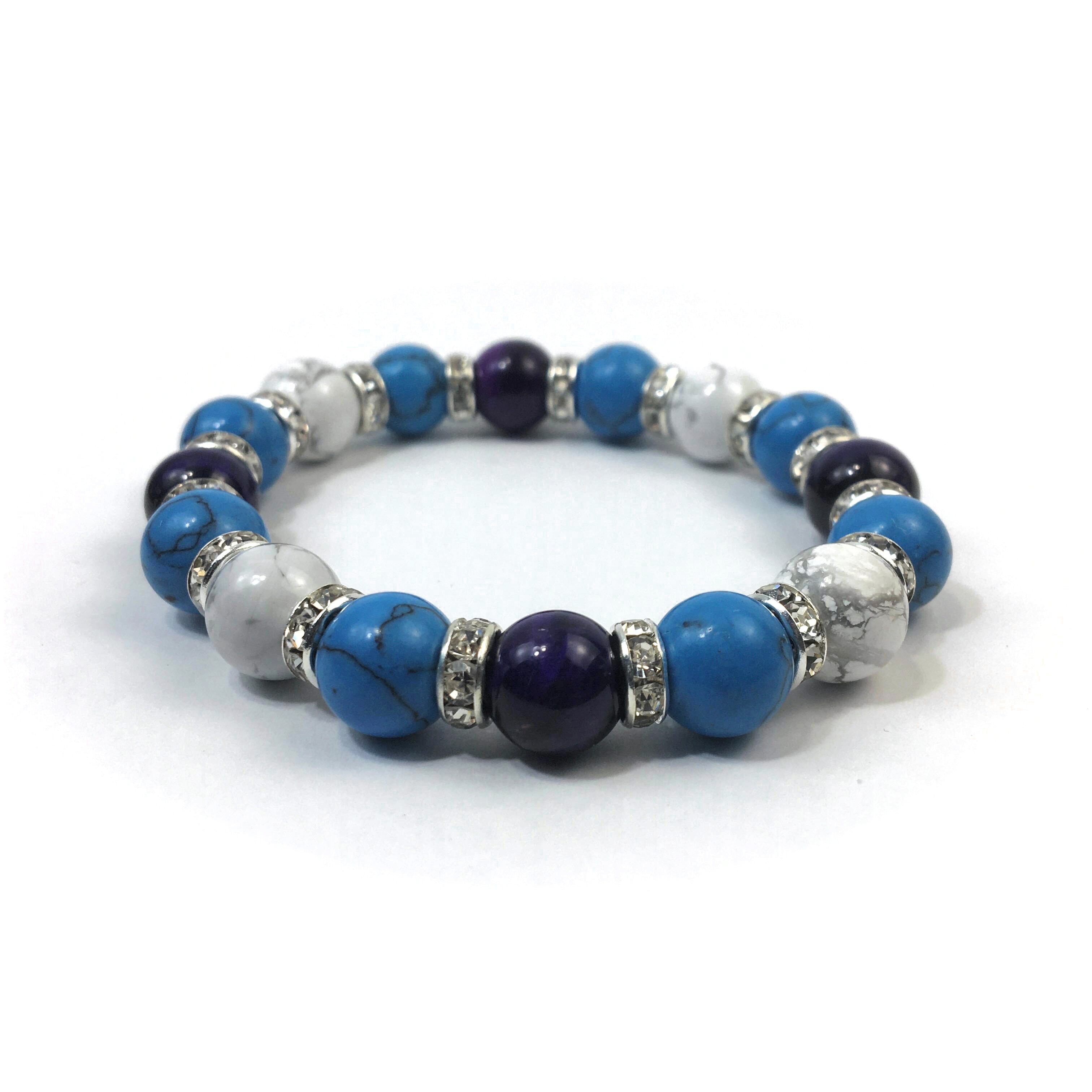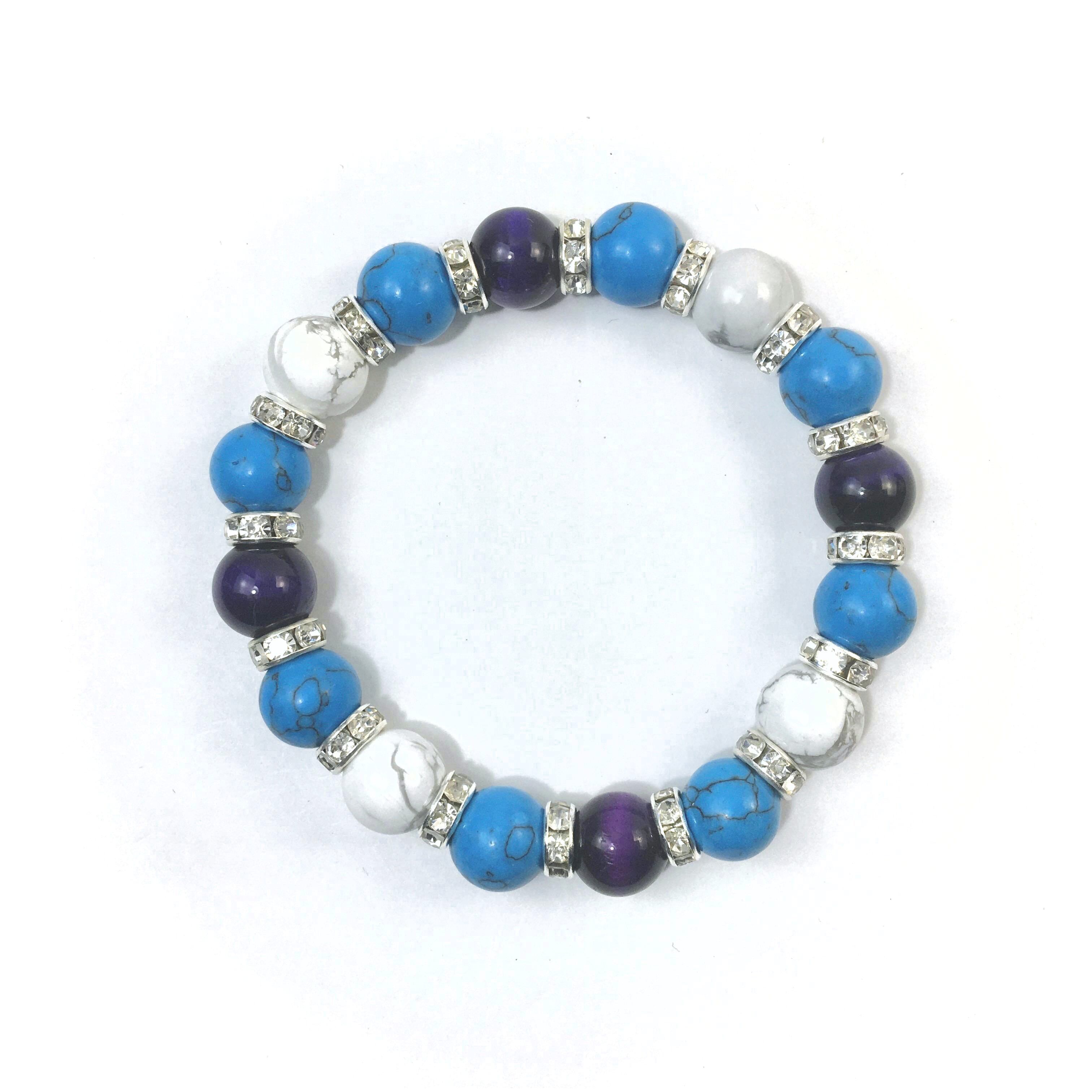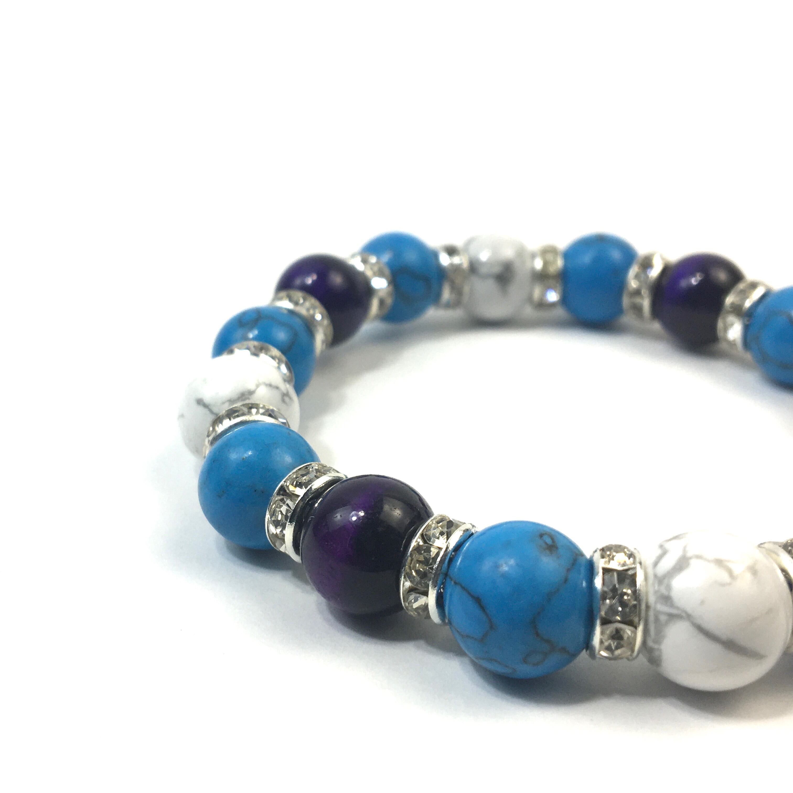 こちらは、パープルタイガーアイとハウライトとターコイズを組み合わせたブレスレットです。間にはロンデルを挟み高級感あるデザインに仕上がっています。石大きさは腕にも馴染みやすいように10mm玉で内周約16cmです。数に限りがございますので気になる方はお早めにどうぞ。