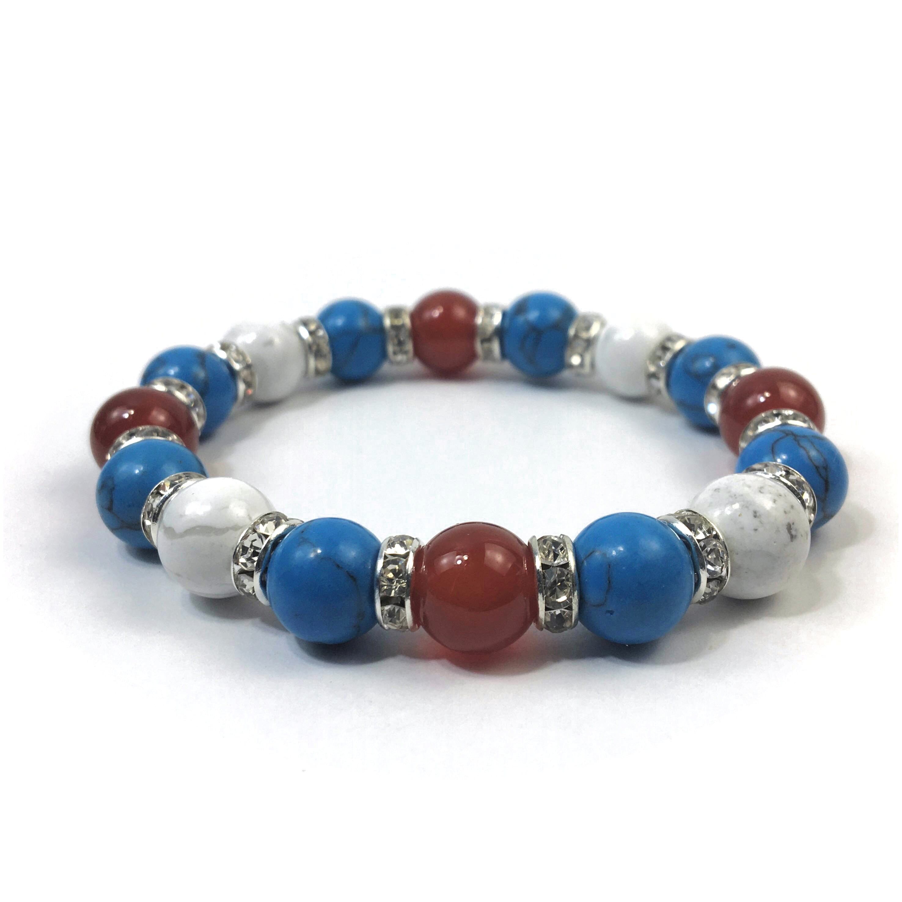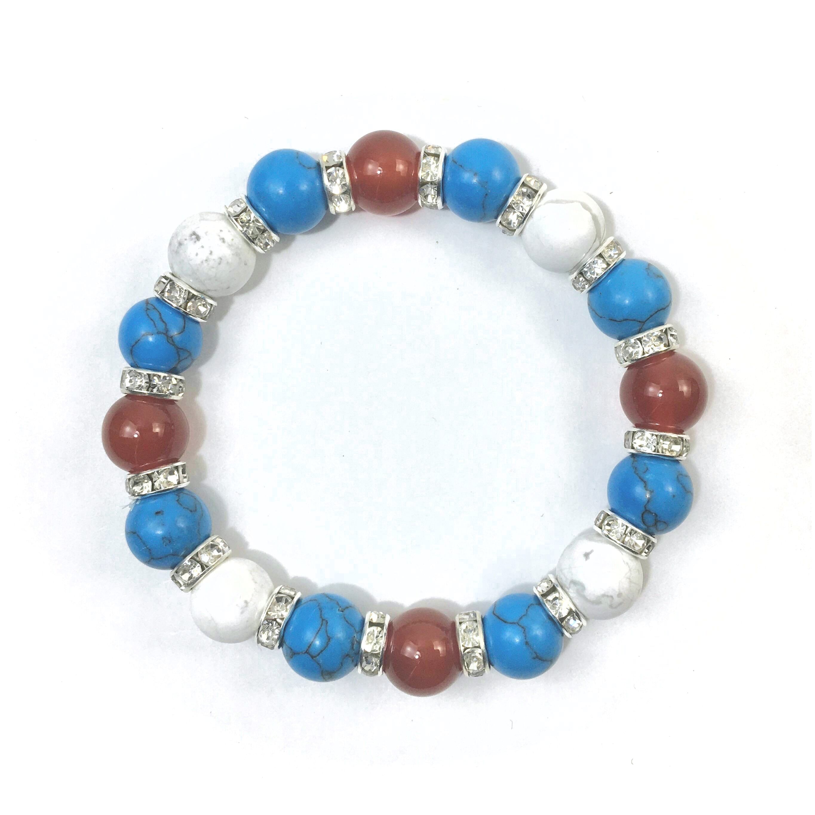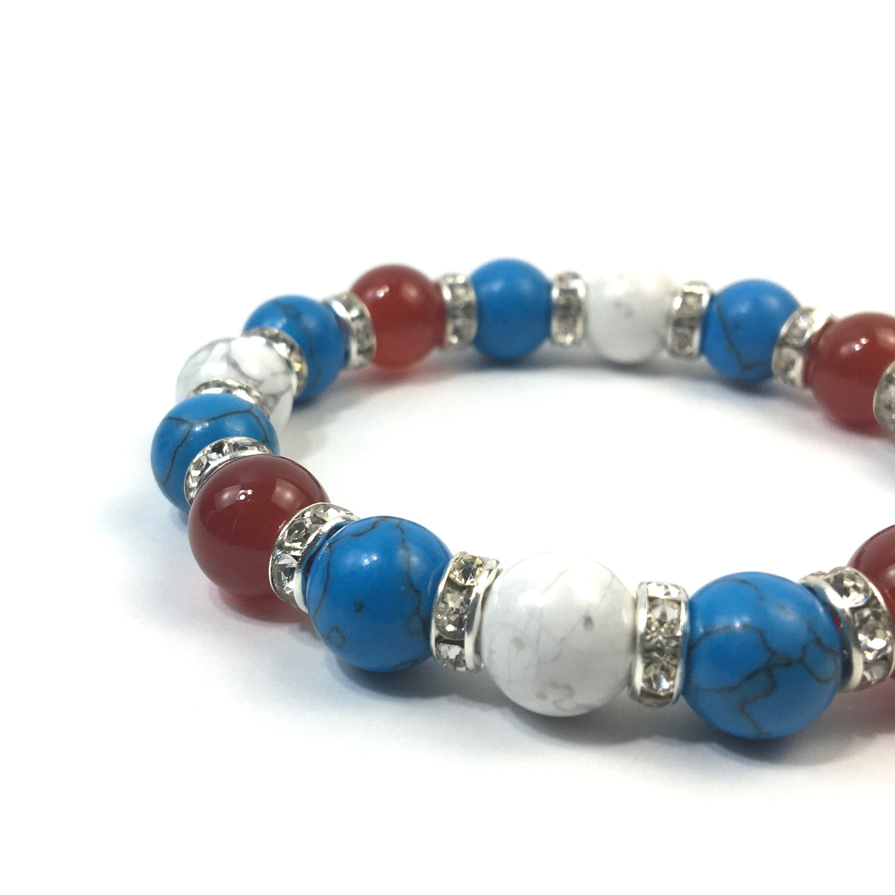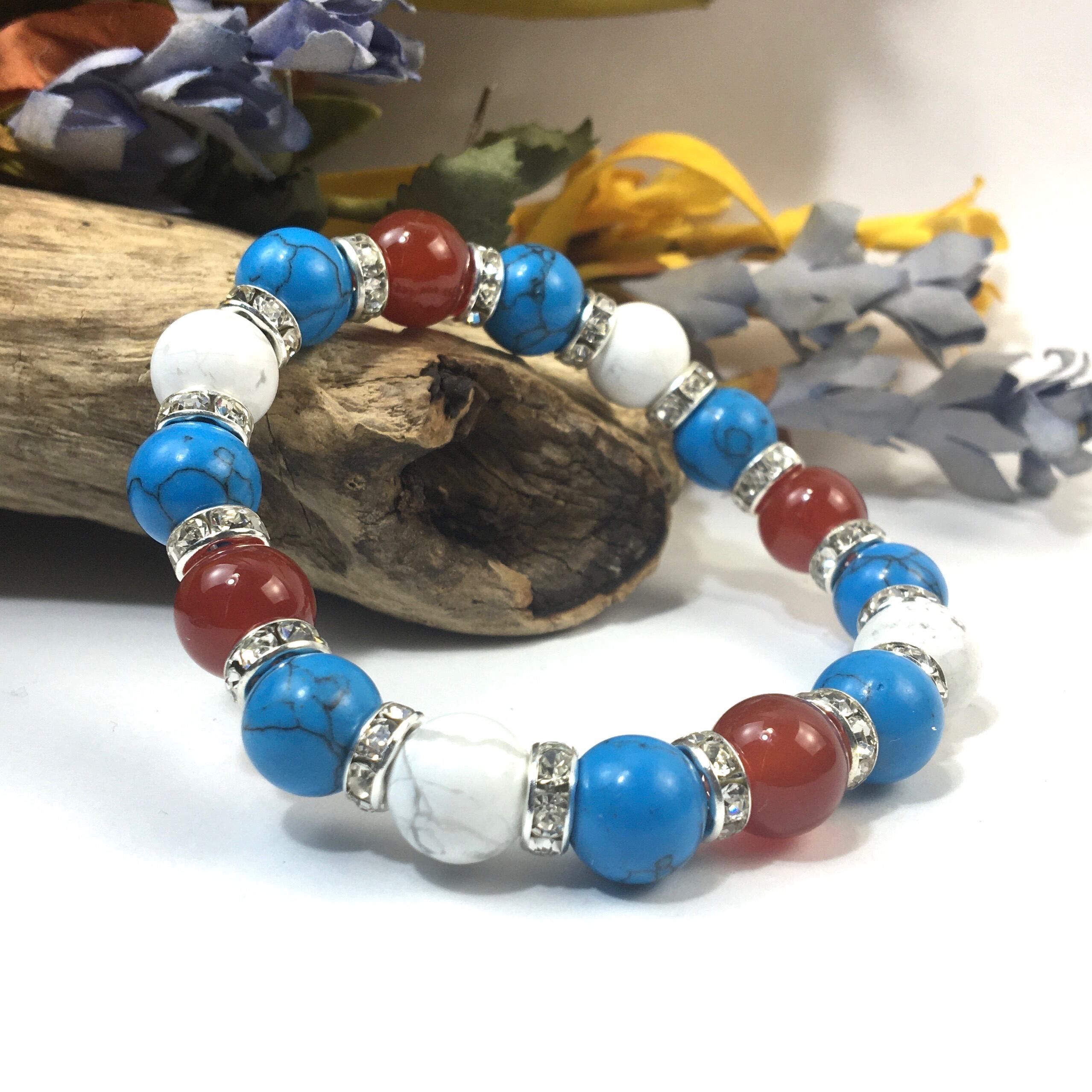 こちらは、赤瑪瑙とハウライトとターコイズを組み合わせたブレスレットです。間にはロンデルを挟み高級感あるデザインに仕上がっています。石大きさは腕にも馴染みやすいように10mm玉で内周約16cmです。数に限りがございますので気になる方はお早めにどうぞ。