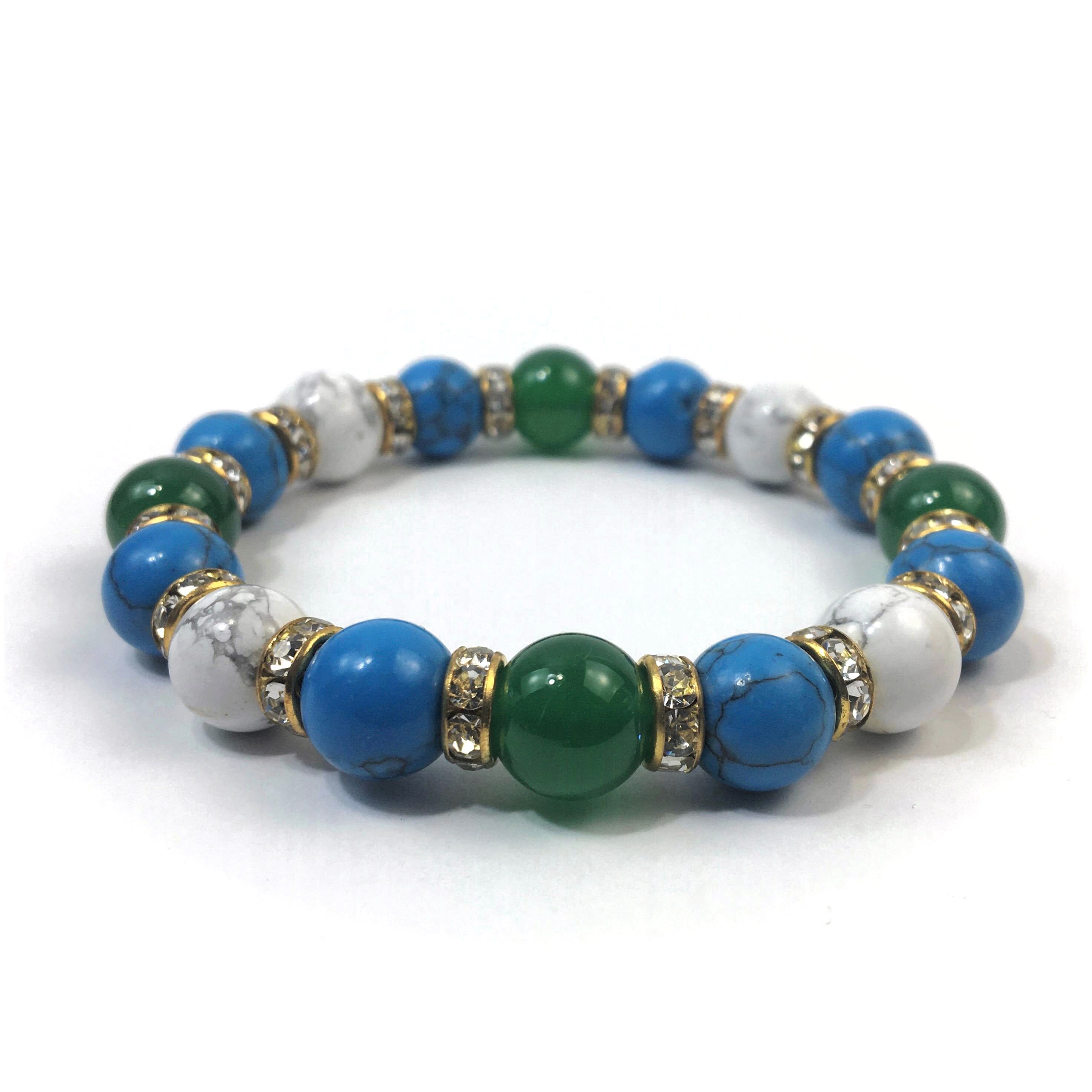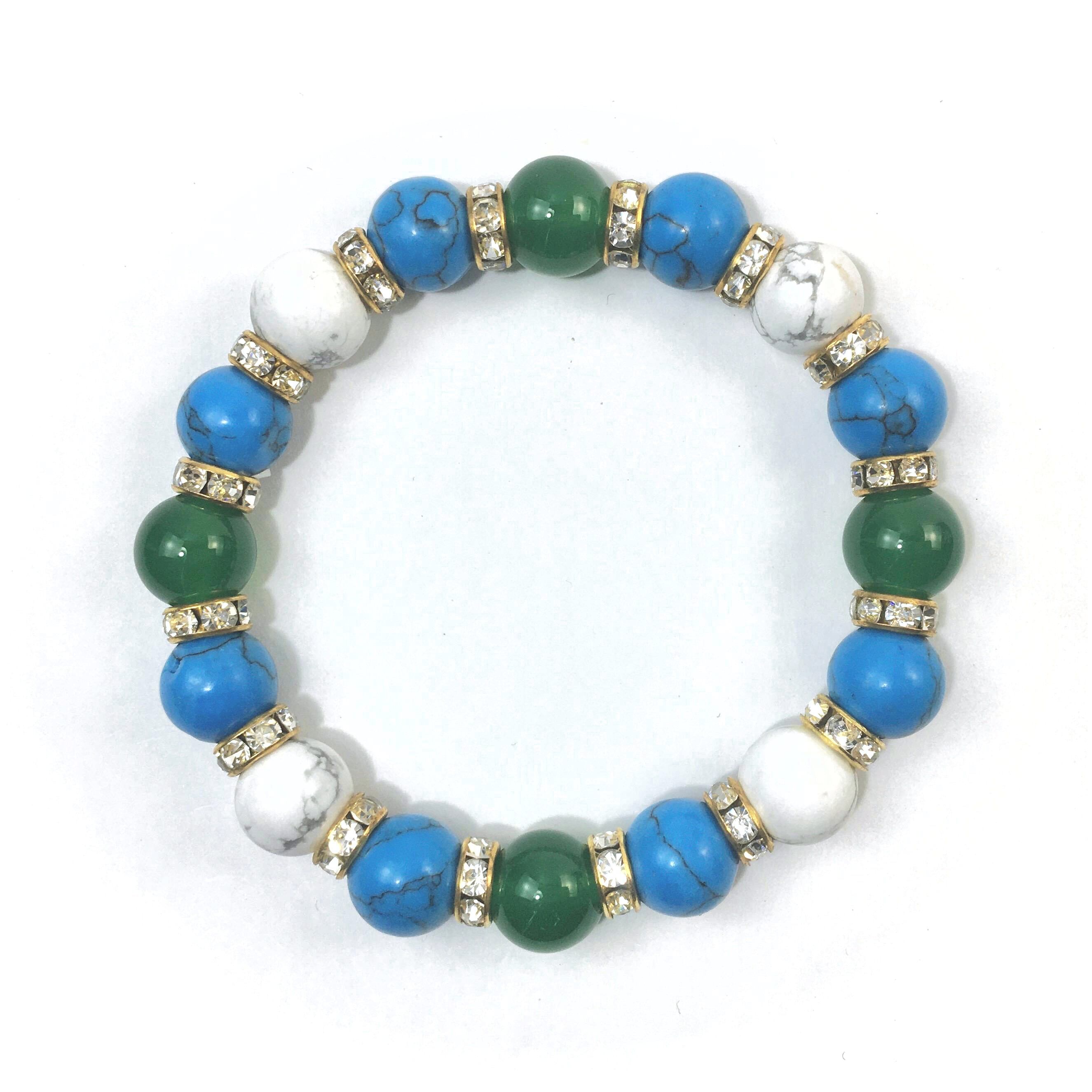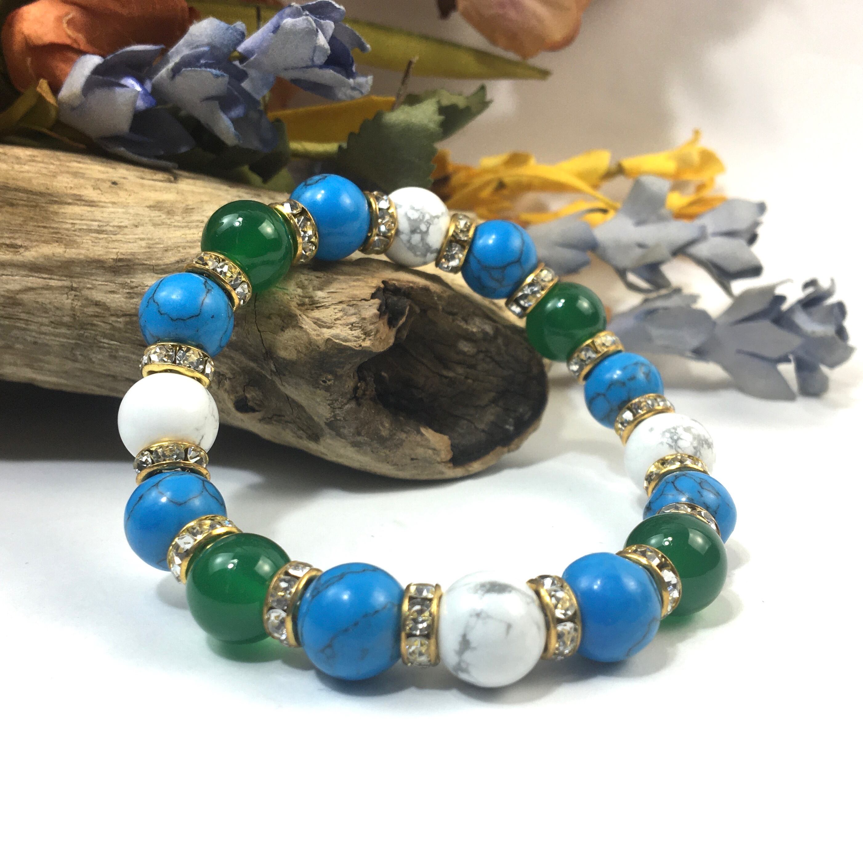 こちらは、緑瑪瑙とハウライトとターコイズを組み合わせたブレスレットです。間にはロンデルを挟み高級感あるデザインに仕上がっています。石大きさは腕にも馴染みやすいように10mm玉で内周約16cmです。数に限りがございますので気になる方はお早めにどうぞ。