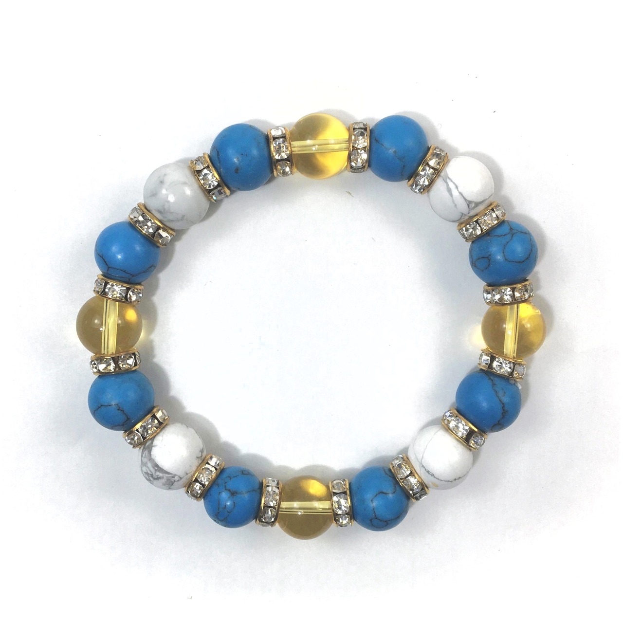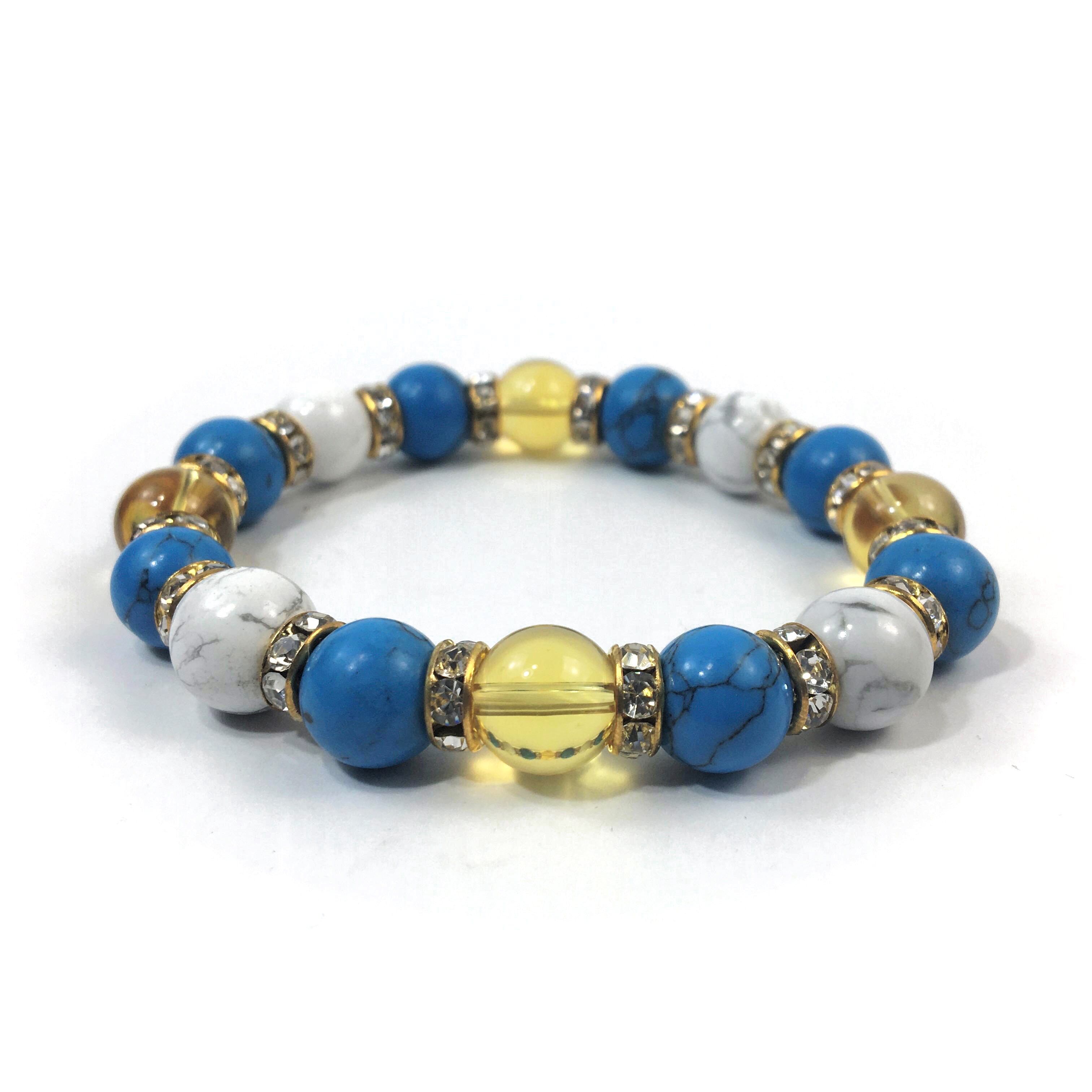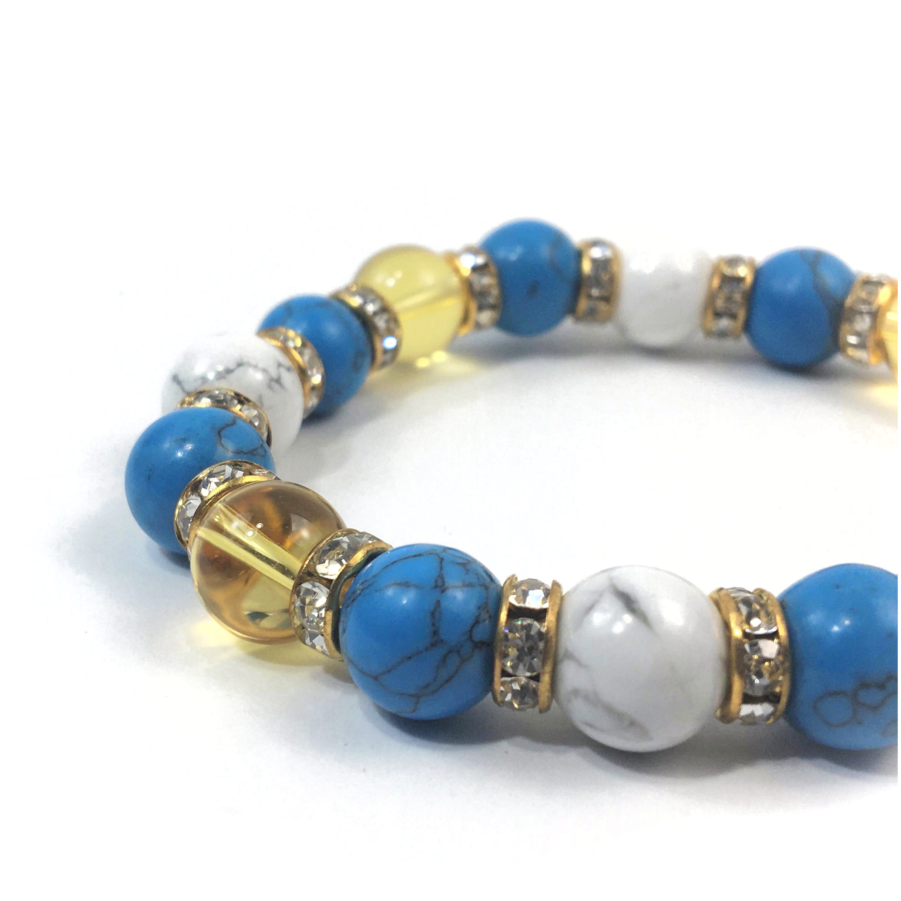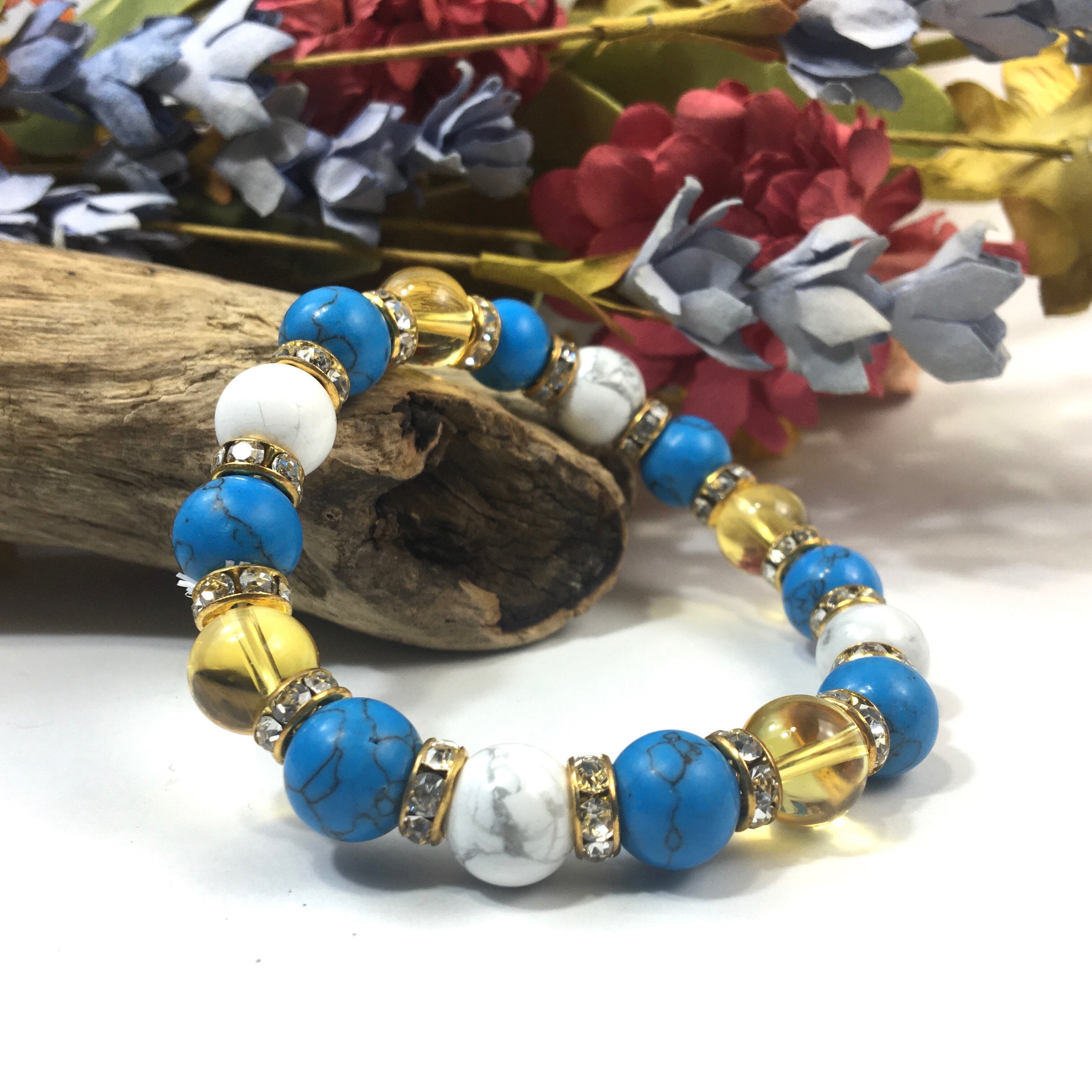 こちらは、シトリンとハウライトとターコイズを組み合わせたブレスレットです。間にはロンデルを挟み高級感あるデザインに仕上がっています。石大きさは腕にも馴染みやすいように10mm玉で内周約16cmです。数に限りがございますので気になる方はお早めにどうぞ。