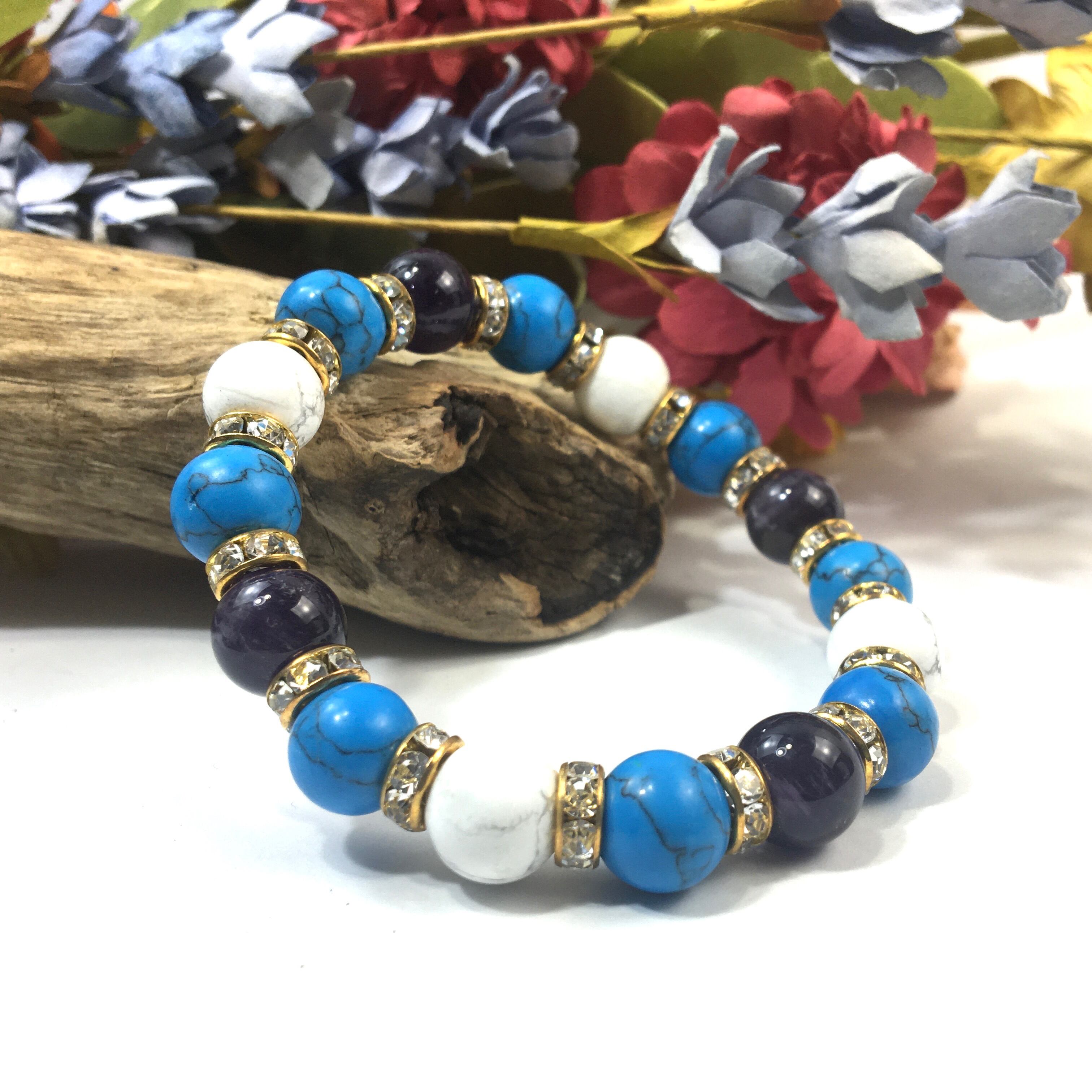 こちらは、アメジストとハウライトとターコイズを組み合わせたブレスレットです。間にはロンデルを挟み高級感あるデザインに仕上がっています。石大きさは腕にも馴染みやすいように10mm玉で内周約16cmです。数に限りがございますので気になる方はお早めにどうぞ。