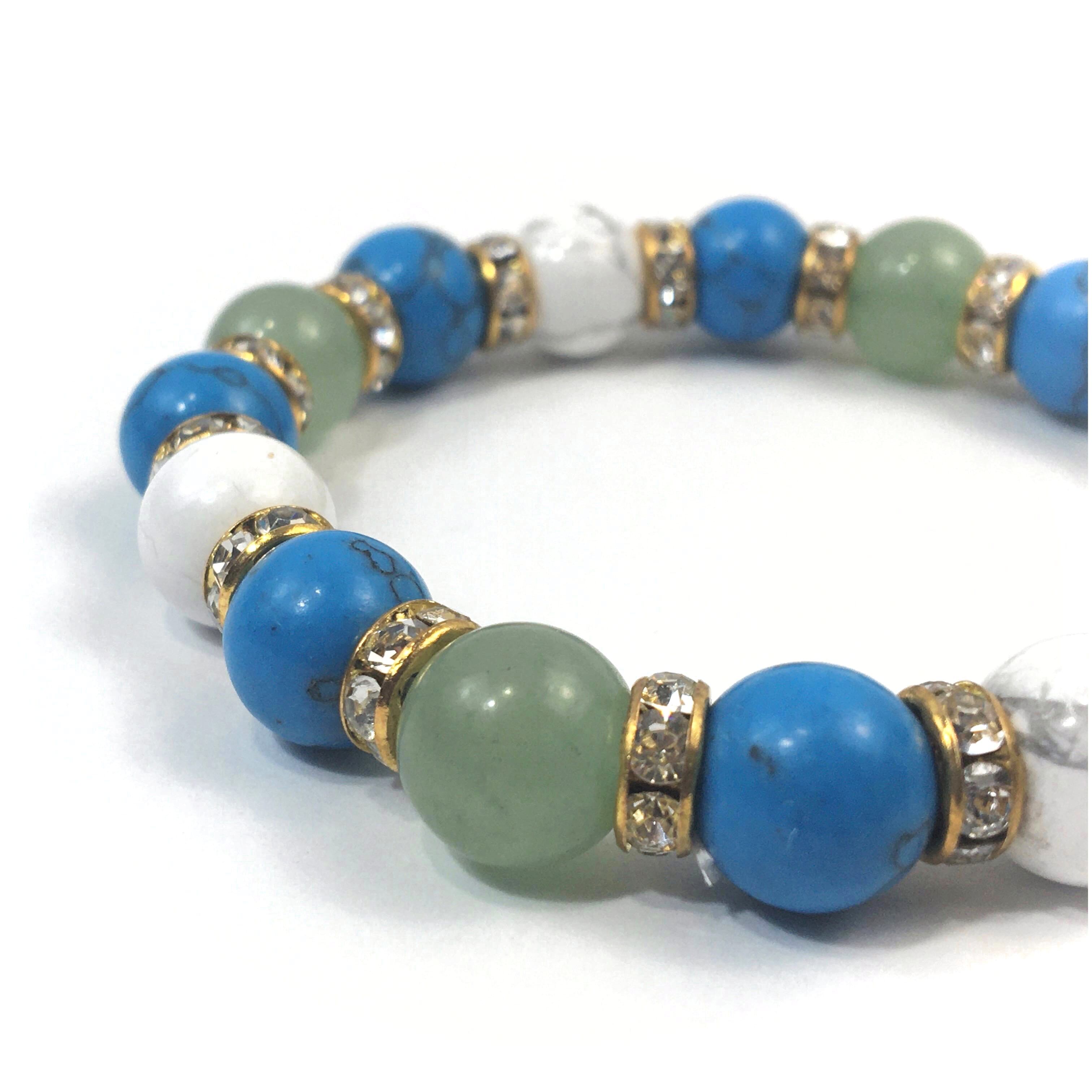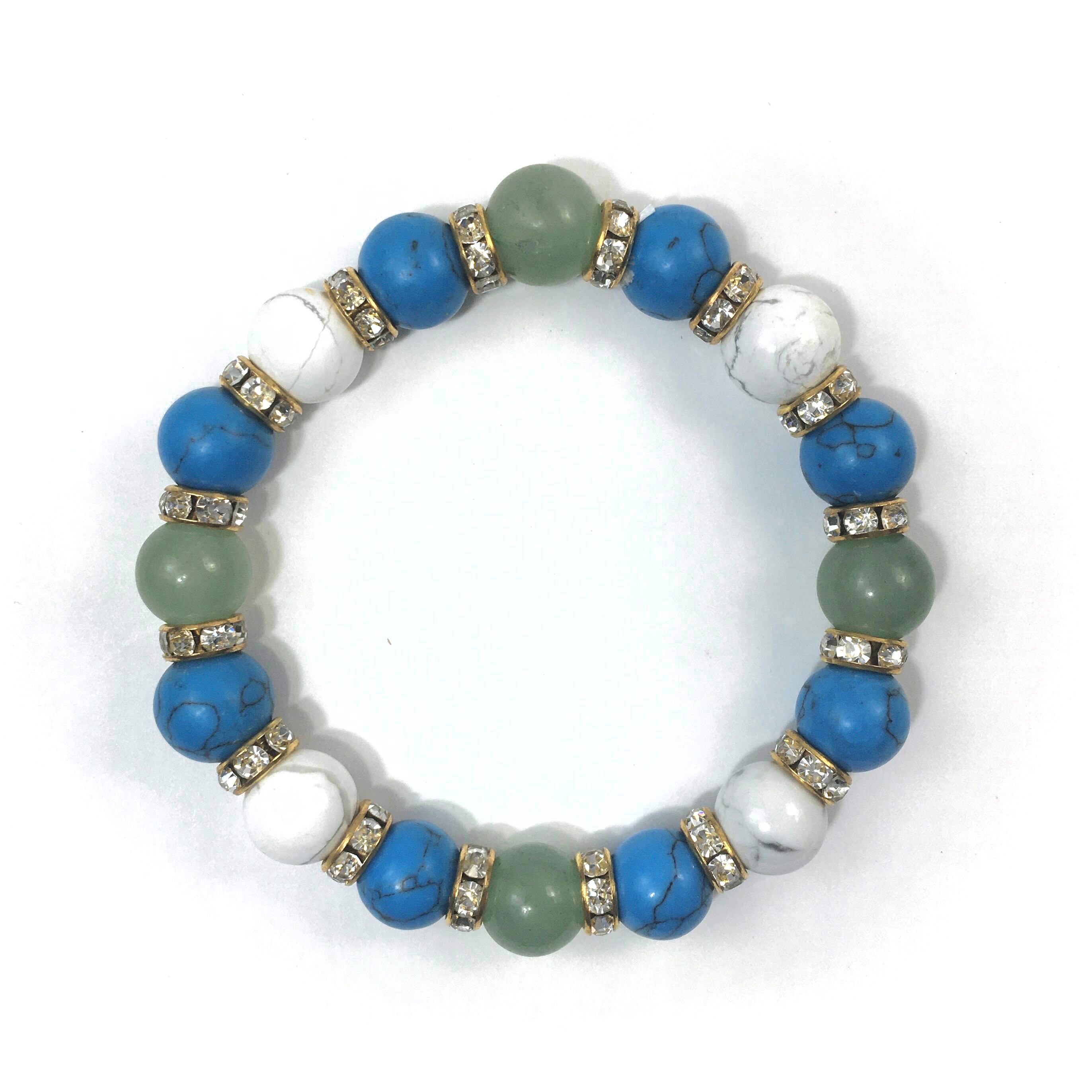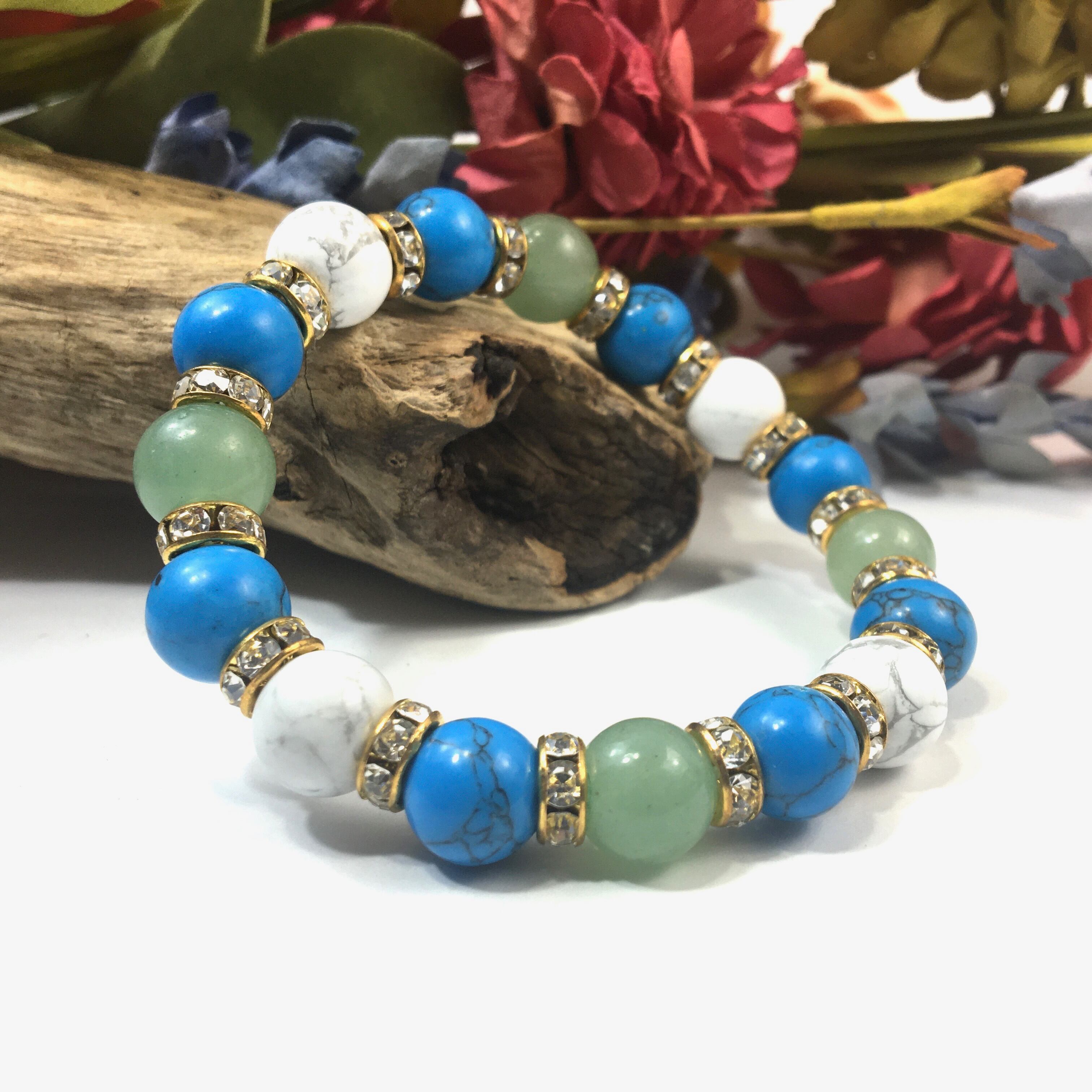 こちらは、アベンチュリンとハウライトとターコイズを組み合わせたブレスレットです。間にはロンデルを挟み高級感あるデザインに仕上がっています。石大きさは腕にも馴染みやすいように10mm玉で内周約16cmです。数に限りがございますので気になる方はお早めにどうぞ。