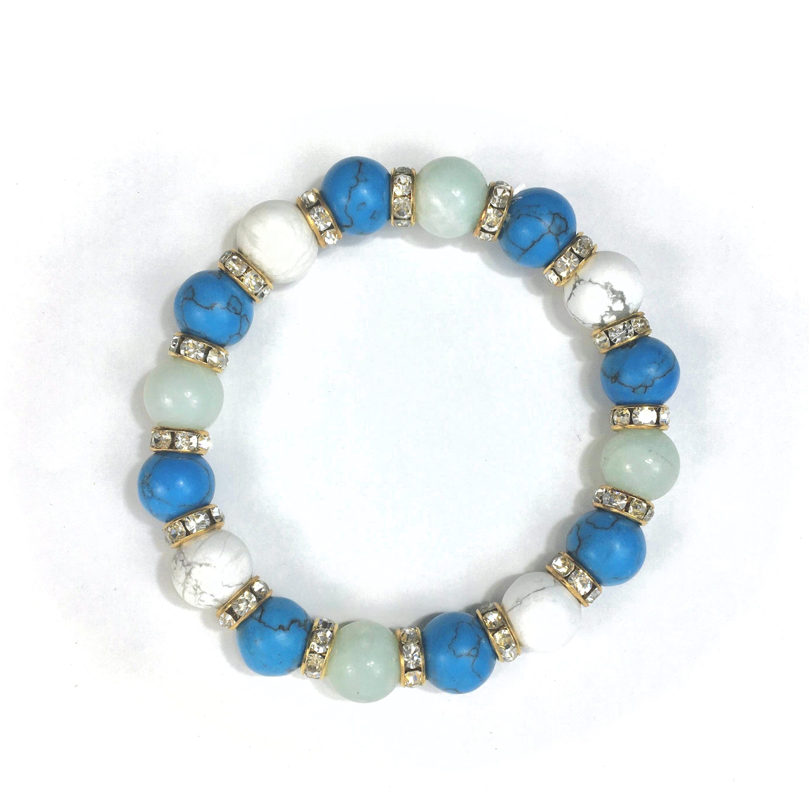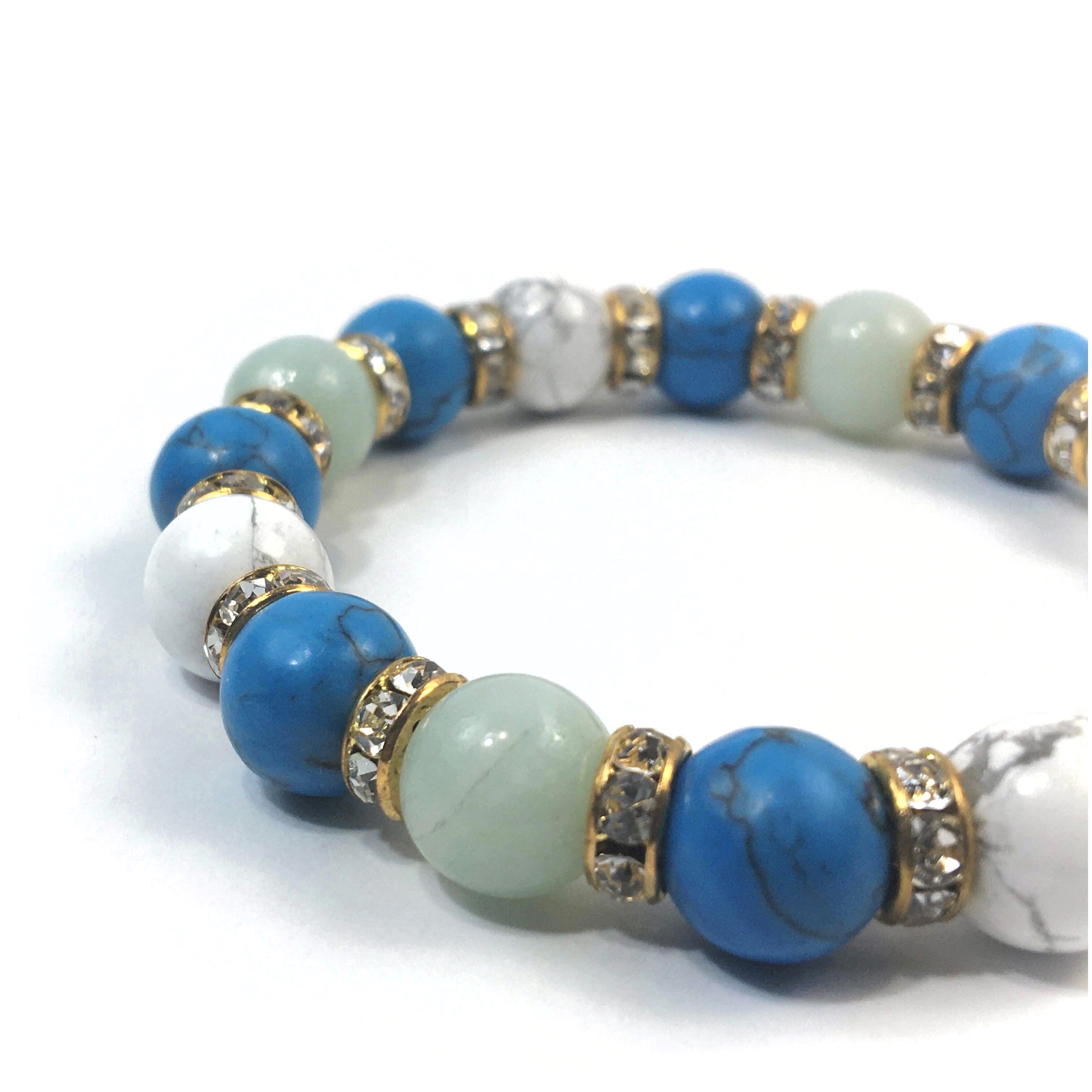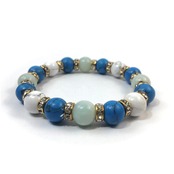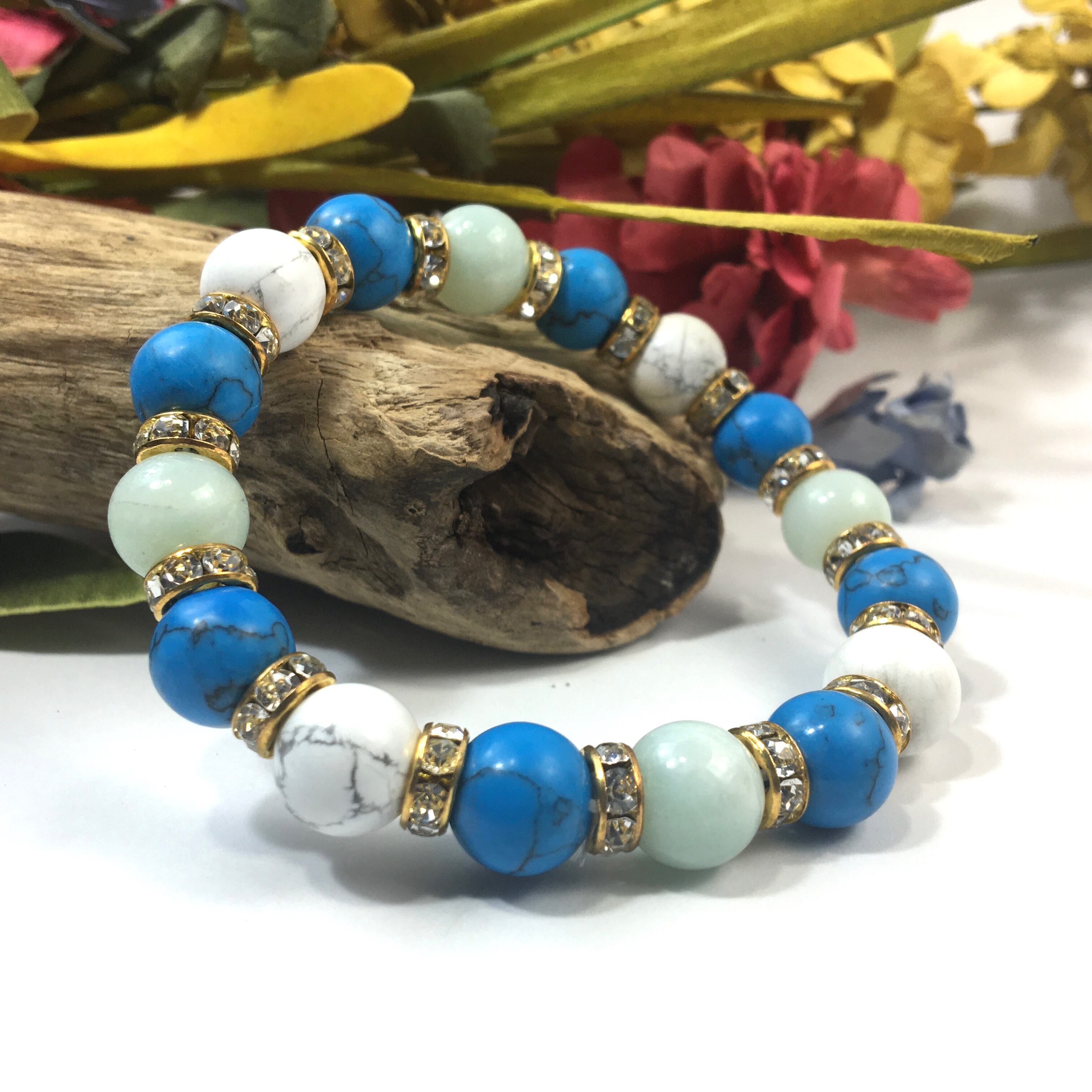 こちらは、アマゾナイトとハウライトとターコイズを組み合わせたブレスレットです。間にはロンデルを挟み高級感あるデザインに仕上がっています。石大きさは腕にも馴染みやすいように10mm玉で内周約16cmです。数に限りがございますので気になる方はお早めにどうぞ。