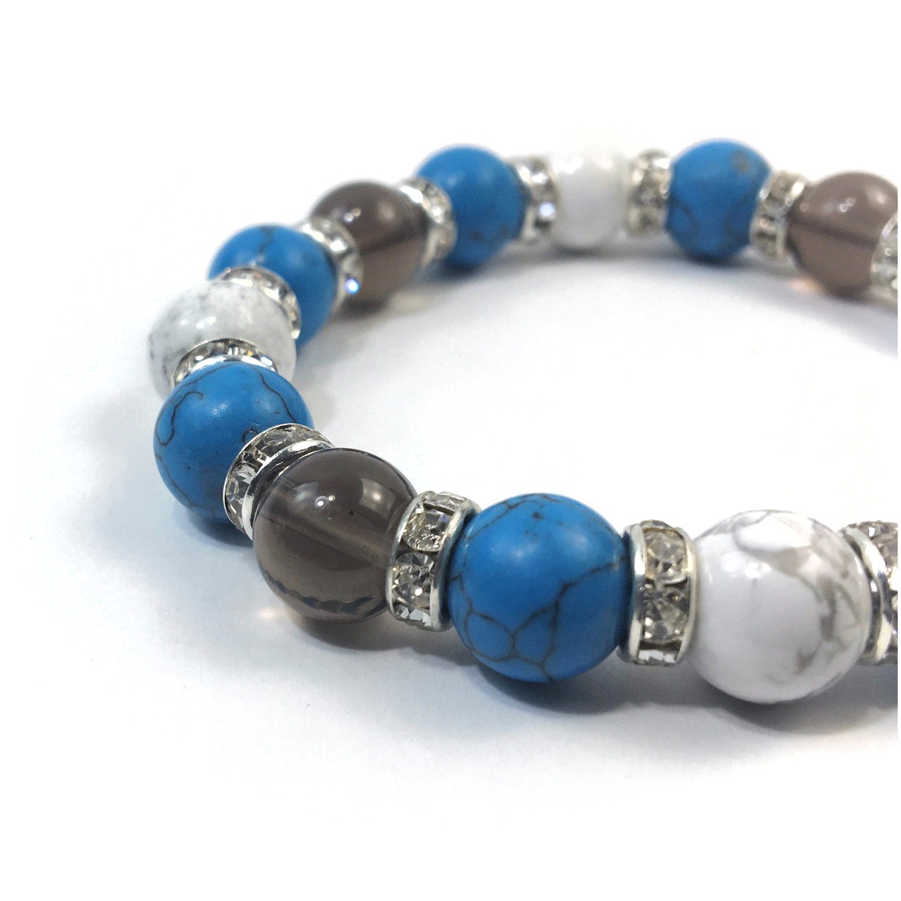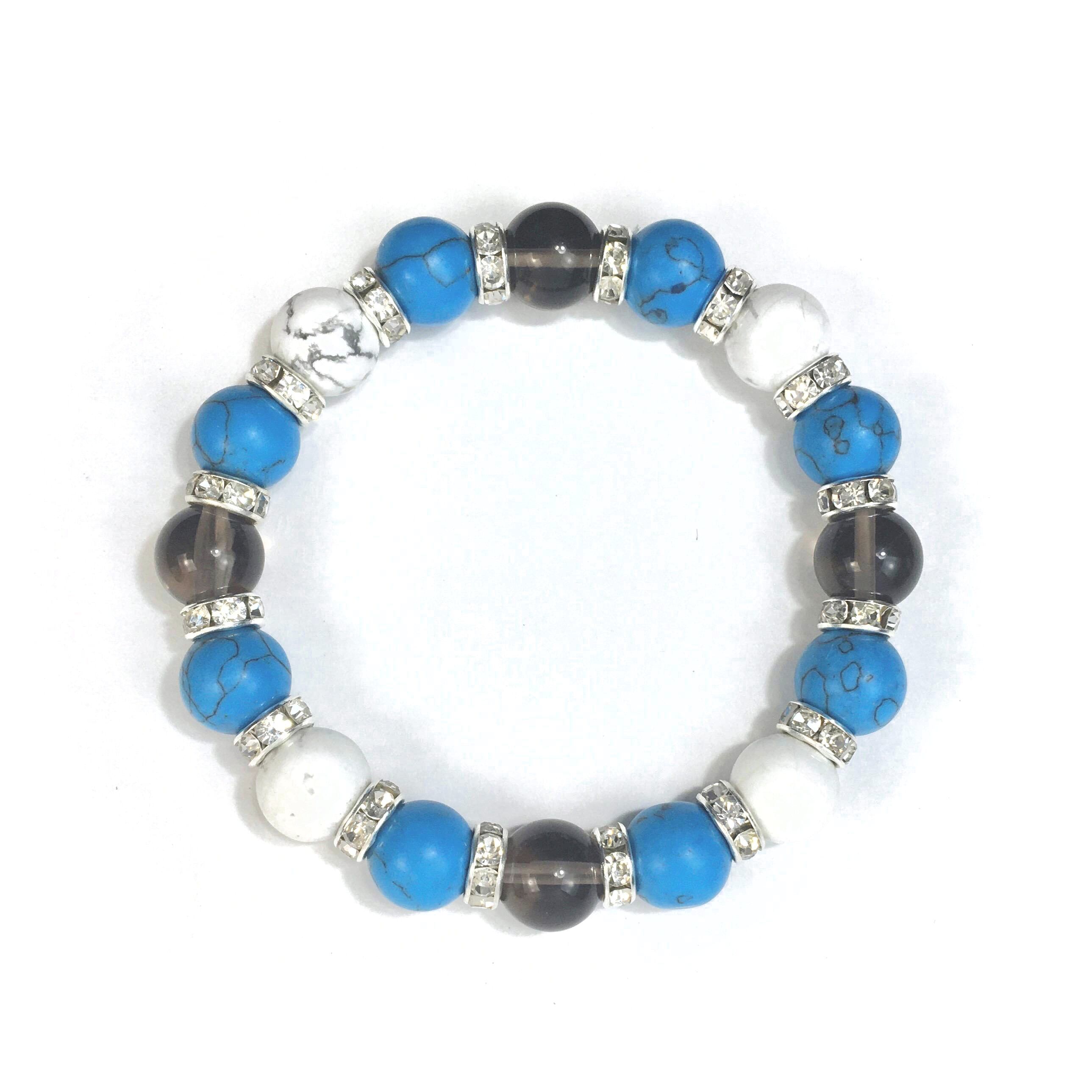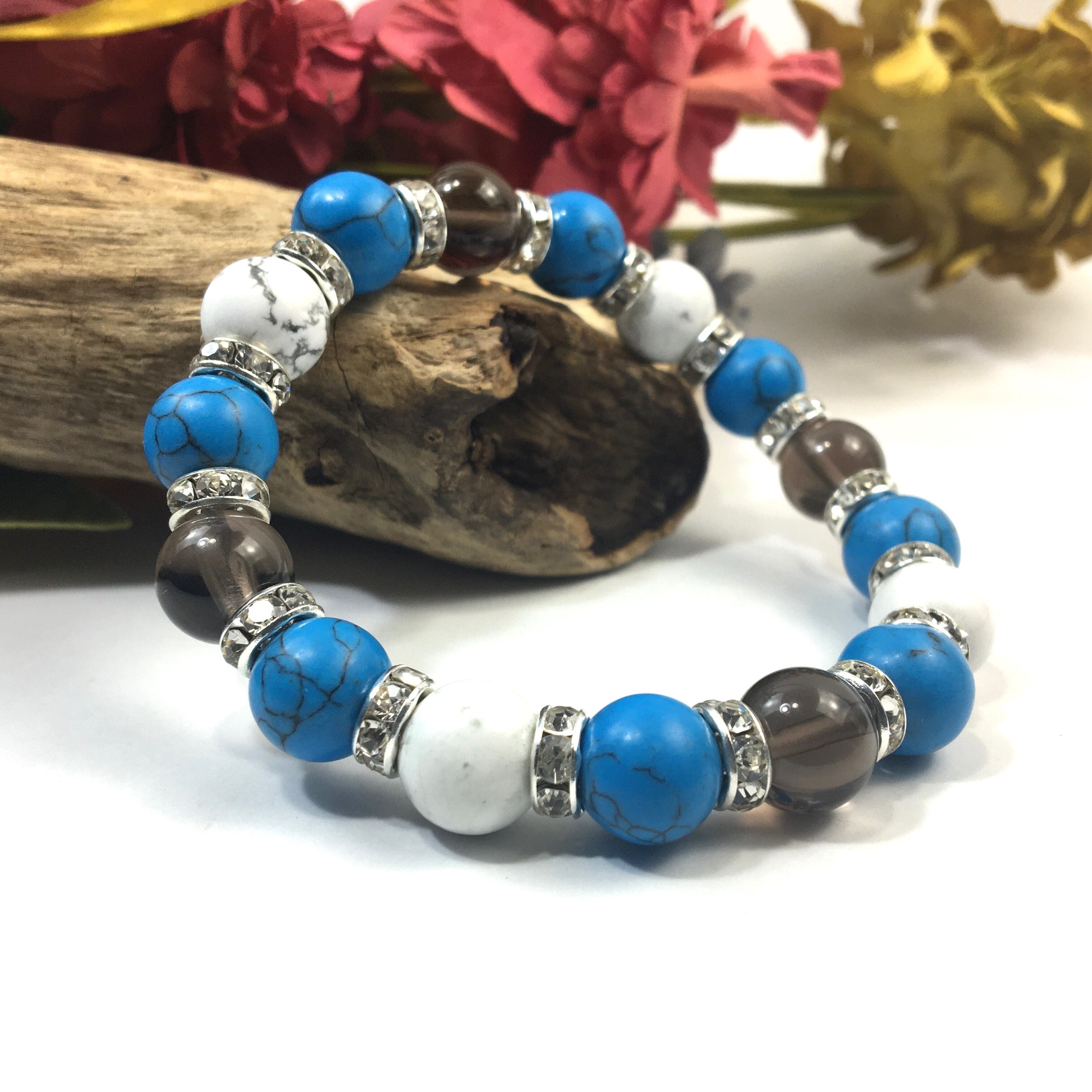 こちらは、スモーキークォーツとハウライトとターコイズを組み合わせたブレスレットです。間にはロンデルを挟み高級感あるデザインに仕上がっています。石大きさは腕にも馴染みやすいように10mm玉で内周約16cmです。数に限りがございますので気になる方はお早めにどうぞ。