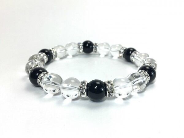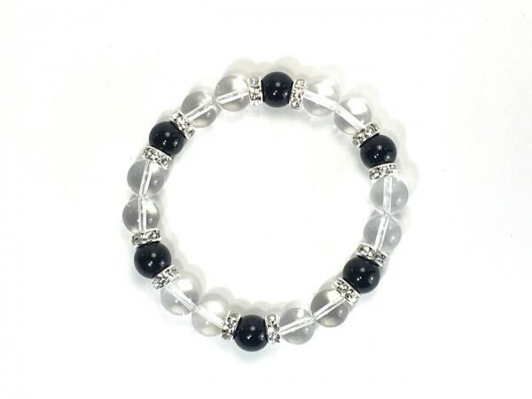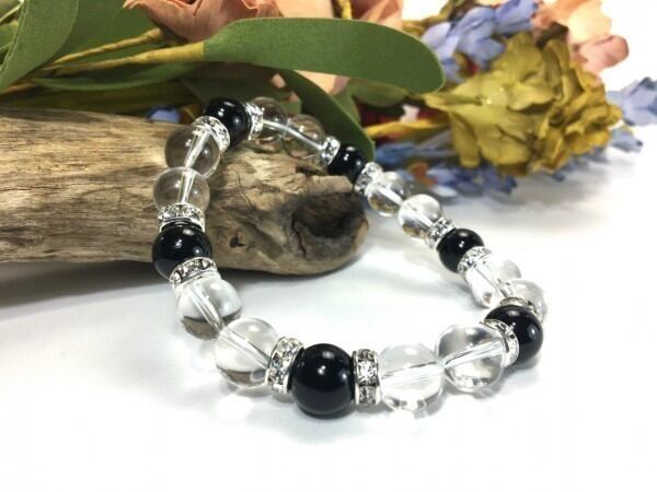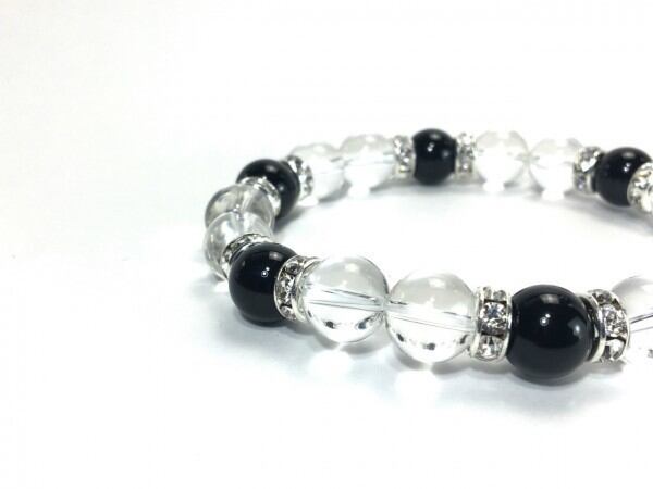 こちらは、水晶とオニキスを組み合わせたブレスレットです。間にはロンデルを挟み高級感あるデザインに仕上がっています。石大きさは腕にも馴染みやすいように10mm玉で内周約17cm(伸可能)です。数に限りがございますので気になる方はお早めにどうぞ。