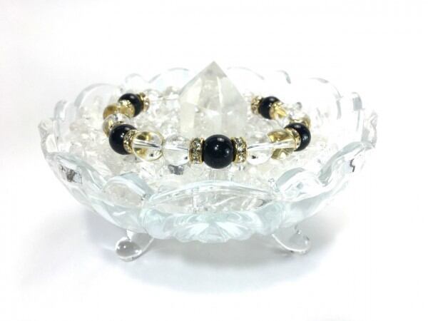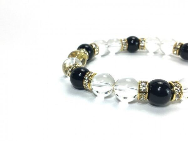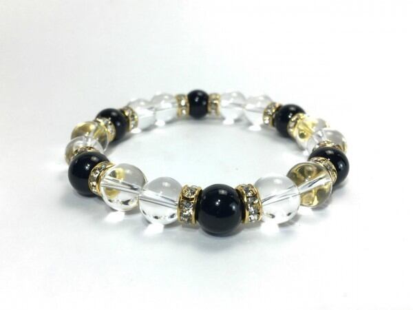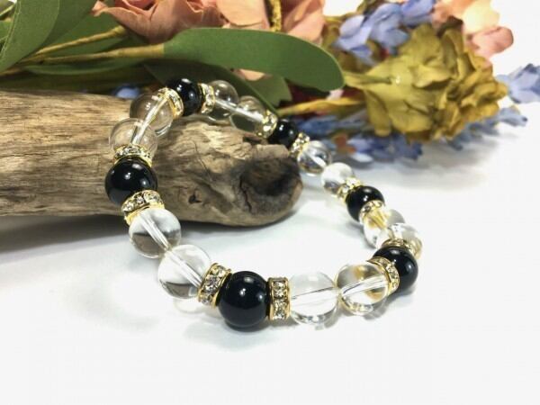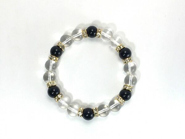 こちらは、水晶とオニキスを組み合わせたブレスレットです。間にはロンデルを挟み高級感あるデザインに仕上がっています。石大きさは腕にも馴染みやすいように10mm玉で内周約17cm(伸可能)です。数に限りがございますので気になる方はお早めにどうぞ。