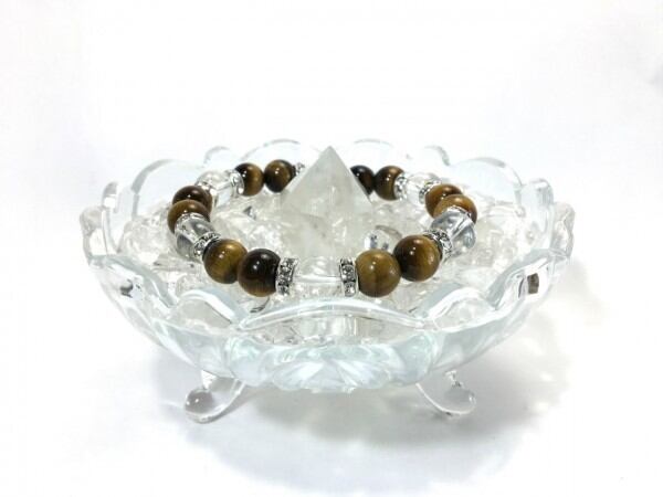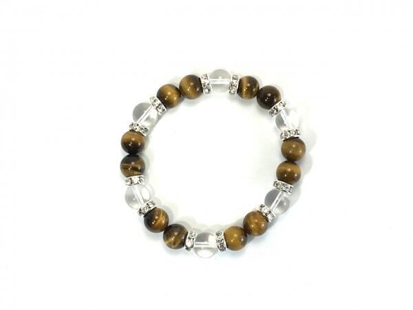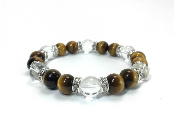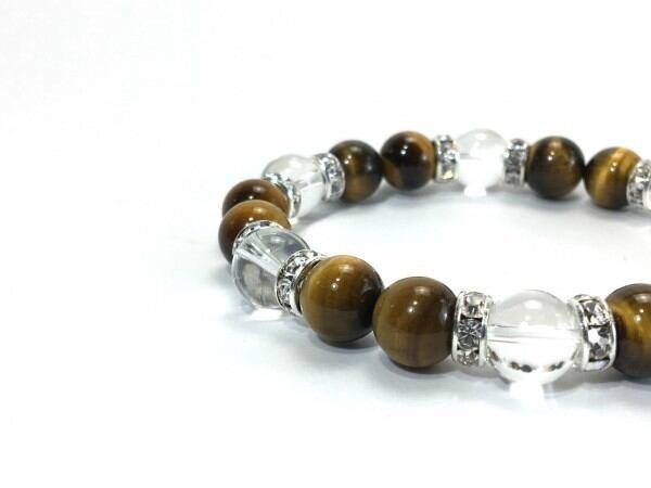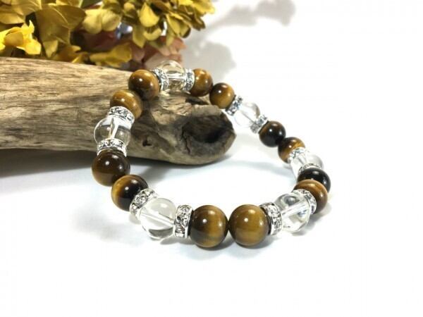 こちらは、タイガーアイと水晶を組み合わせたブレスレットです。間にはロンデルを挟み高級感あるデザインに仕上がっています。石大きさは腕にも馴染みやすいように10mm玉で内周約17cm(伸可能)です。数に限りがございますので気になる方はお早めにどうぞ。