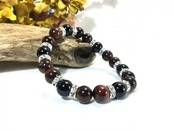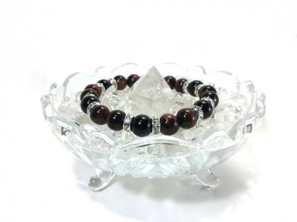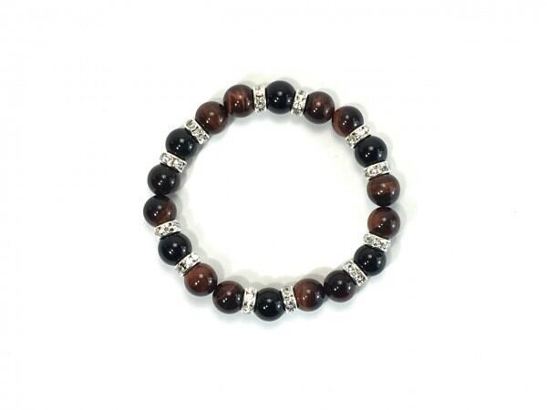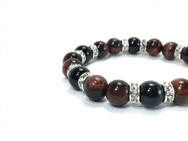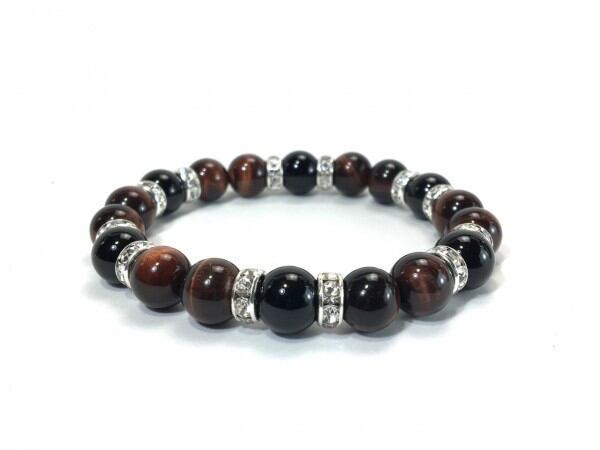 こちらは、レッドタイガーアイとオニキスを組み合わせたブレスレットです。間にはロンデルを挟み高級感あるデザインに仕上がっています。石大きさは腕にも馴染みやすいように10mm玉で内周約17cm(伸可能)です。数に限りがございますので気になる方はお早めにどうぞ。
