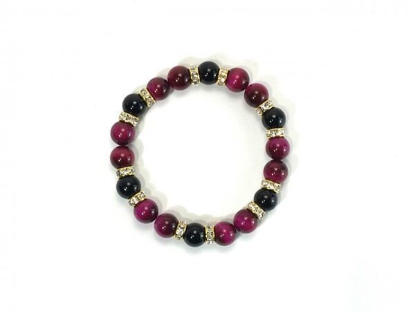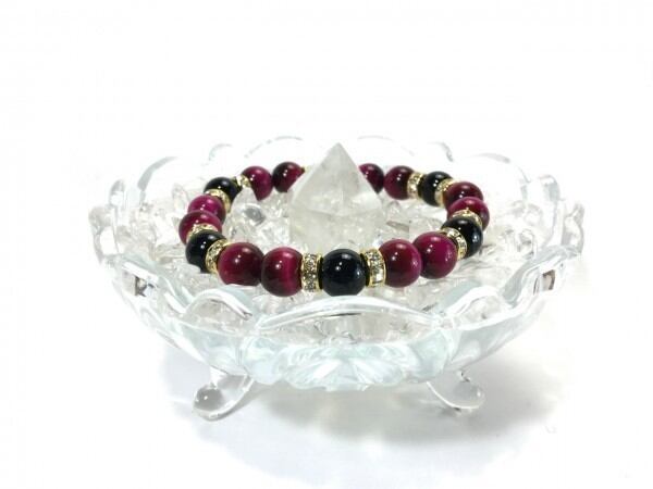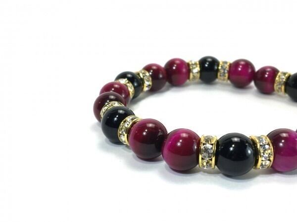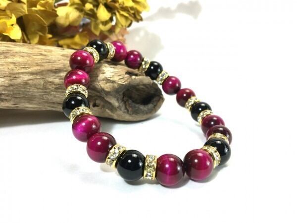 こちらは、ピンクタイガーアイとオニキスを組み合わせたブレスレットです。間にはロンデルを挟み高級感あるデザインに仕上がっています。石大きさは腕にも馴染みやすいように10mm玉で内周約17cm(伸可能)です。数に限りがございますので気になる方はお早めにどうぞ。