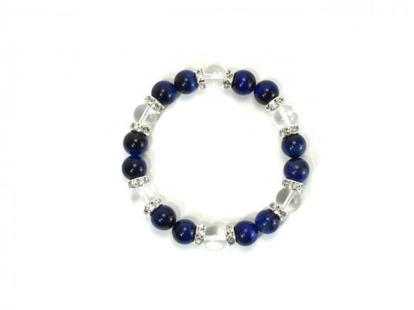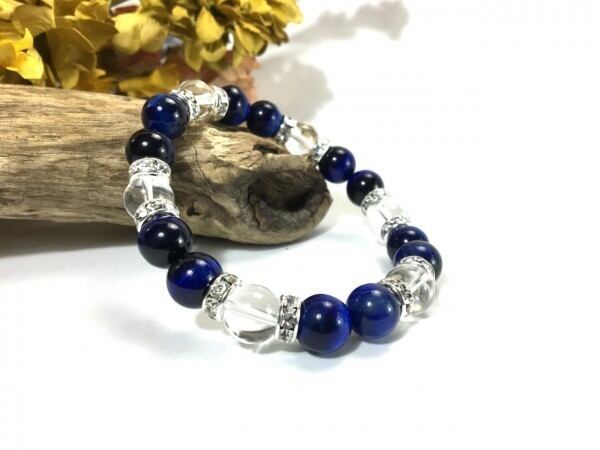 こちらは、ブルータイガーアイと水晶を組み合わせたブレスレットです。間にはロンデルを挟み高級感あるデザインに仕上がっています。石大きさは腕にも馴染みやすいように10mm玉で内周約17cm(伸可能)です。数に限りがございますので気になる方はお早めにどうぞ。