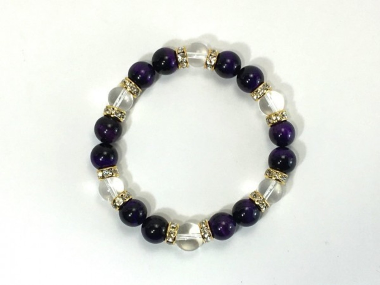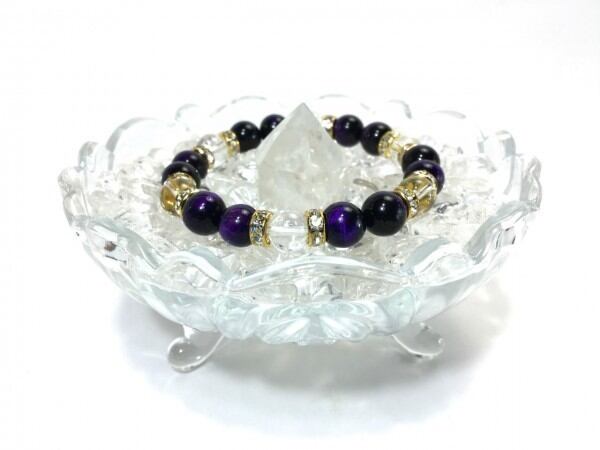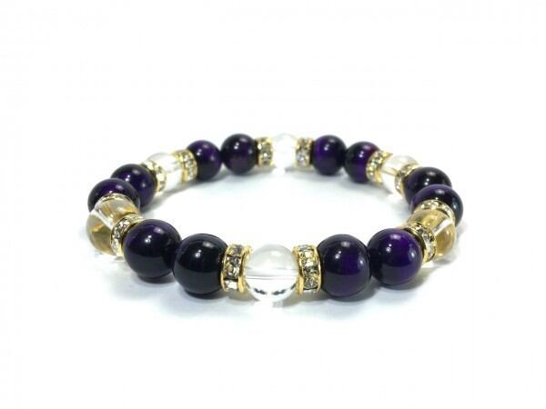 こちらは、パープルタイガーアイと水晶を組み合わせたブレスレットです。間にはロンデルを挟み高級感あるデザインに仕上がっています。石大きさは腕にも馴染みやすいように10mm玉で内周約17cm(伸可能)です。数に限りがございますので気になる方はお早めにどうぞ。