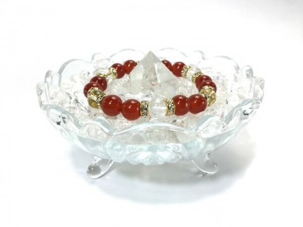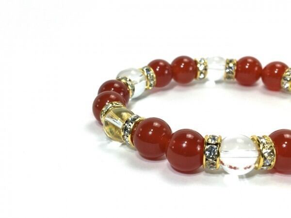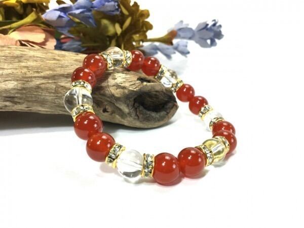 こちらは、赤瑪瑙と水晶を組み合わせたブレスレットです。間にはロンデルを挟み高級感あるデザインに仕上がっています。石大きさは腕にも馴染みやすいように10mm玉で内周約17cm(伸可能)です。数に限りがございますので気になる方はお早めにどうぞ。