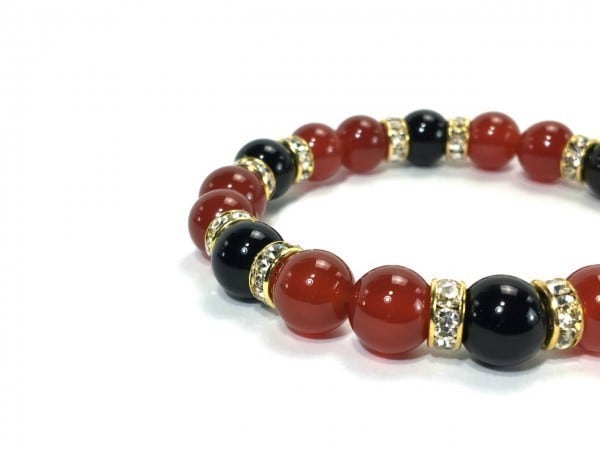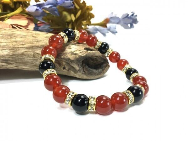 こちらは、赤瑪瑙とオニキスを組み合わせたブレスレットです。間にはロンデルを挟み高級感あるデザインに仕上がっています。石大きさは腕にも馴染みやすいように10mm玉で内周約17cm(伸可能)です。数に限りがございますので気になる方はお早めにどうぞ。