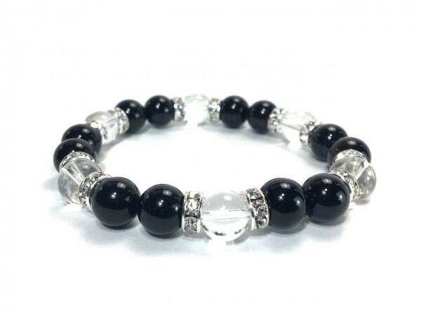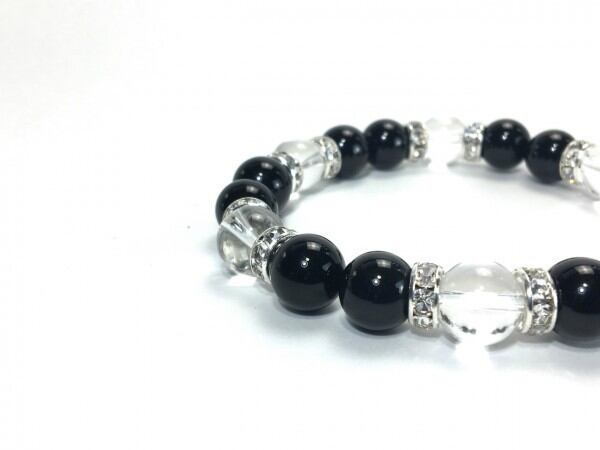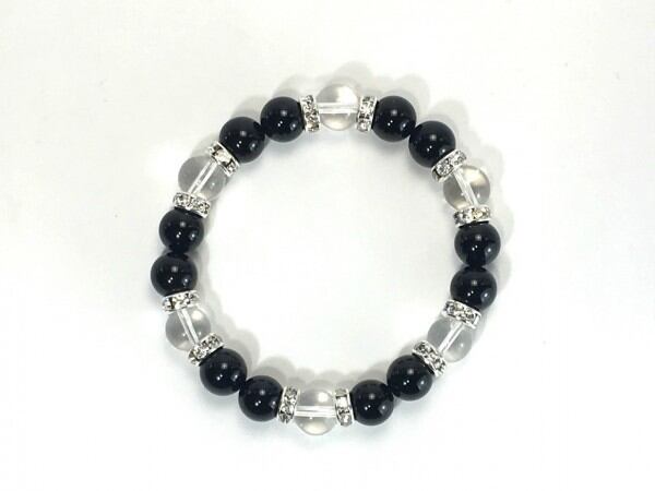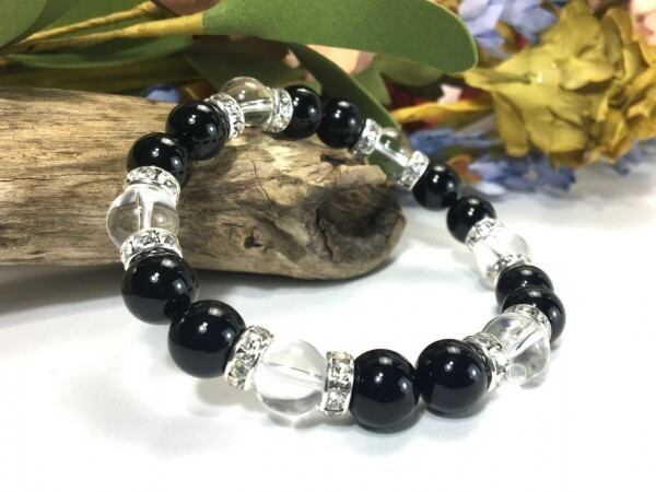 こちらは、オニキスと水晶を組み合わせたブレスレットです。間にはロンデルを挟み高級感あるデザインに仕上がっています。石大きさは腕にも馴染みやすいように10mm玉で内周約17cm(伸可能)です。数に限りがございますので気になる方はお早めにどうぞ。