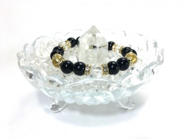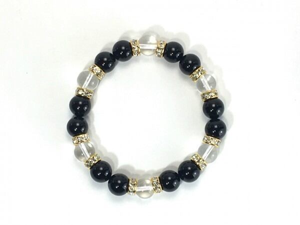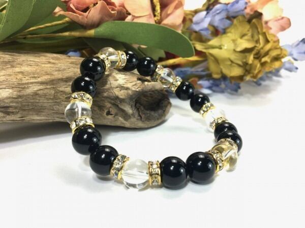 こちらは、オニキスと水晶を組み合わせたブレスレットです。間にはロンデルを挟み高級感あるデザインに仕上がっています。石大きさは腕にも馴染みやすいように10mm玉で内周約17cm(伸可能)です。数に限りがございますので気になる方はお早めにどうぞ。