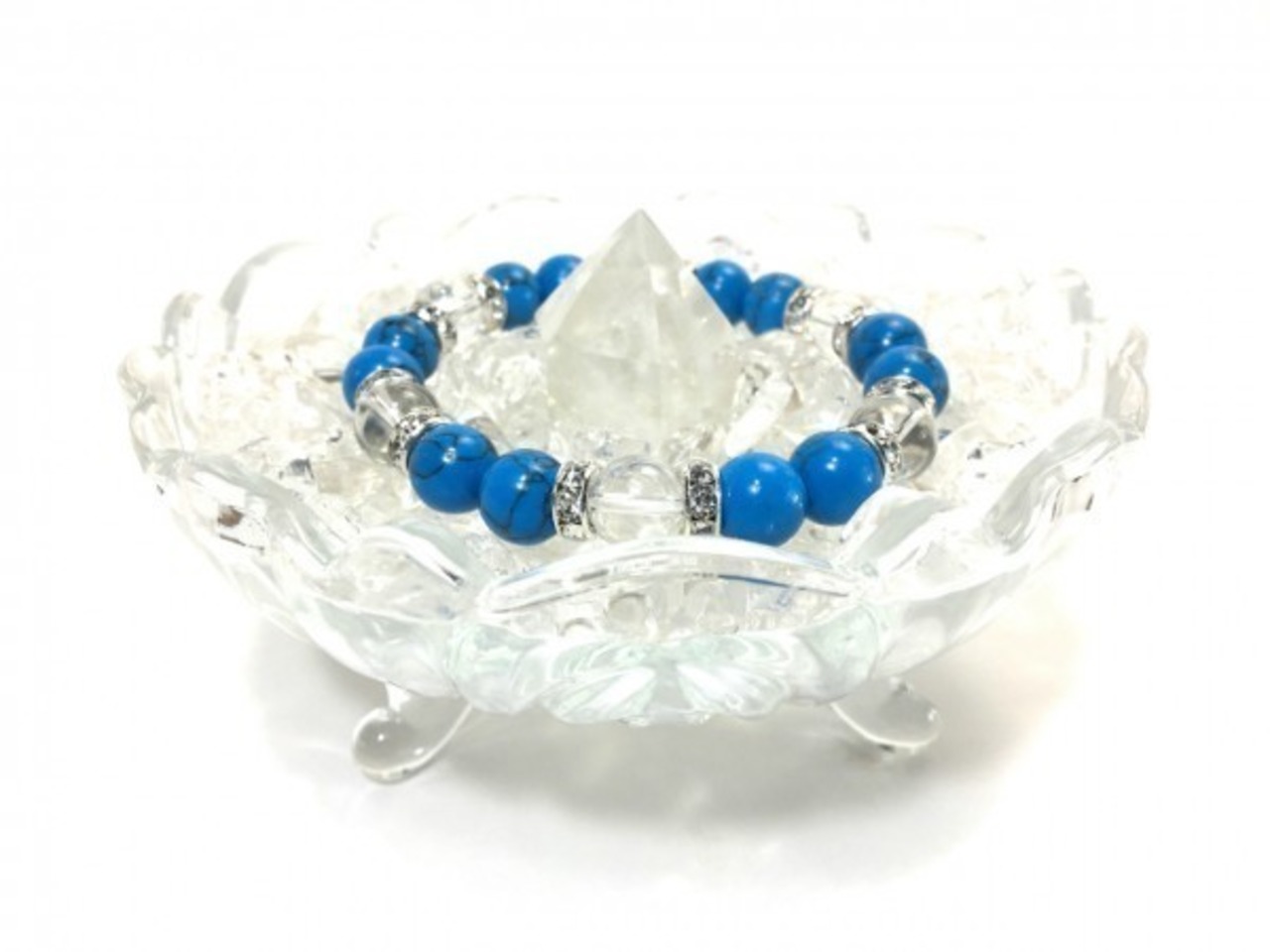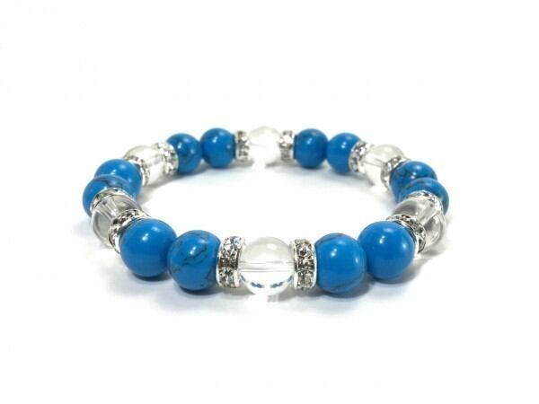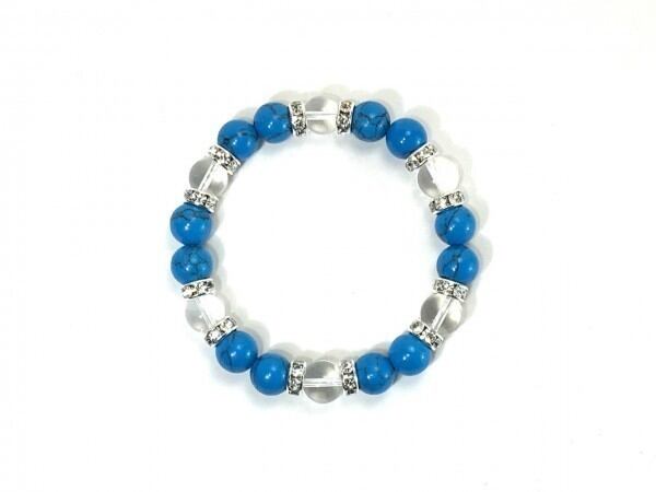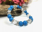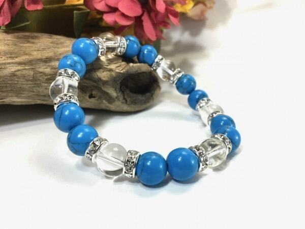 こちらは、ターコイズと水晶を組み合わせたブレスレットです。間にはロンデルを挟み高級感あるデザインに仕上がっています。石大きさは腕にも馴染みやすいように10mm玉で内周約17cm(伸可能)です。数に限りがございますので気になる方はお早めにどうぞ。