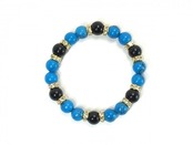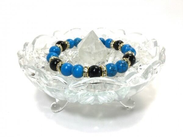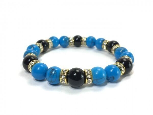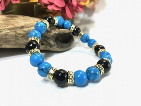 こちらは、ターコイズとオニキスを組み合わせたブレスレットです。間にはロンデルを挟み高級感あるデザインに仕上がっています。石大きさは腕にも馴染みやすいように10mm玉で内周約17cm(伸可能)です。数に限りがございますので気になる方はお早めにどうぞ。