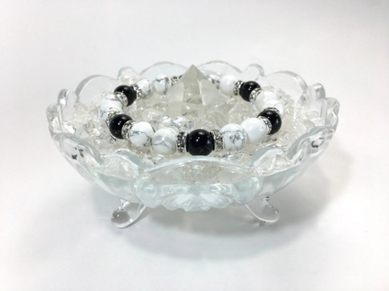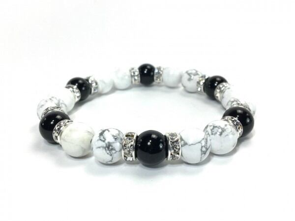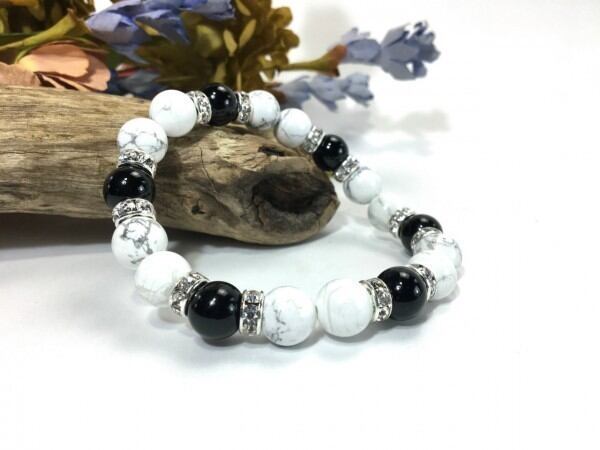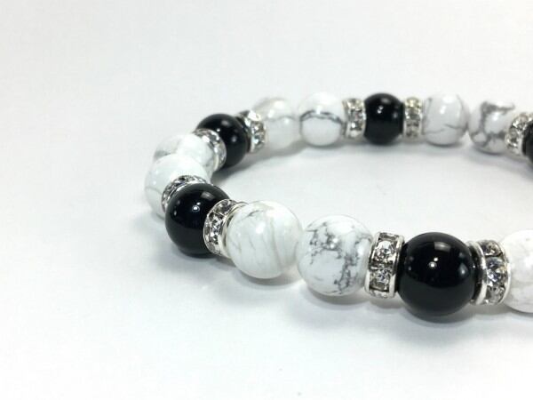 こちらは、ハウライトとオニキスを組み合わせたブレスレットです。間にはロンデルを挟み高級感あるデザインに仕上がっています。石大きさは腕にも馴染みやすいように10mm玉で内周約17cm(伸可能)です。数に限りがございますので気になる方はお早めにどうぞ。