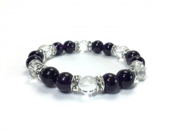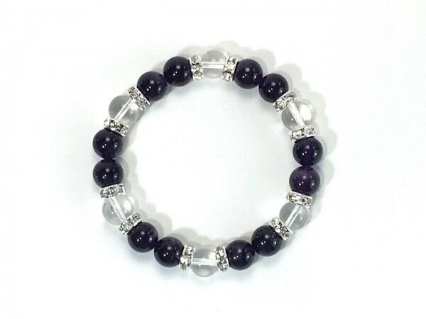 こちらは、アメジストと水晶を組み合わせたブレスレットです。間にはロンデルを挟み高級感あるデザインに仕上がっています。石大きさは腕にも馴染みやすいように10mm玉で内周約17cm(伸可能)です。数に限りがございますので気になる方はお早めにどうぞ。