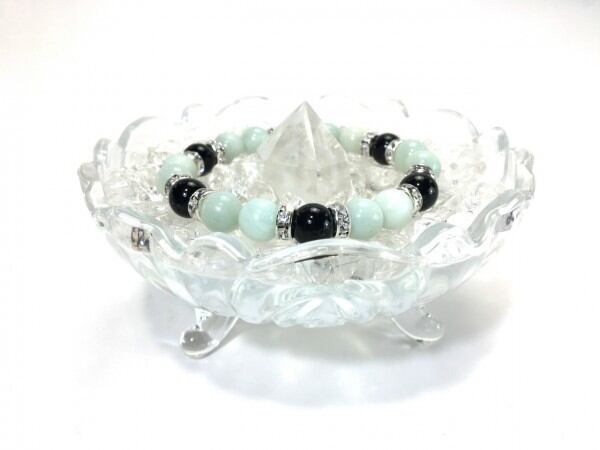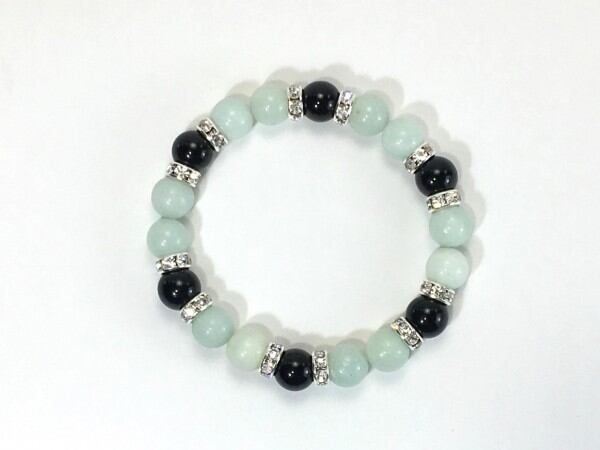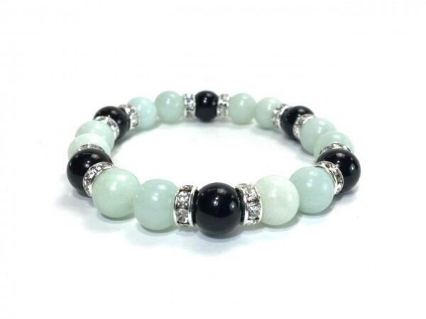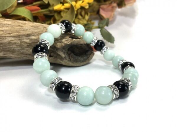 こちらは、アマゾナイトとオニキスを組み合わせたブレスレットです。間にはロンデルを挟み高級感あるデザインに仕上がっています。石大きさは腕にも馴染みやすいように10mm玉で内周約17cm(伸可能)です。数に限りがございますので気になる方はお早めにどうぞ。