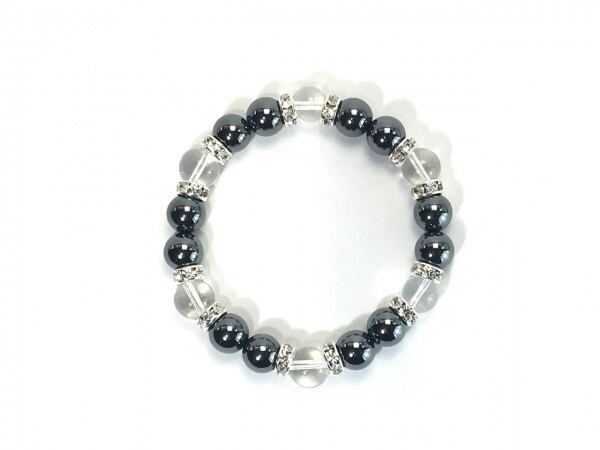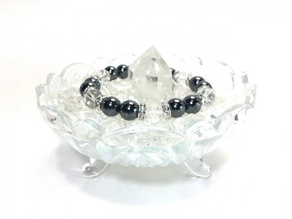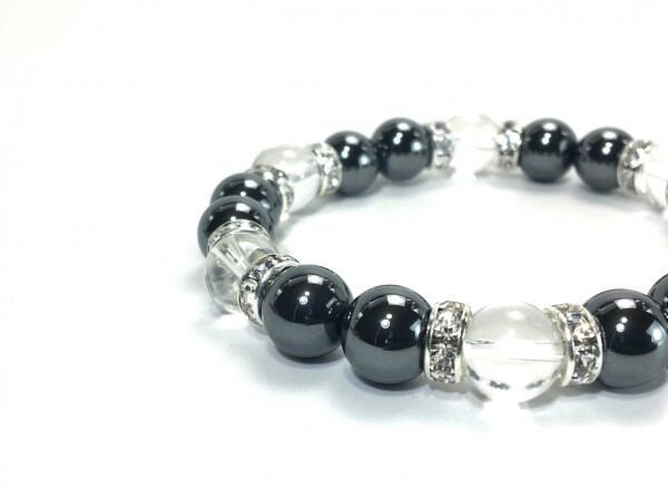 こちらは、ヘマタイトと水晶を組み合わせたブレスレットです。間にはロンデルを挟み高級感あるデザインに仕上がっています。石大きさは腕にも馴染みやすいように10mm玉で内周約17cm(伸可能)です。数に限りがございますので気になる方はお早めにどうぞ。