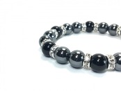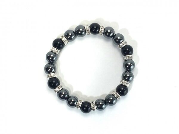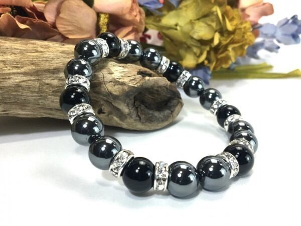 こちらは、ヘマタイトとオニキスを組み合わせたブレスレットです。間にはロンデルを挟み高級感あるデザインに仕上がっています。石大きさは腕にも馴染みやすいように10mm玉で内周約17cm(伸可能)です。数に限りがございますので気になる方はお早めにどうぞ。