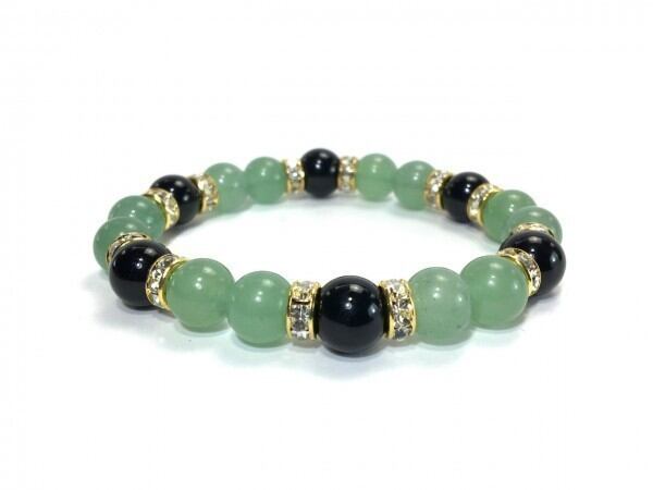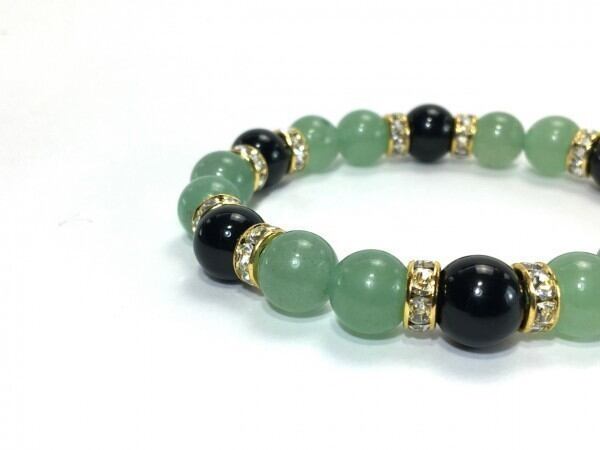 こちらは、アベンチュリンとオニキスを組み合わせたブレスレットです。間にはロンデルを挟み高級感あるデザインに仕上がっています。石大きさは腕にも馴染みやすいように10mm玉で内周約17cm(伸可能)です。数に限りがございますので気になる方はお早めにどうぞ。