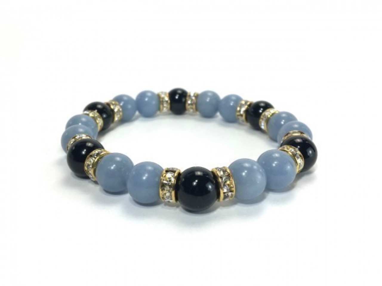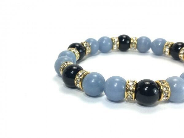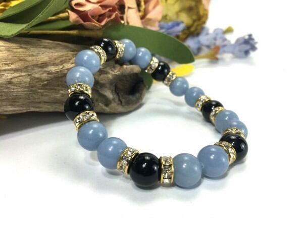 こちらは、エンジェライトとオニキスを組み合わせたブレスレットです。間にはロンデルを挟み高級感あるデザインに仕上がっています。石大きさは腕にも馴染みやすいように10mm玉で内周約17cm(伸可能)です。数に限りがございますので気になる方はお早めにどうぞ。