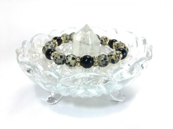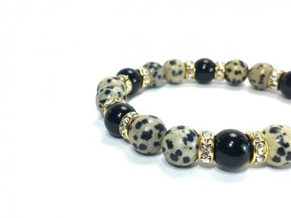 こちらは、ダルメシアンジャスパーとオニキスを組み合わせたブレスレットです。間にはロンデルを挟み高級感あるデザインに仕上がっています。石大きさは腕にも馴染みやすいように10mm玉で内周約17cm(伸可能)です。数に限りがございますので気になる方はお早めにどうぞ。