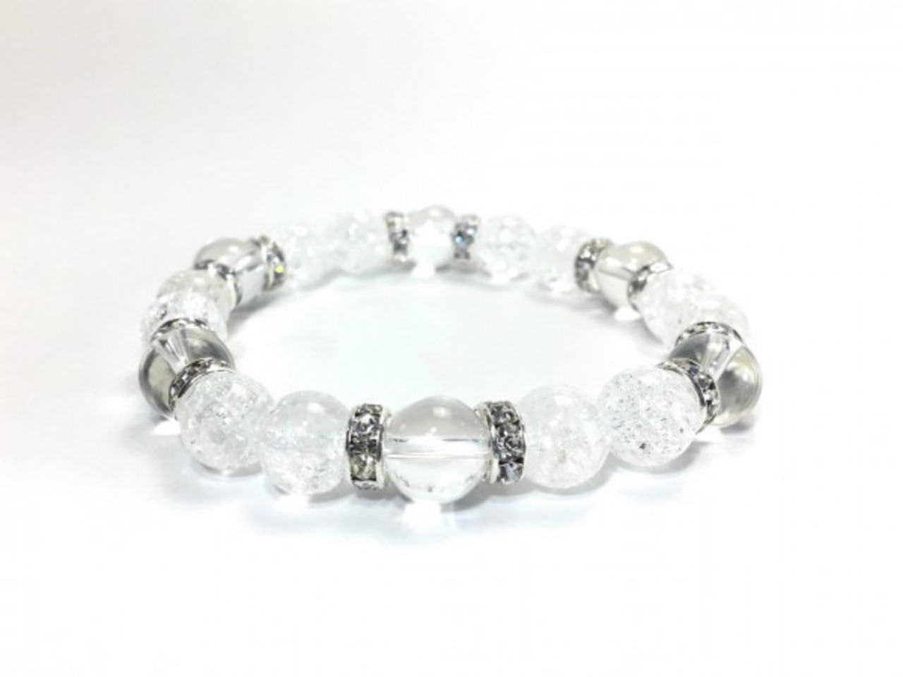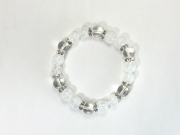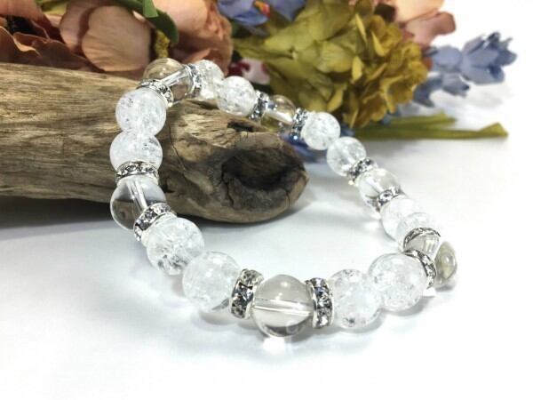 こちらは、クラック水晶と水晶を組み合わせたブレスレットです。間にはロンデルを挟み高級感あるデザインに仕上がっています。石大きさは腕にも馴染みやすいように10mm玉で内周約17cm(伸可能)です。数に限りがございますので気になる方はお早めにどうぞ。