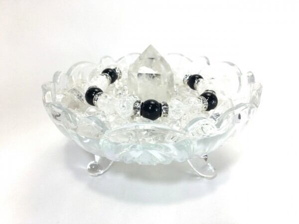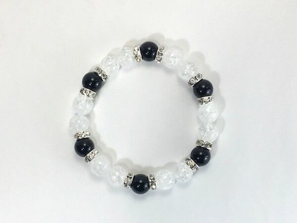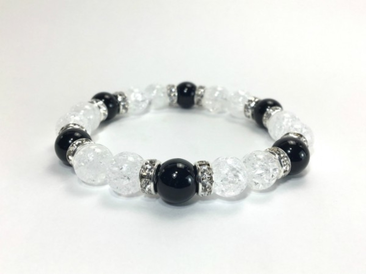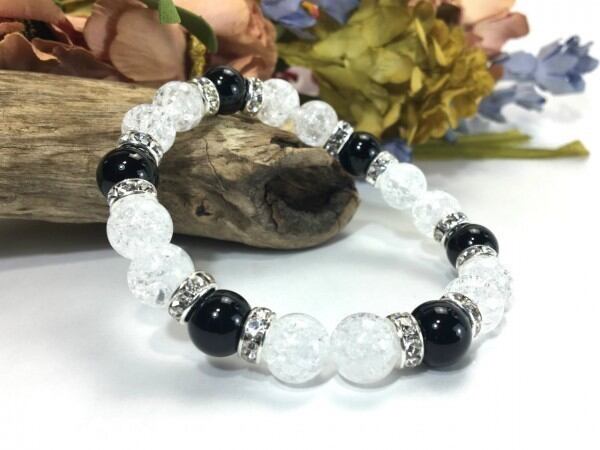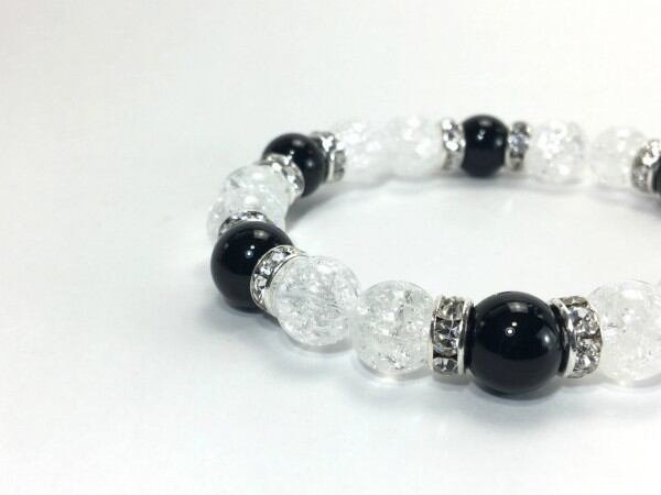 こちらは、クラック水晶とオニキスを組み合わせたブレスレットです。間にはロンデルを挟み高級感あるデザインに仕上がっています。石大きさは腕にも馴染みやすいように10mm玉で内周約17cm(伸可能)です。数に限りがございますので気になる方はお早めにどうぞ。