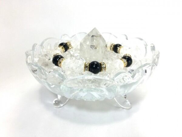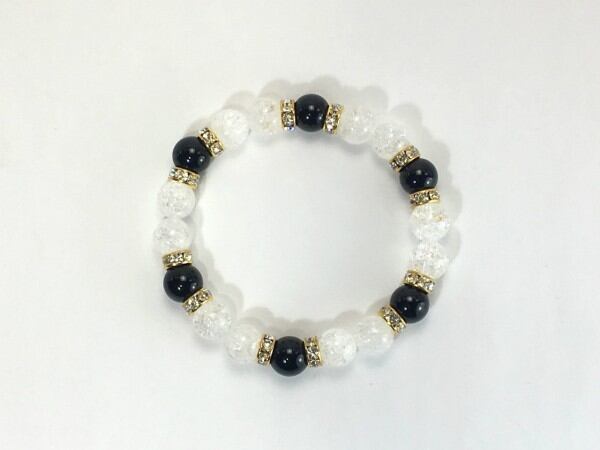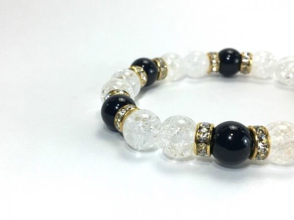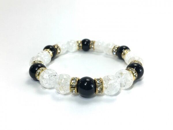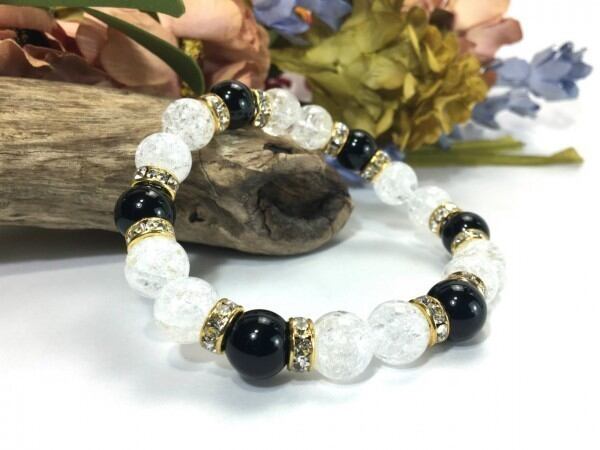 こちらは、クラック水晶とオニキスを組み合わせたブレスレットです。間にはロンデルを挟み高級感あるデザインに仕上がっています。石大きさは腕にも馴染みやすいように10mm玉で内周約17cm(伸可能)です。数に限りがございますので気になる方はお早めにどうぞ。