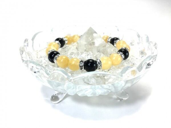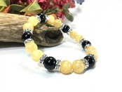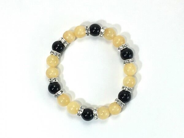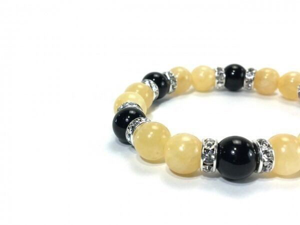 こちらは、アラゴナイトとオニキスを組み合わせたブレスレットです。間にはロンデルを挟み高級感あるデザインに仕上がっています。石大きさは腕にも馴染みやすいように10mm玉で内周約17cm(伸可能)です。数に限りがございますので気になる方はお早めにどうぞ。