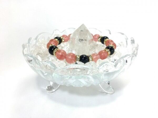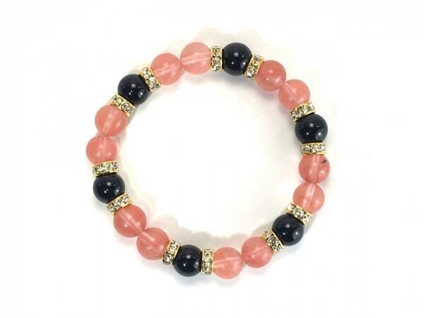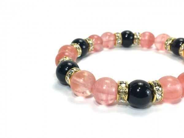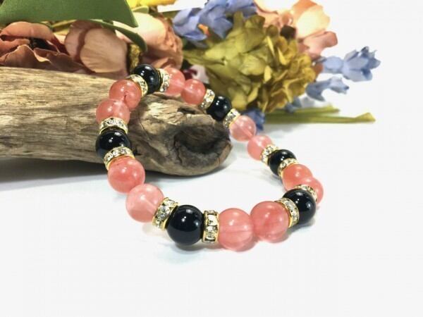 こちらは、チェリークォーツとオニキスを組み合わせたブレスレットです。間にはロンデルを挟み高級感あるデザインに仕上がっています。石大きさは腕にも馴染みやすいように10mm玉で内周約17cm(伸可能)です。数に限りがございますので気になる方はお早めにどうぞ。