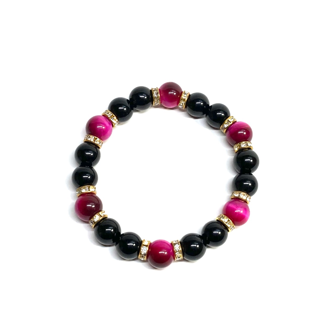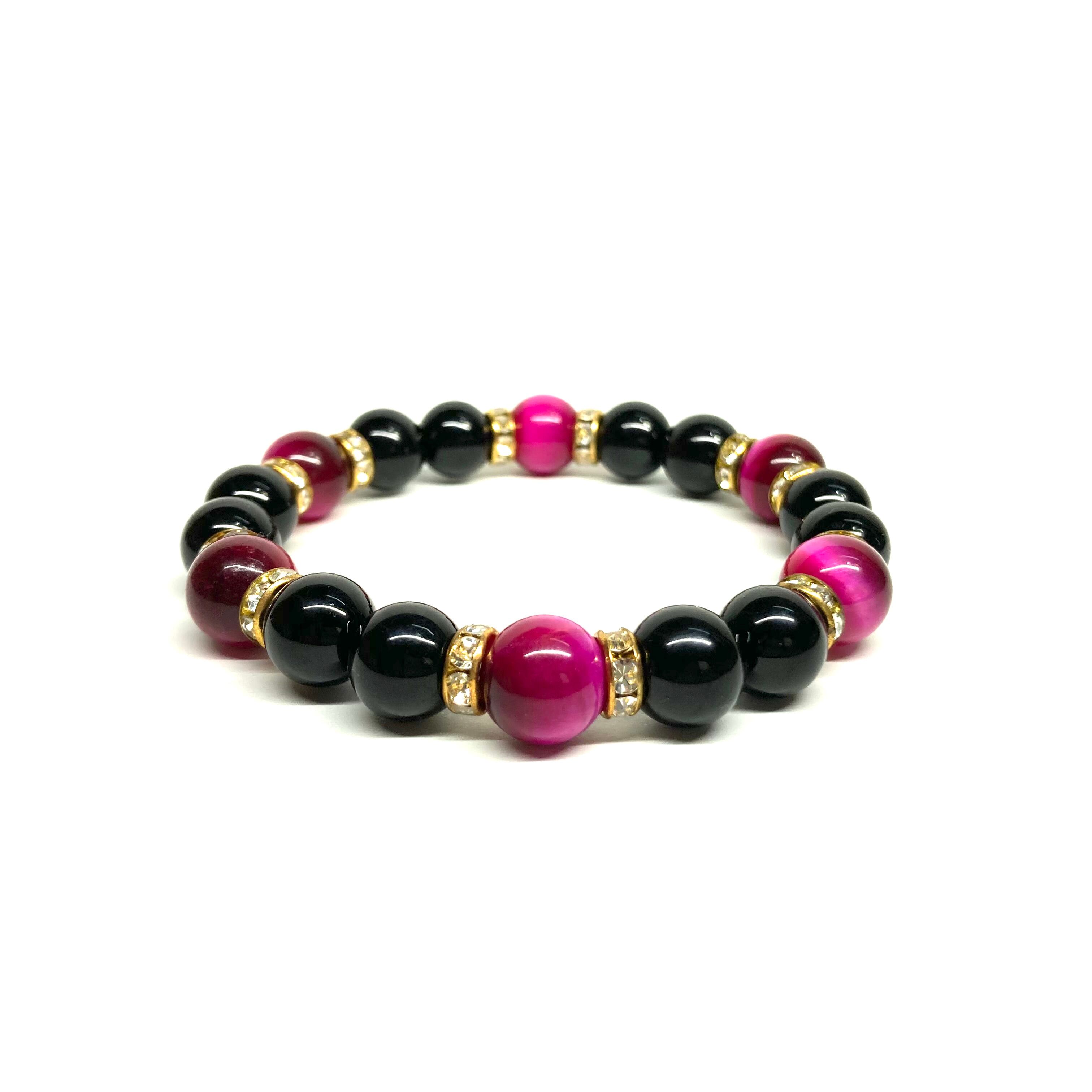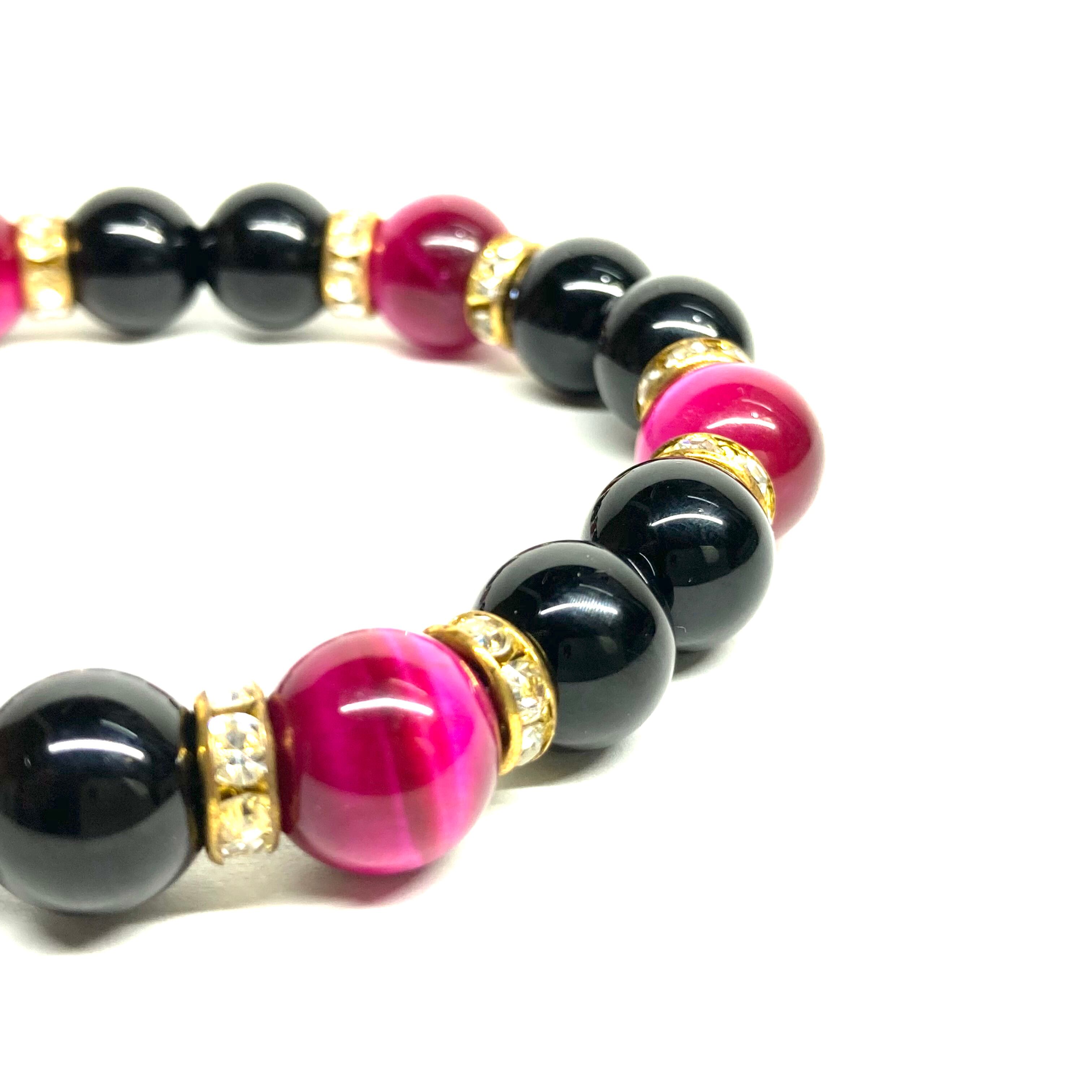 こちらは、モリオンとピンクタイガーアイを組み合わせたパワーストーンブレスレットです。間にはロンデルを挟み高級感あるデザインに仕上げております。石大きさは腕にも馴染みやすいように10mm玉で内径約18cm(伸可能)です。 数に限りがございますので気になる方はお早めにどうぞ。
