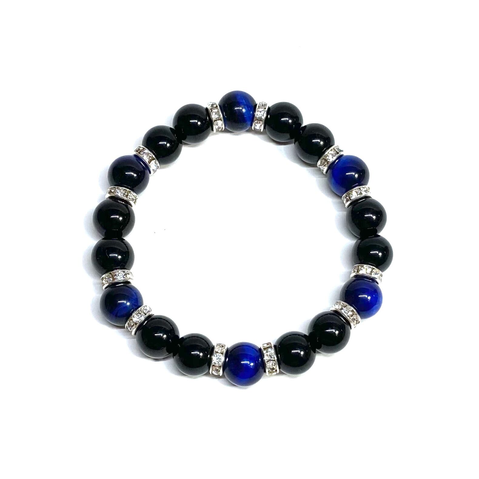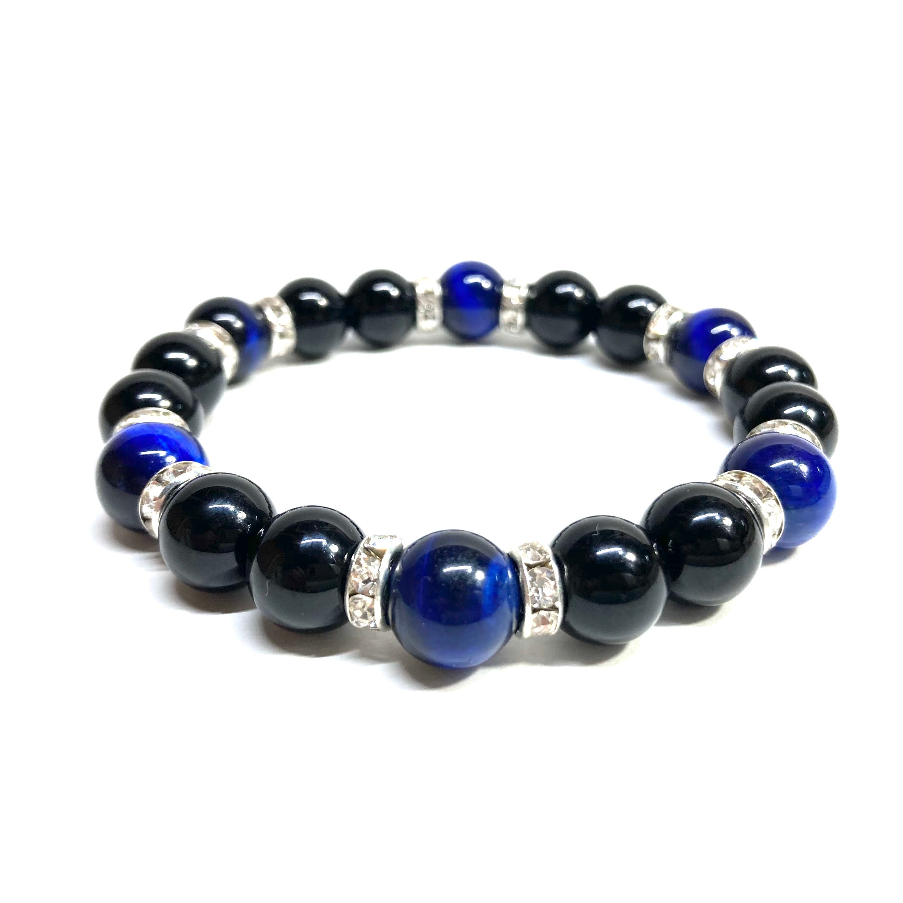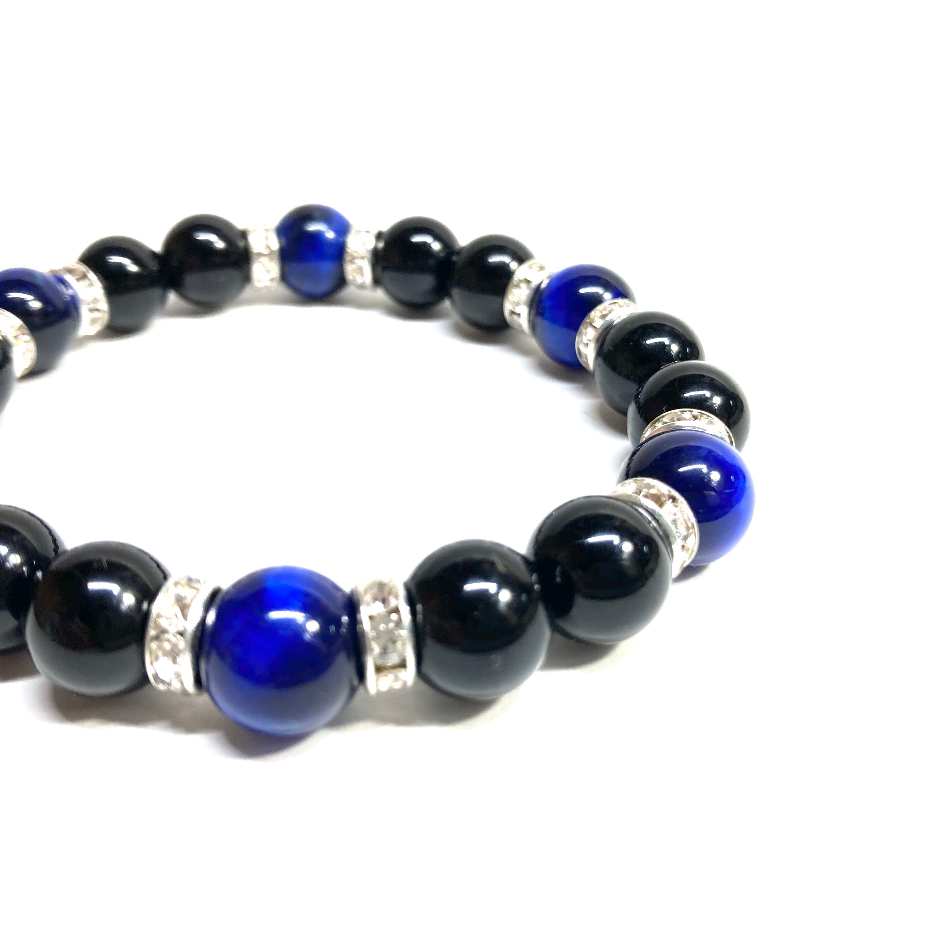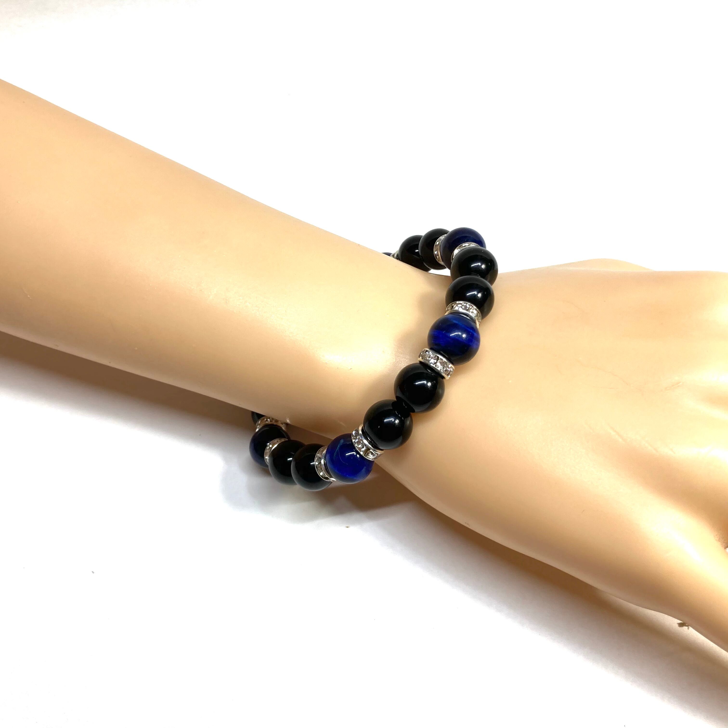 こちらは、モリオンとブルータイガーアイを組み合わせたパワーストーンブレスレットです。間にはロンデルを挟み高級感あるデザインに仕上げております。石大きさは腕にも馴染みやすいように10mm玉で内径約18cm(伸可能)です。 数に限りがございますので気になる方はお早めにどうぞ。