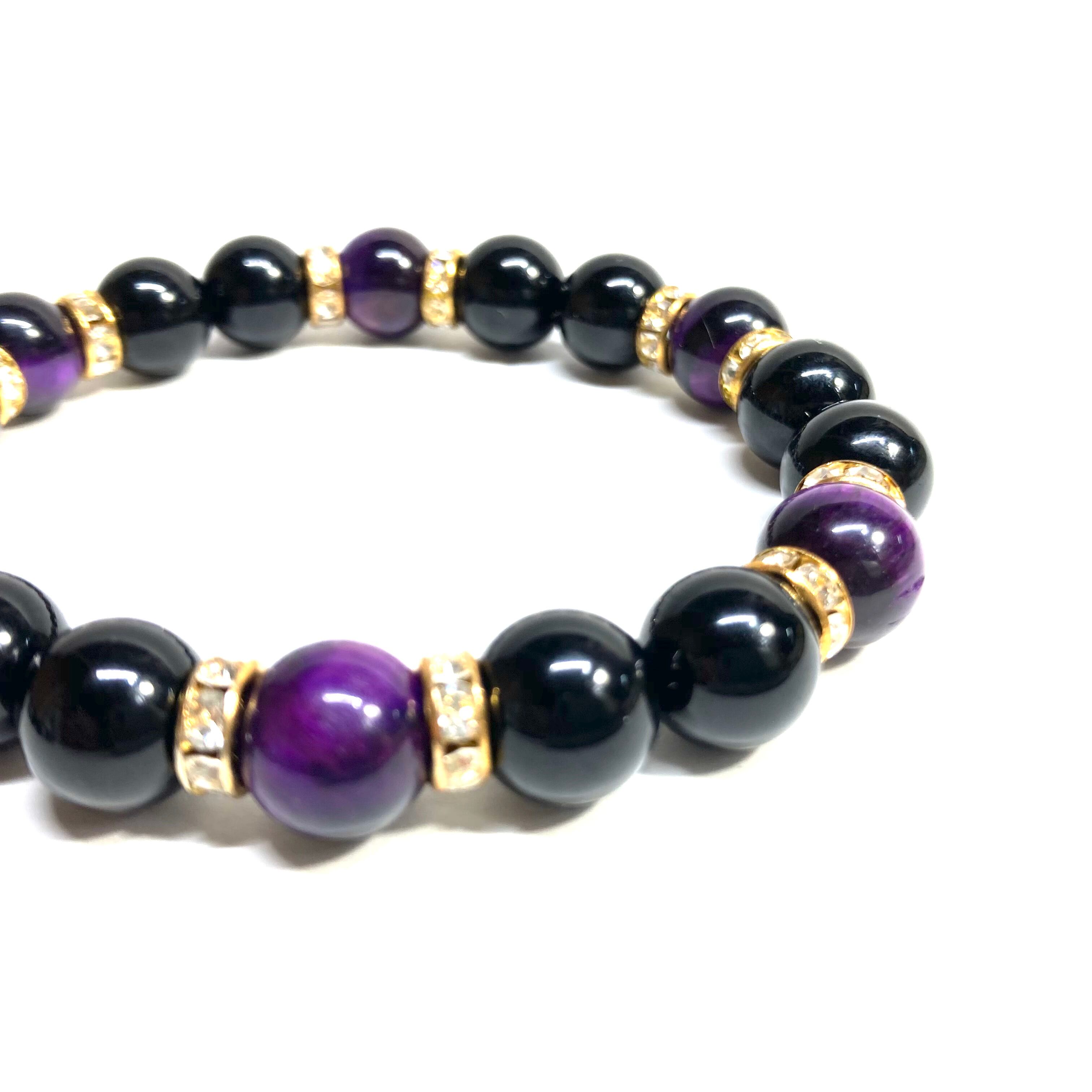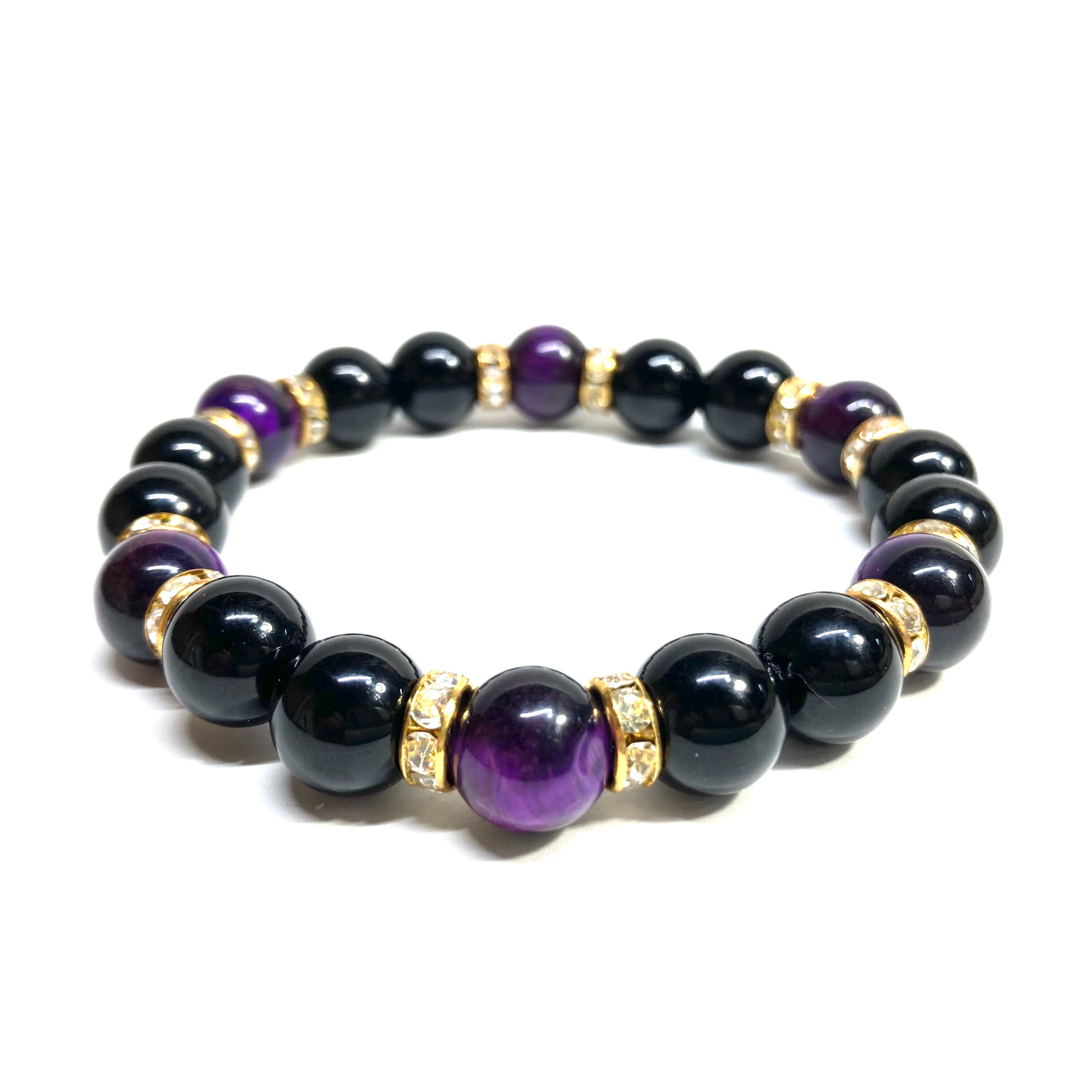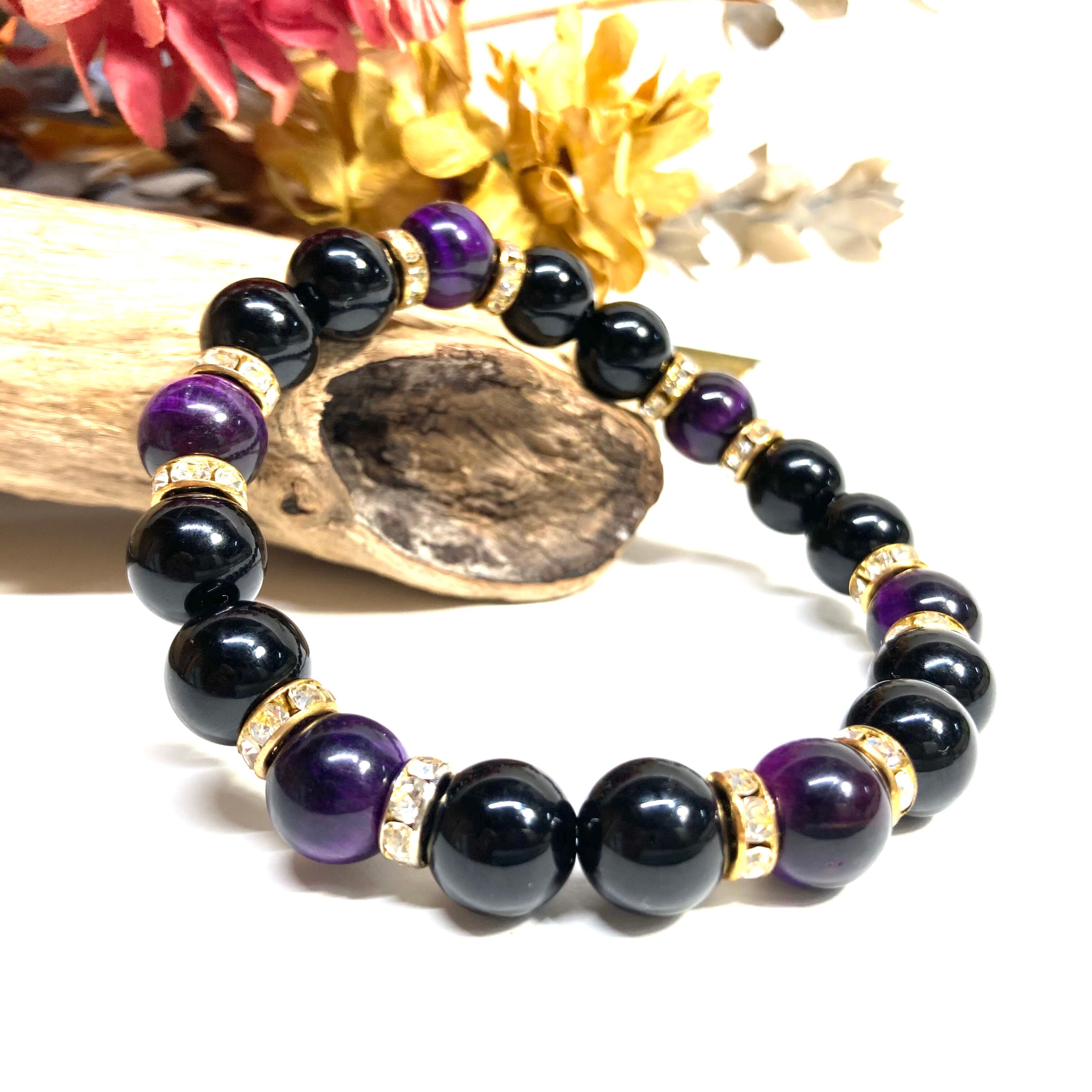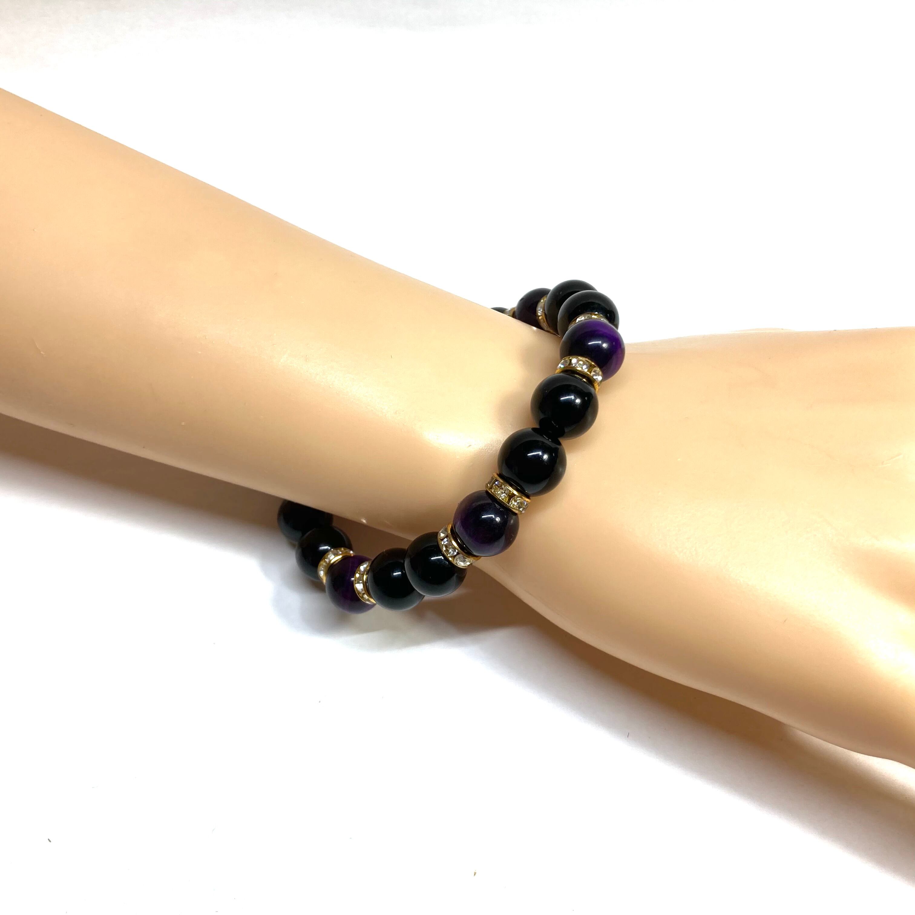 こちらは、モリオンとパープル タイガーアイを組み合わせたパワーストーンブレスレットです。間にはロンデルを挟み高級感あるデザインに仕上げております。石大きさは腕にも馴染みやすいように10mm玉で内径約18cm(伸可能)です。 数に限りがございますので気になる方はお早めにどうぞ。