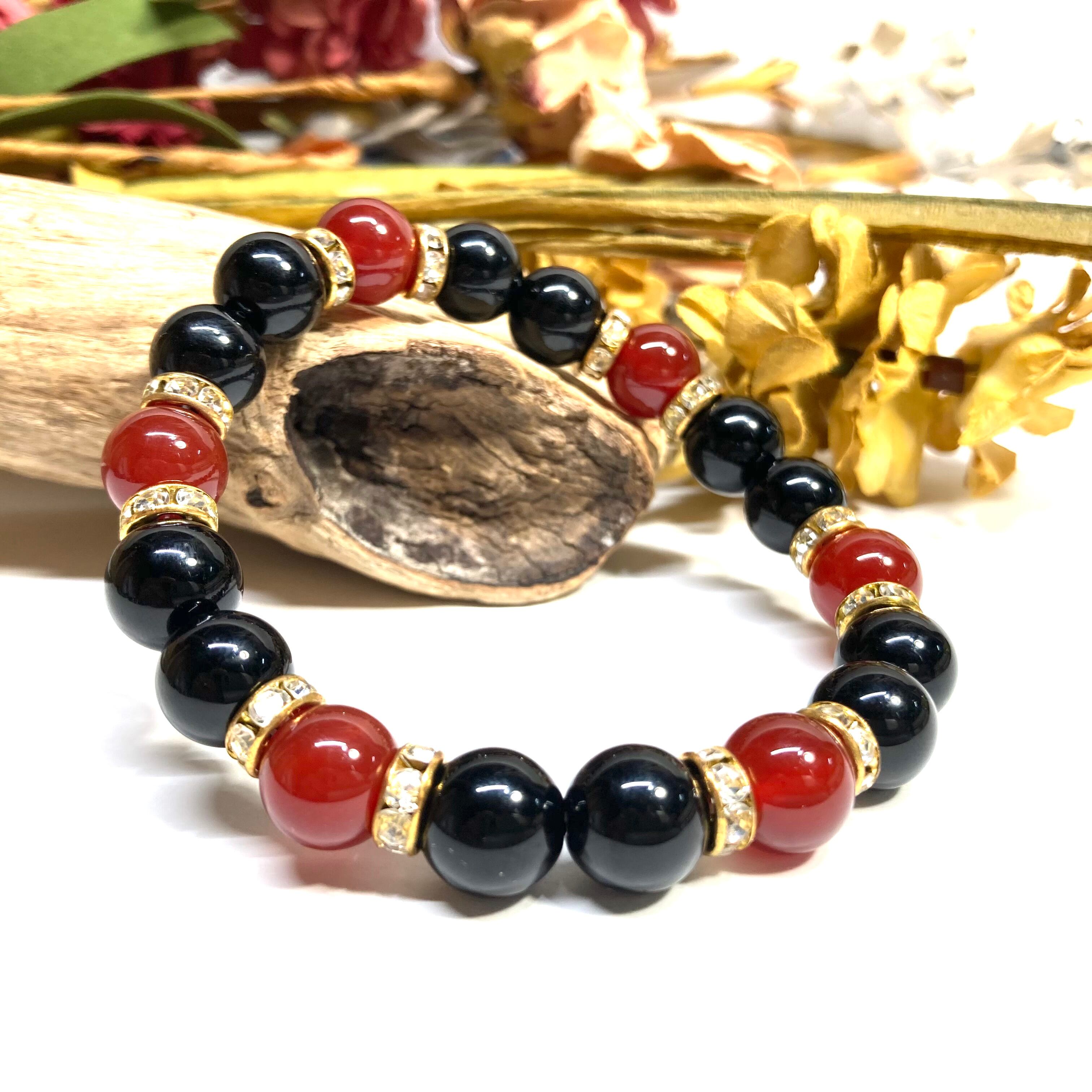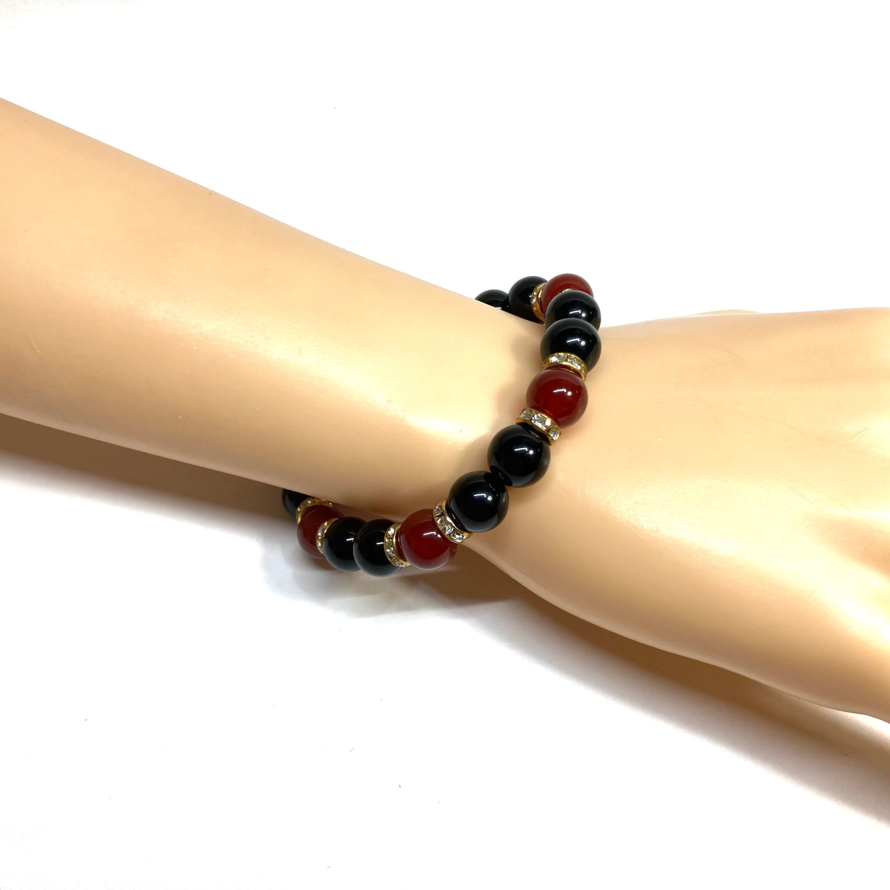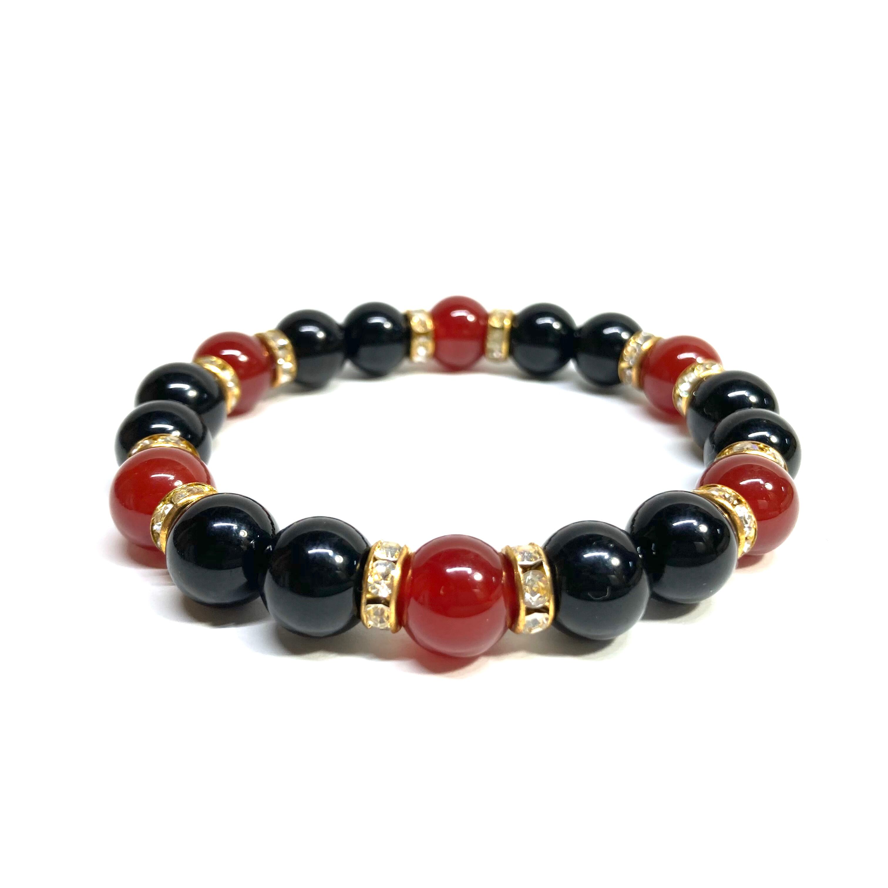 こちらは、モリオンと赤瑪瑙を組み合わせたパワーストーンブレスレットです。間にはロンデルを挟み高級感あるデザインに仕上げております。石大きさは腕にも馴染みやすいように10mm玉で内径約18cm(伸可能)です。 数に限りがございますので気になる方はお早めにどうぞ。