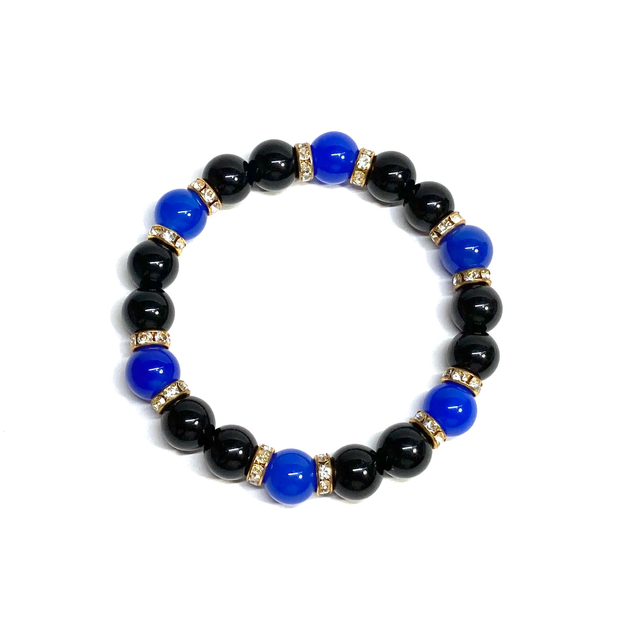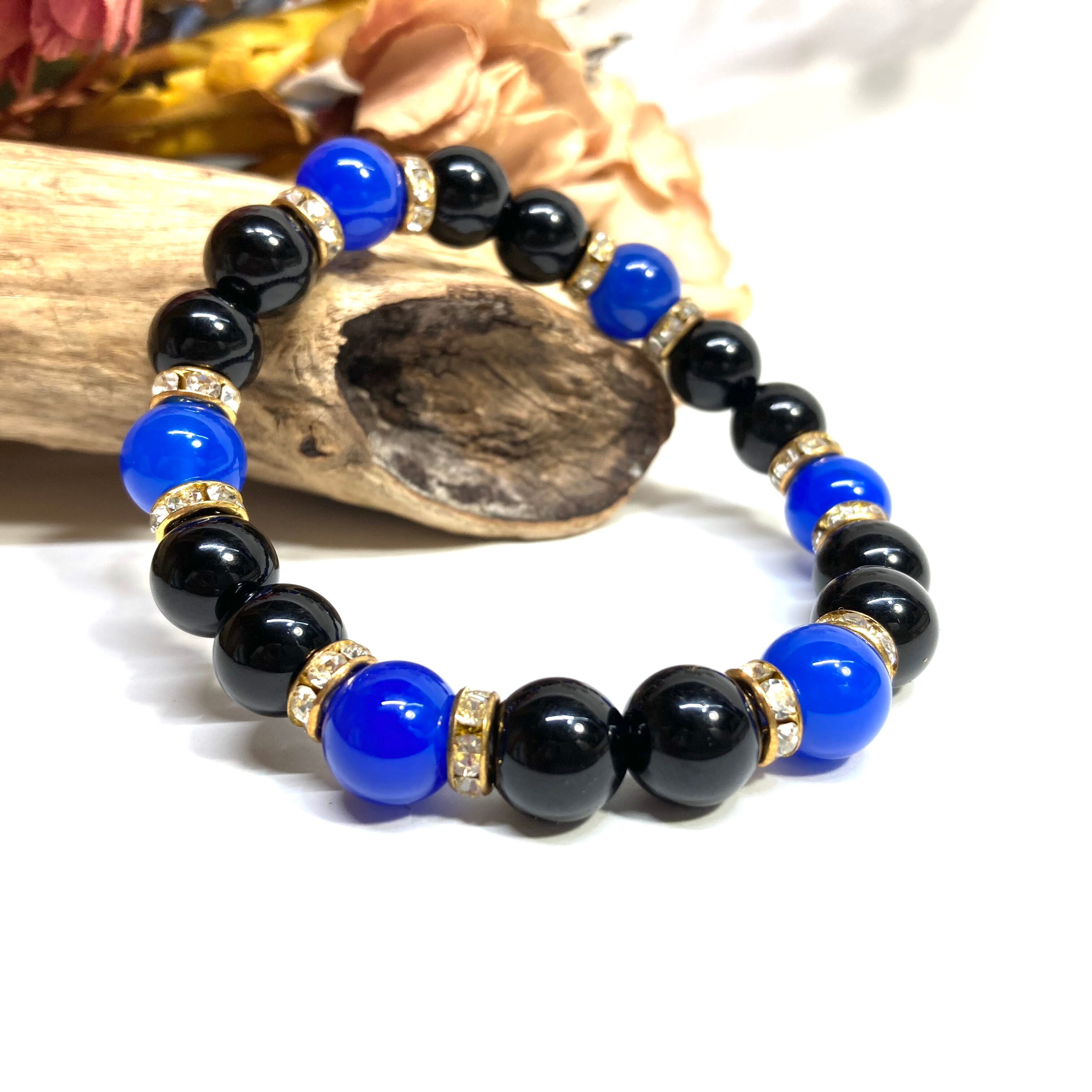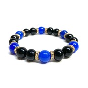 こちらは、モリオンと青瑪瑙を組み合わせたパワーストーンブレスレットです。間にはロンデルを挟み高級感あるデザインに仕上げております。石大きさは腕にも馴染みやすいように10mm玉で内径約18cm(伸可能)です。 数に限りがございますので気になる方はお早めにどうぞ。