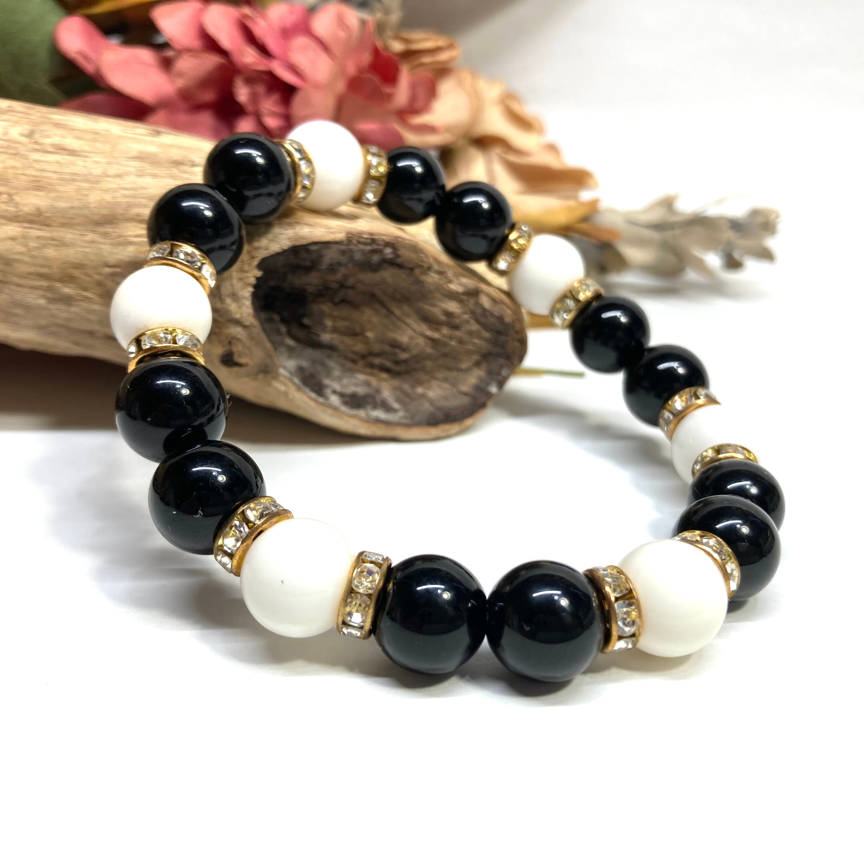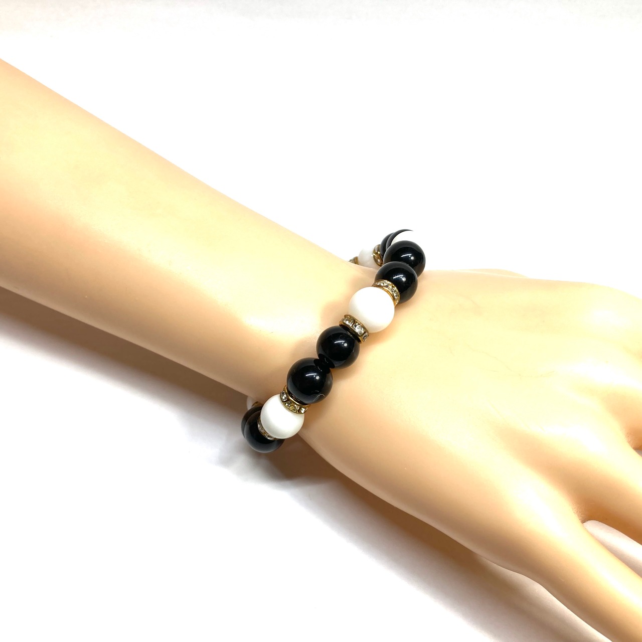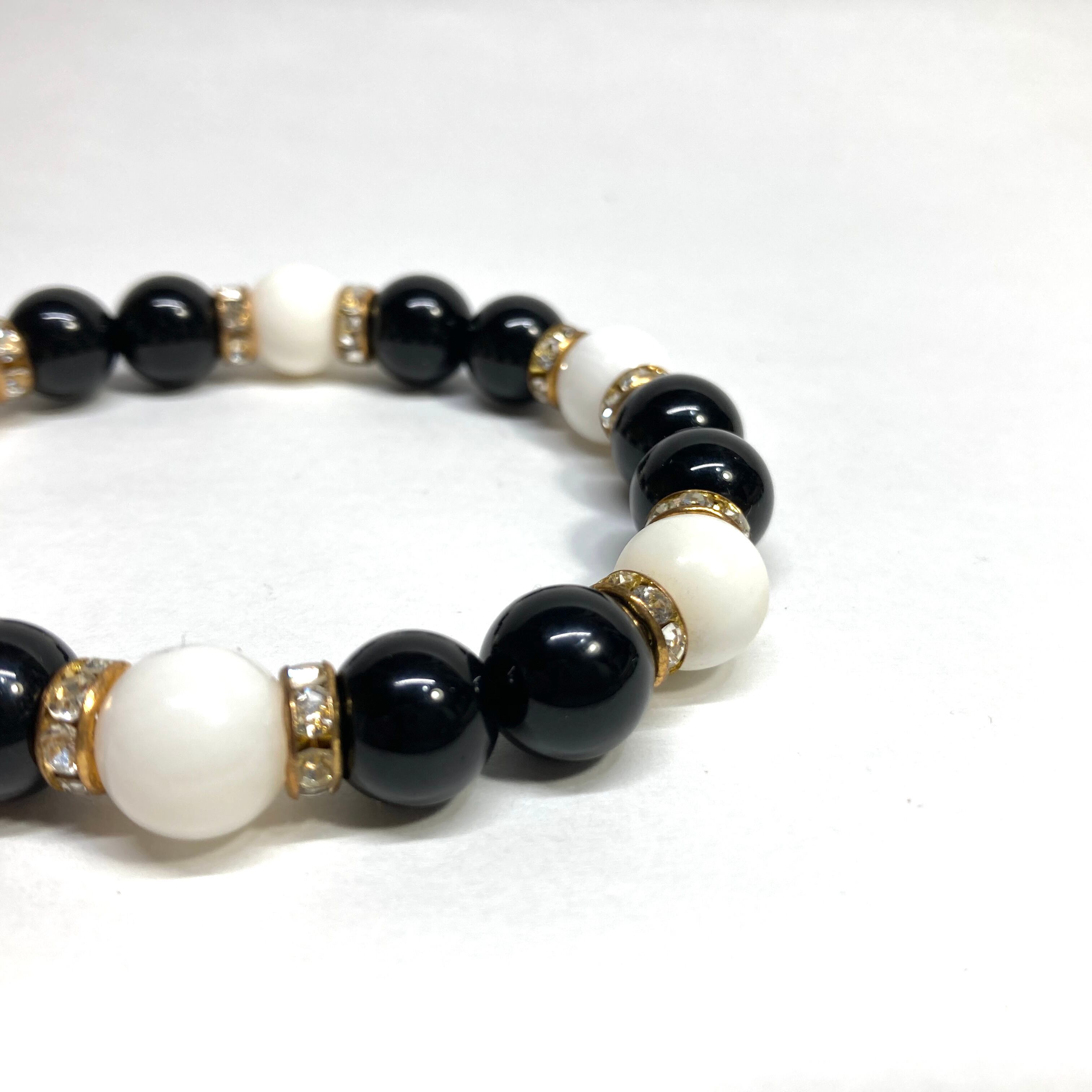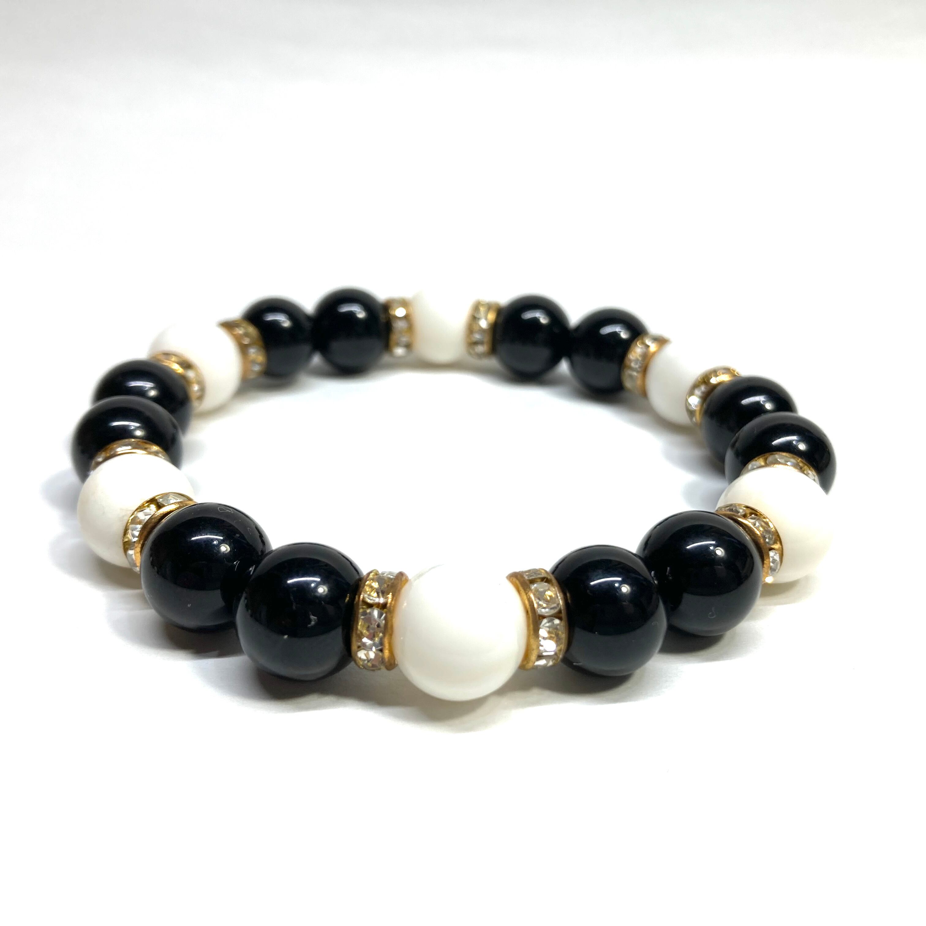 こちらは、モリオンとホワイトオニキスを組み合わせたパワーストーンブレスレットです。間にはロンデルを挟み高級感あるデザインに仕上げております。石大きさは腕にも馴染みやすいように10mm玉で内径約18cm(伸可能)です。 数に限りがございますので気になる方はお早めにどうぞ。