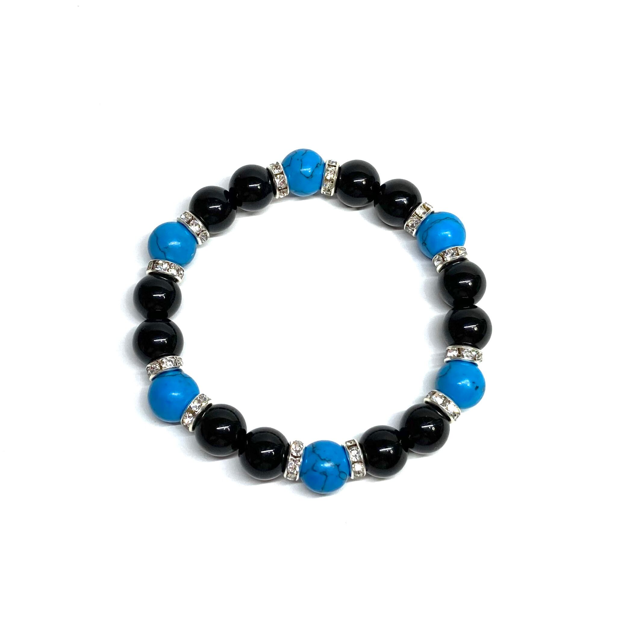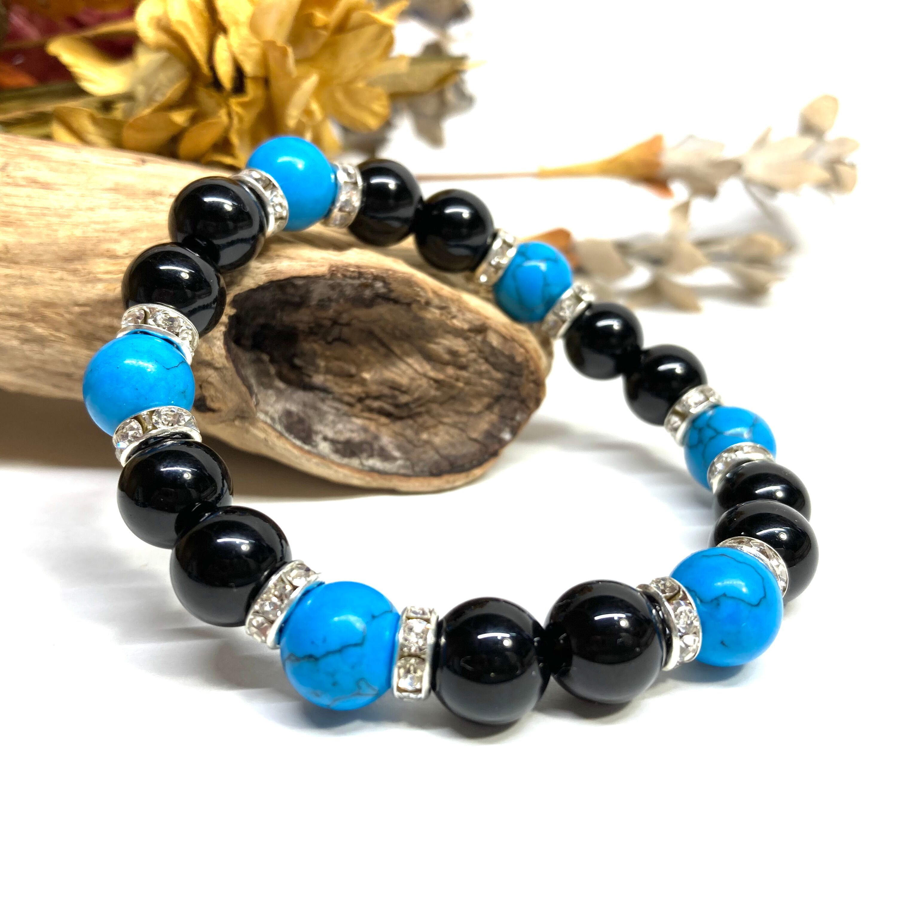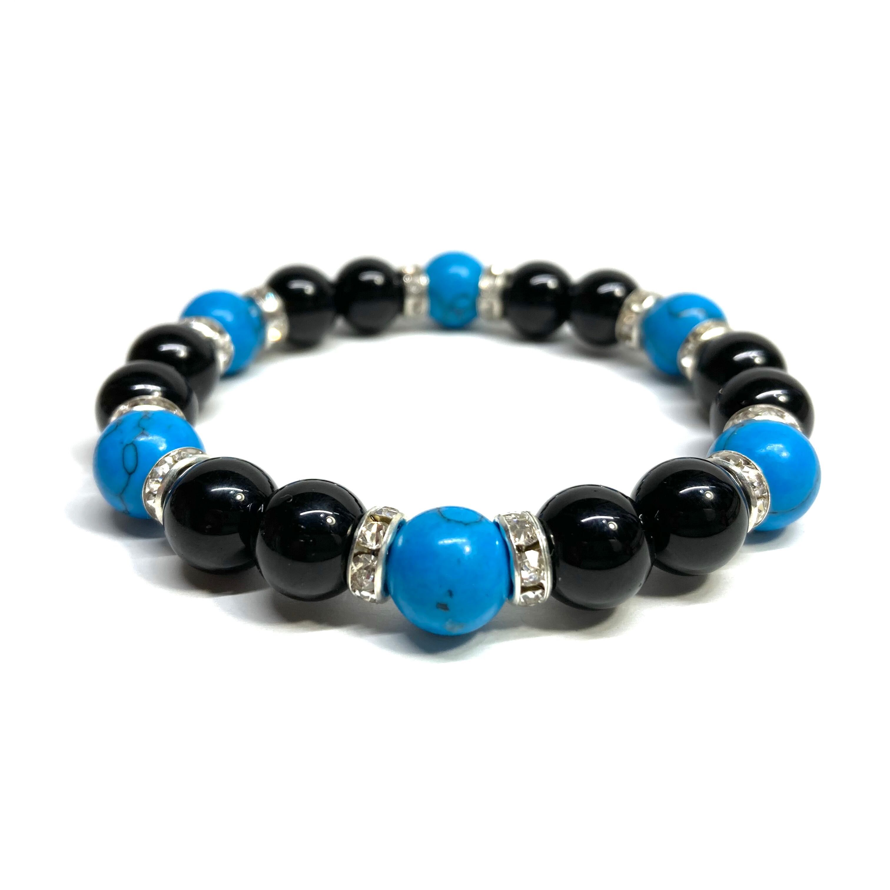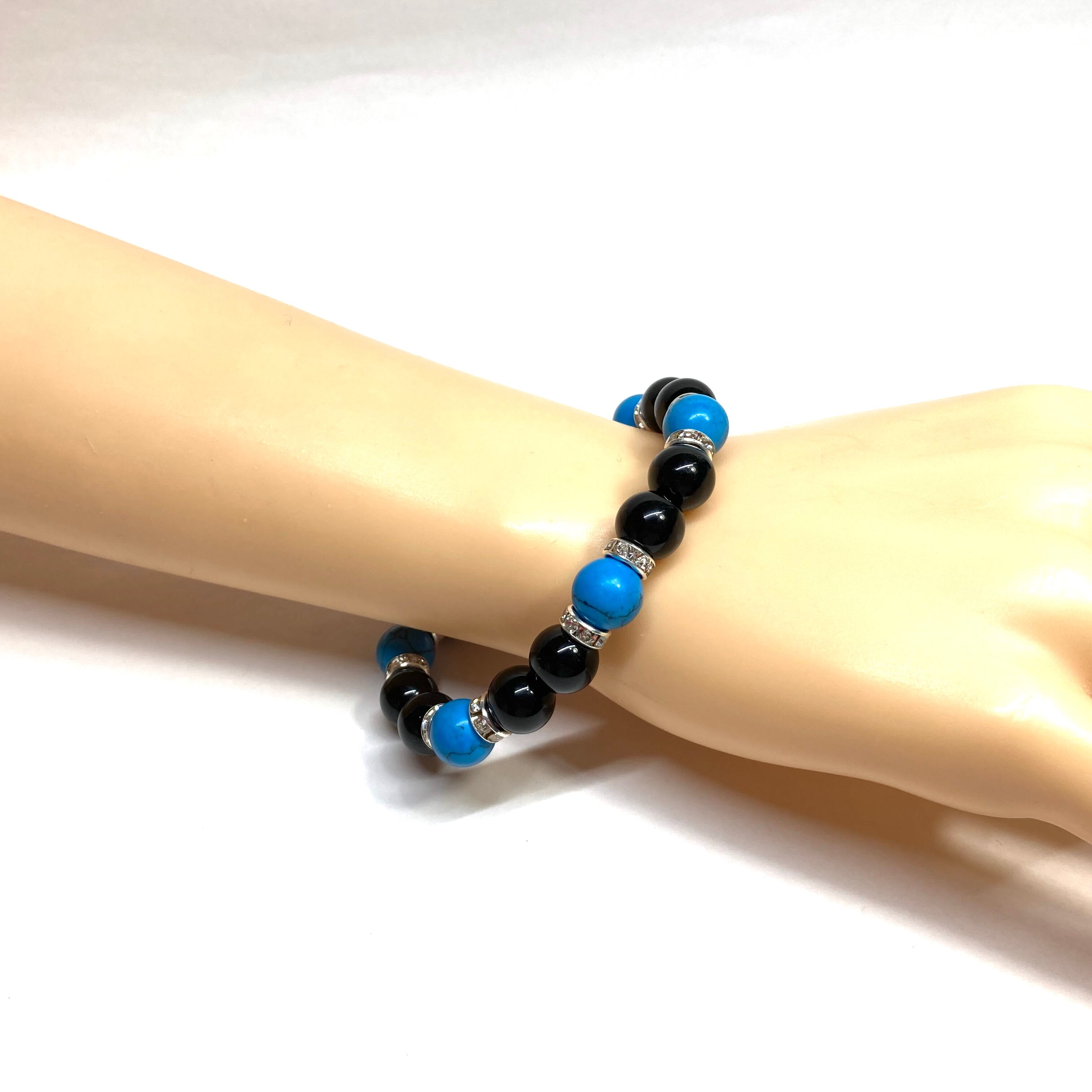こちらは、モリオンとターコイズを組み合わせたパワーストーンブレスレットです。間にはロンデルを挟み高級感あるデザインに仕上げております。石大きさは腕にも馴染みやすいように10mm玉で内径約18cm(伸可能)です。 数に限りがございますので気になる方はお早めにどうぞ。