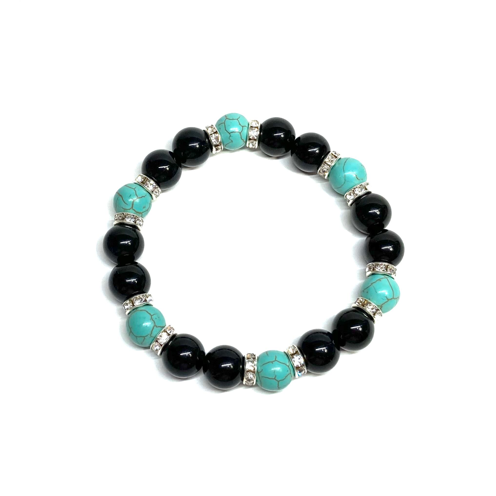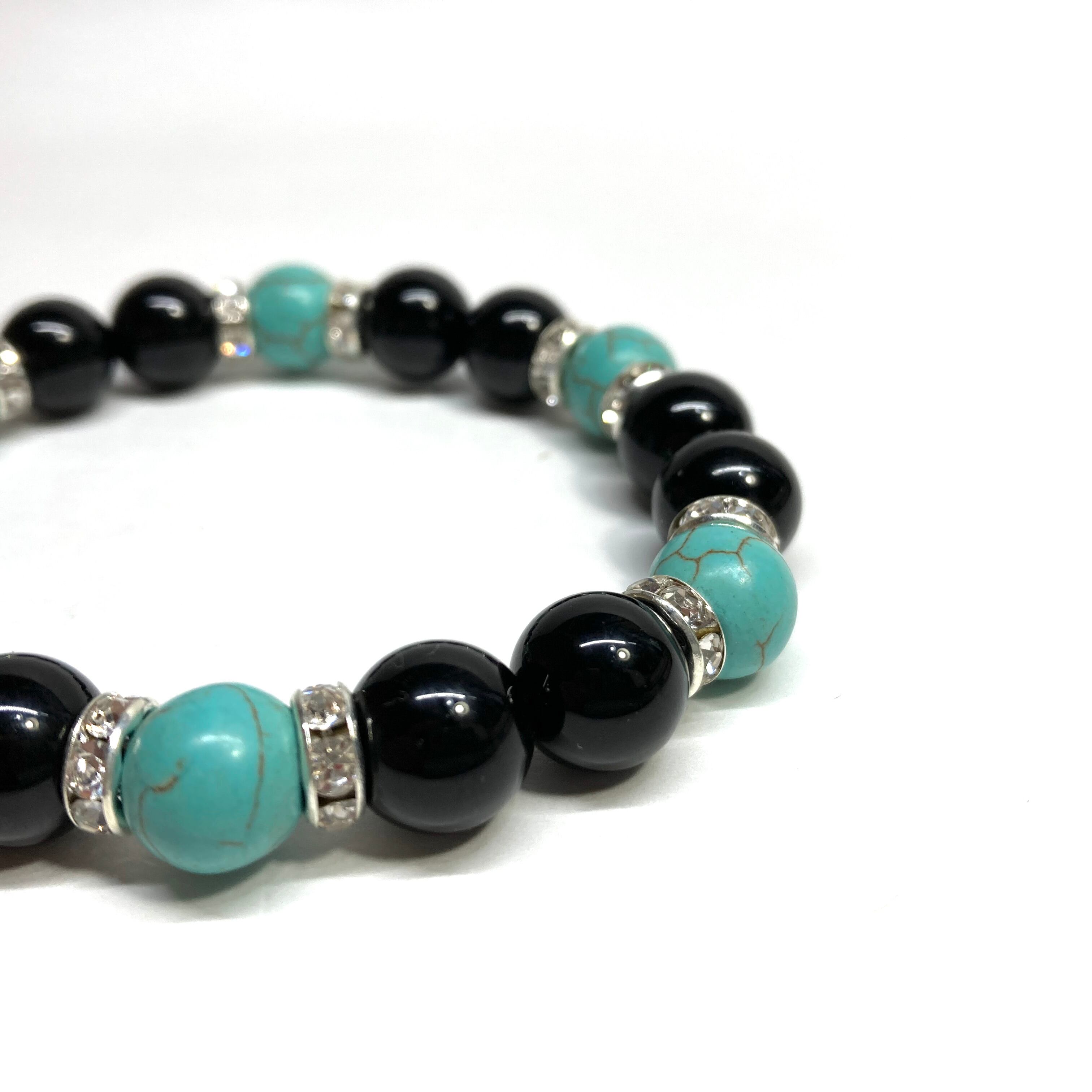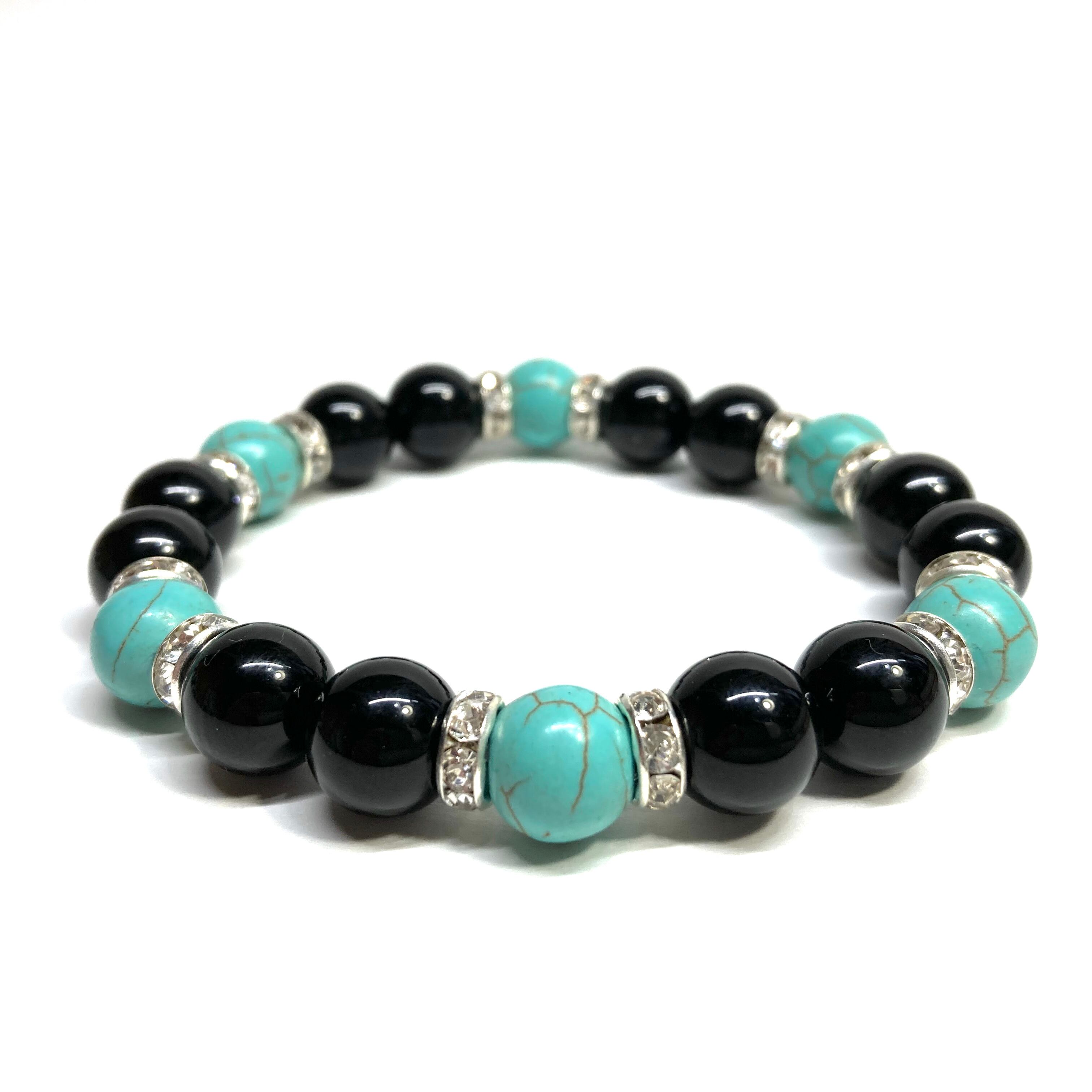 こちらは、モリオンとターコイズを組み合わせたパワーストーンブレスレットです。間にはロンデルを挟み高級感あるデザインに仕上げております。石大きさは腕にも馴染みやすいように10mm玉で内径約18cm(伸可能)です。 数に限りがございますので気になる方はお早めにどうぞ。