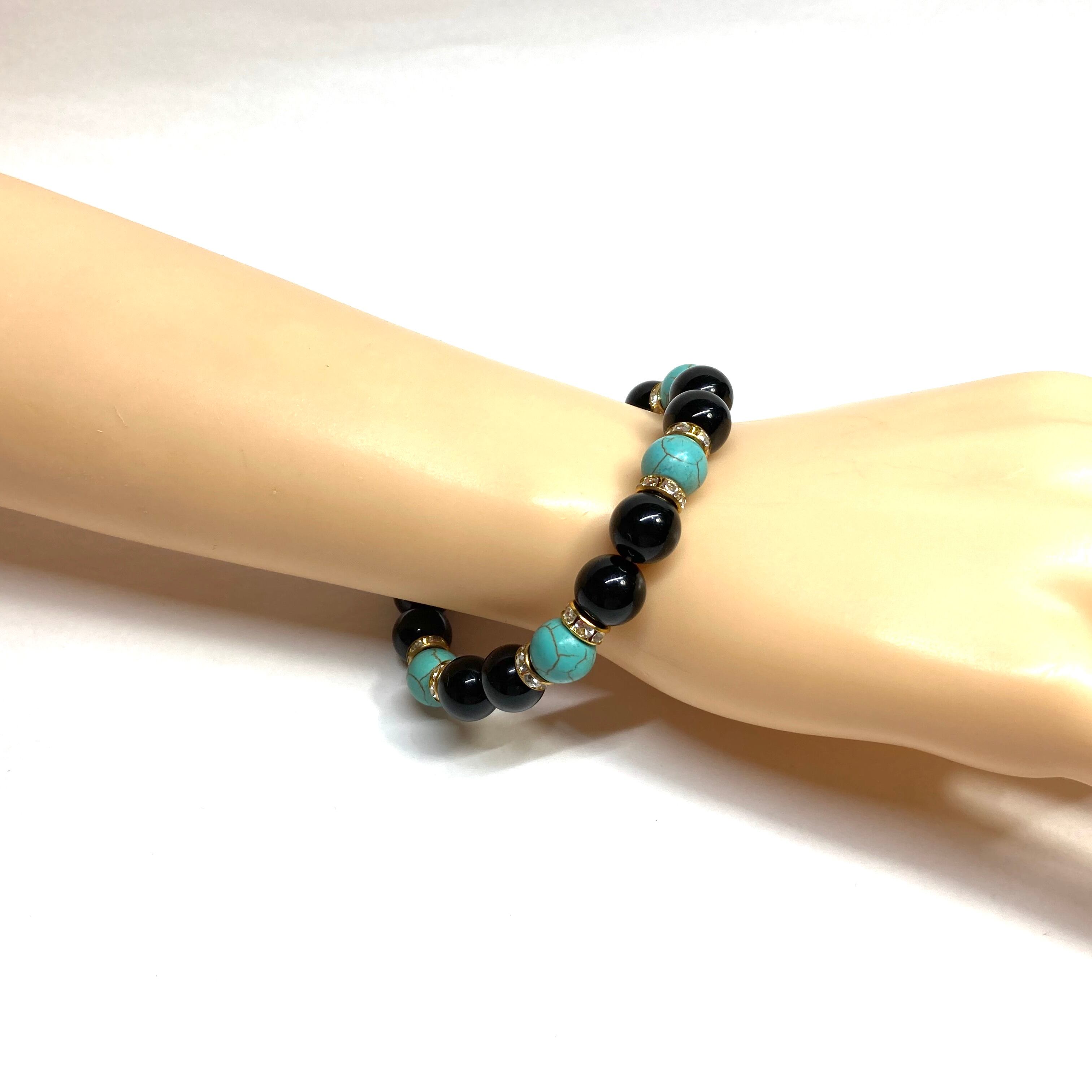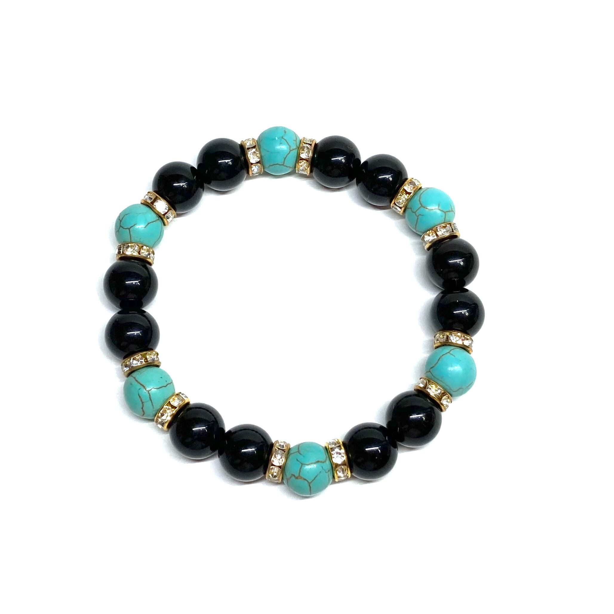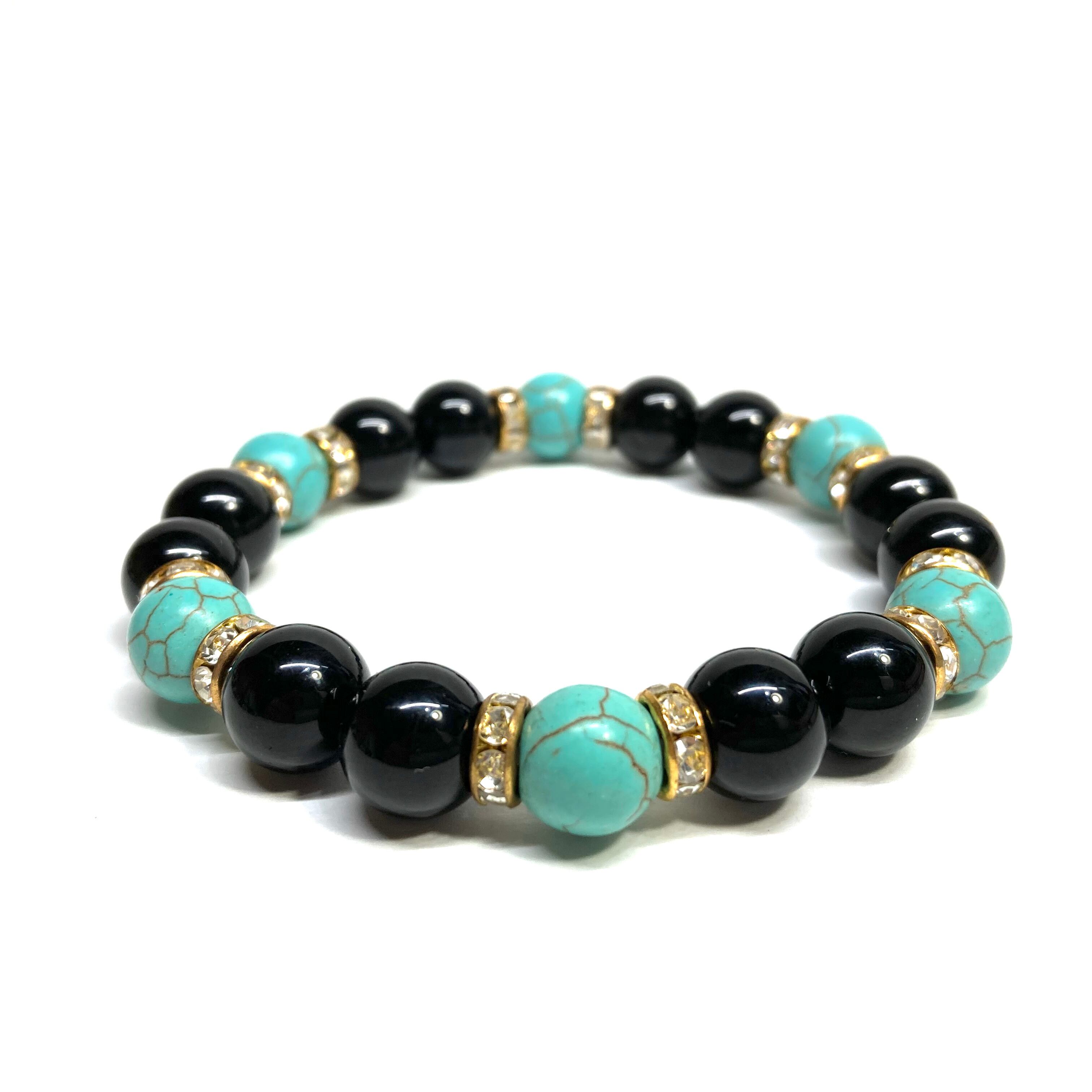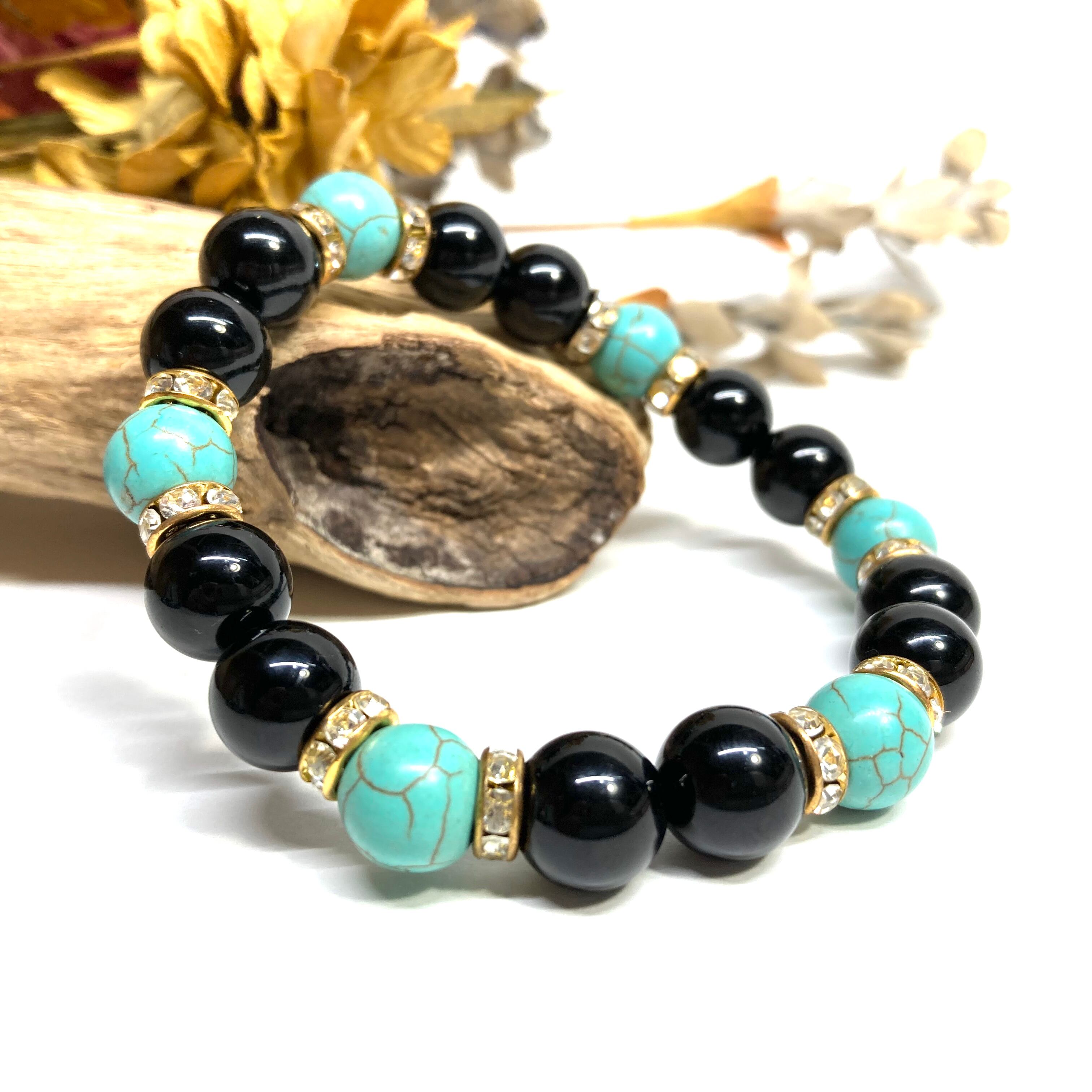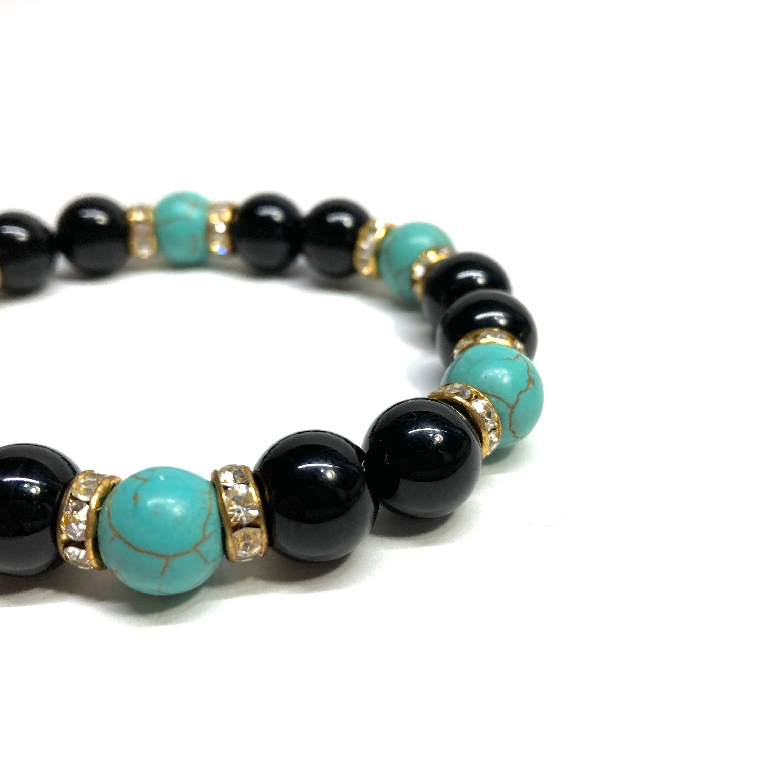 こちらは、モリオンとターコイズを組み合わせたパワーストーンブレスレットです。間にはロンデルを挟み高級感あるデザインに仕上げております。石大きさは腕にも馴染みやすいように10mm玉で内径約18cm(伸可能)です。 数に限りがございますので気になる方はお早めにどうぞ。