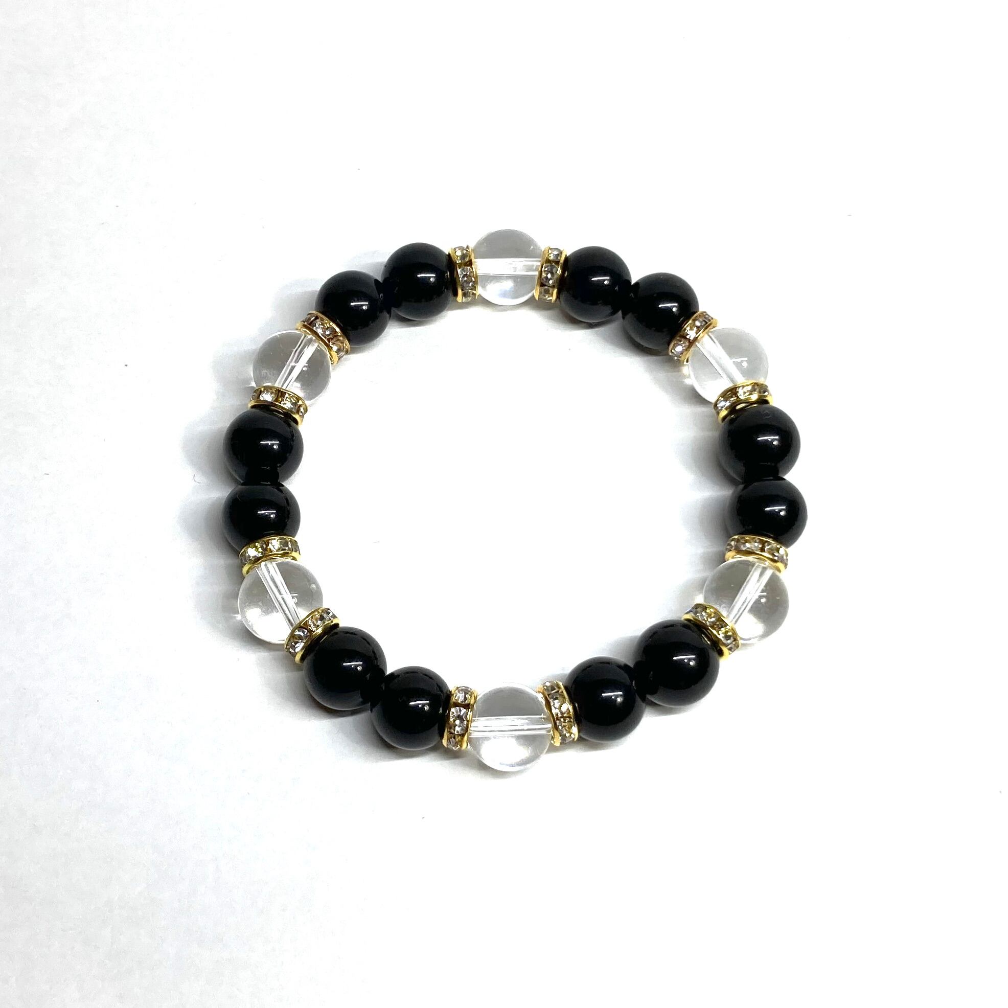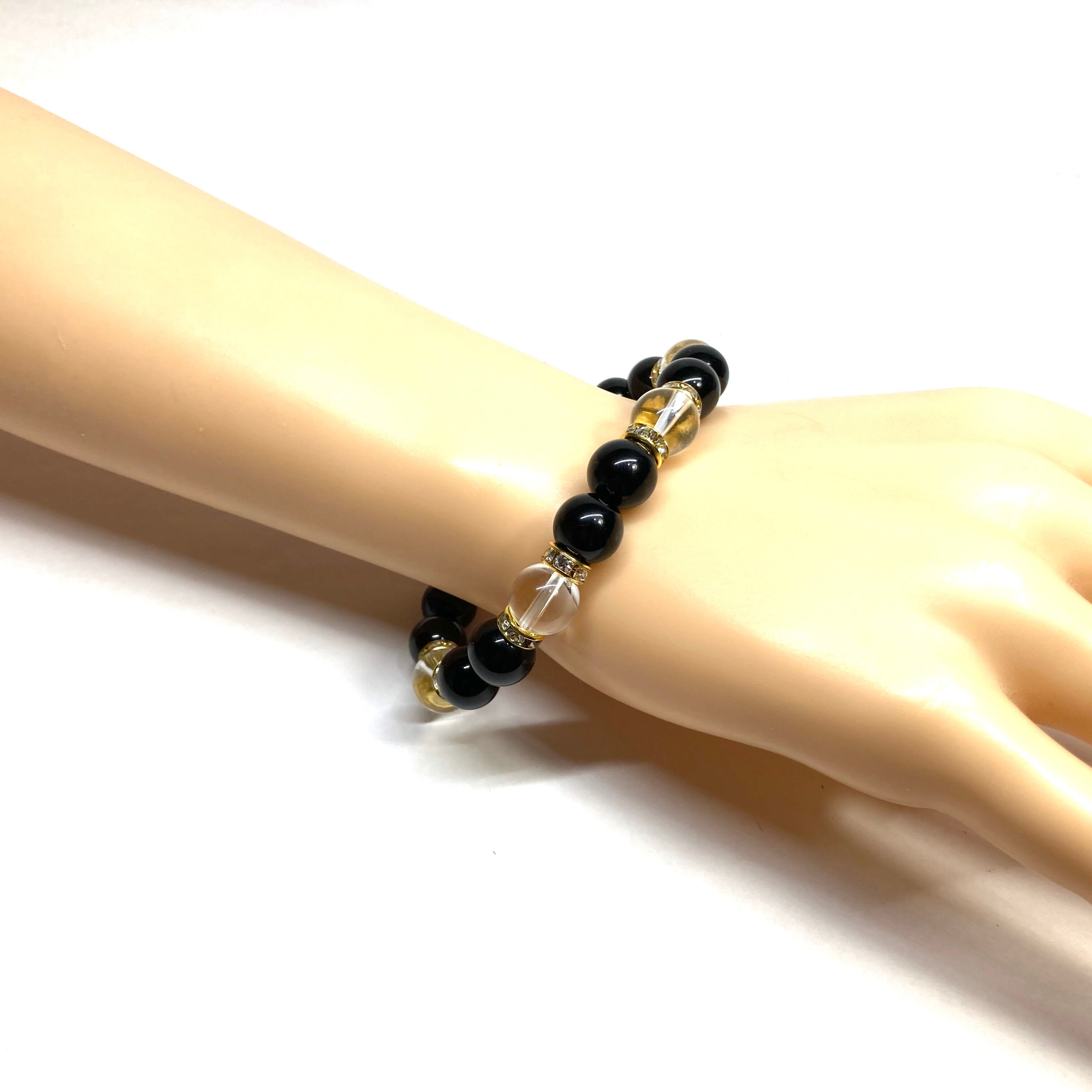 こちらは、モリオンと水晶を組み合わせたパワーストーンブレスレットです。間にはロンデルを挟み高級感あるデザインに仕上げております。石大きさは腕にも馴染みやすいように10mm玉で内径約18cm(伸可能)です。 数に限りがございますので気になる方はお早めにどうぞ。