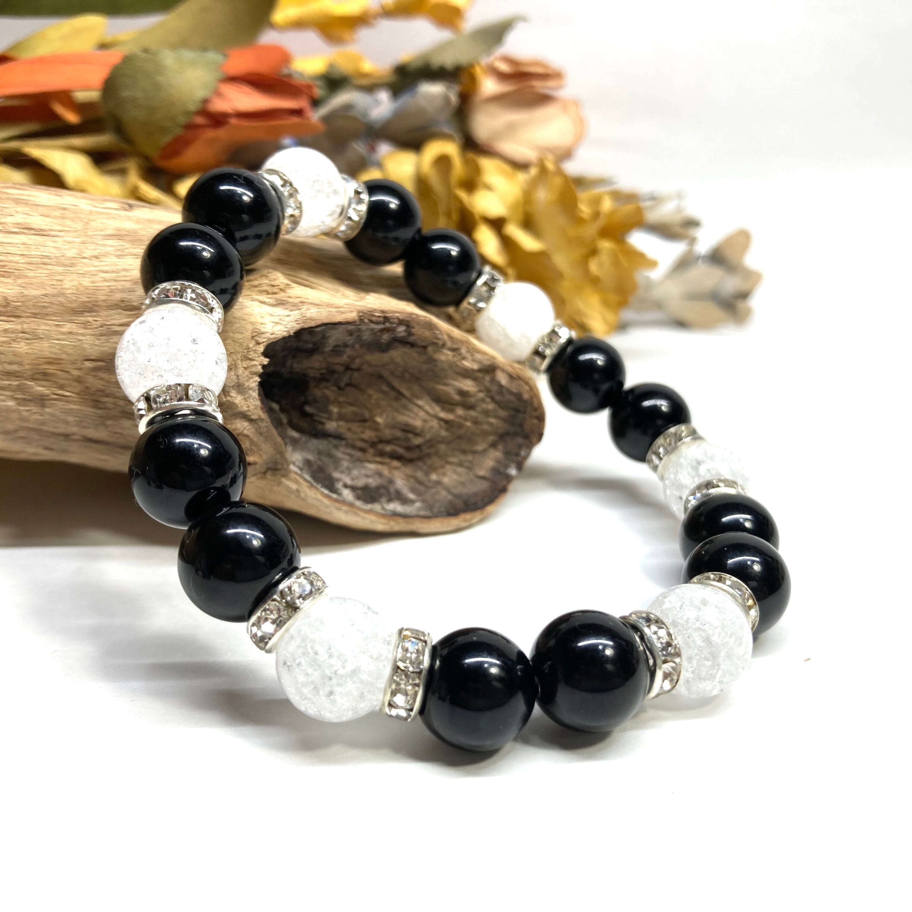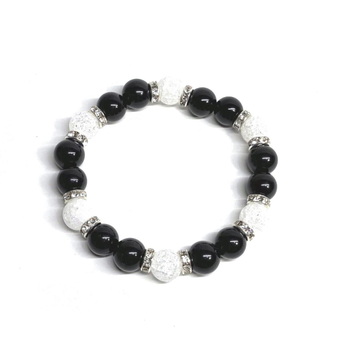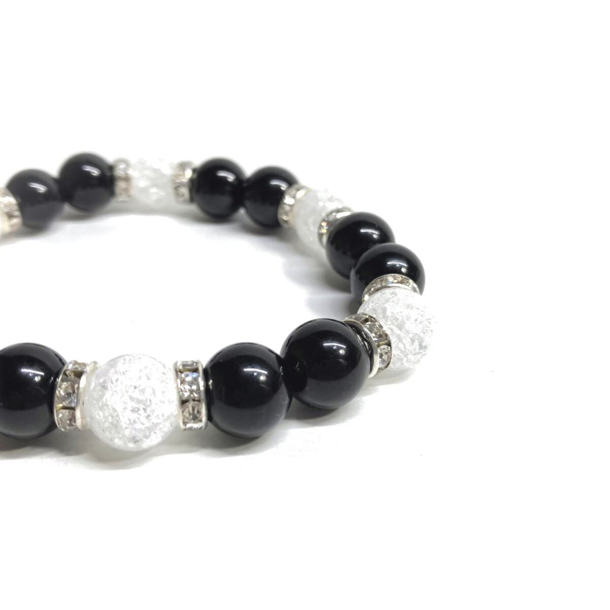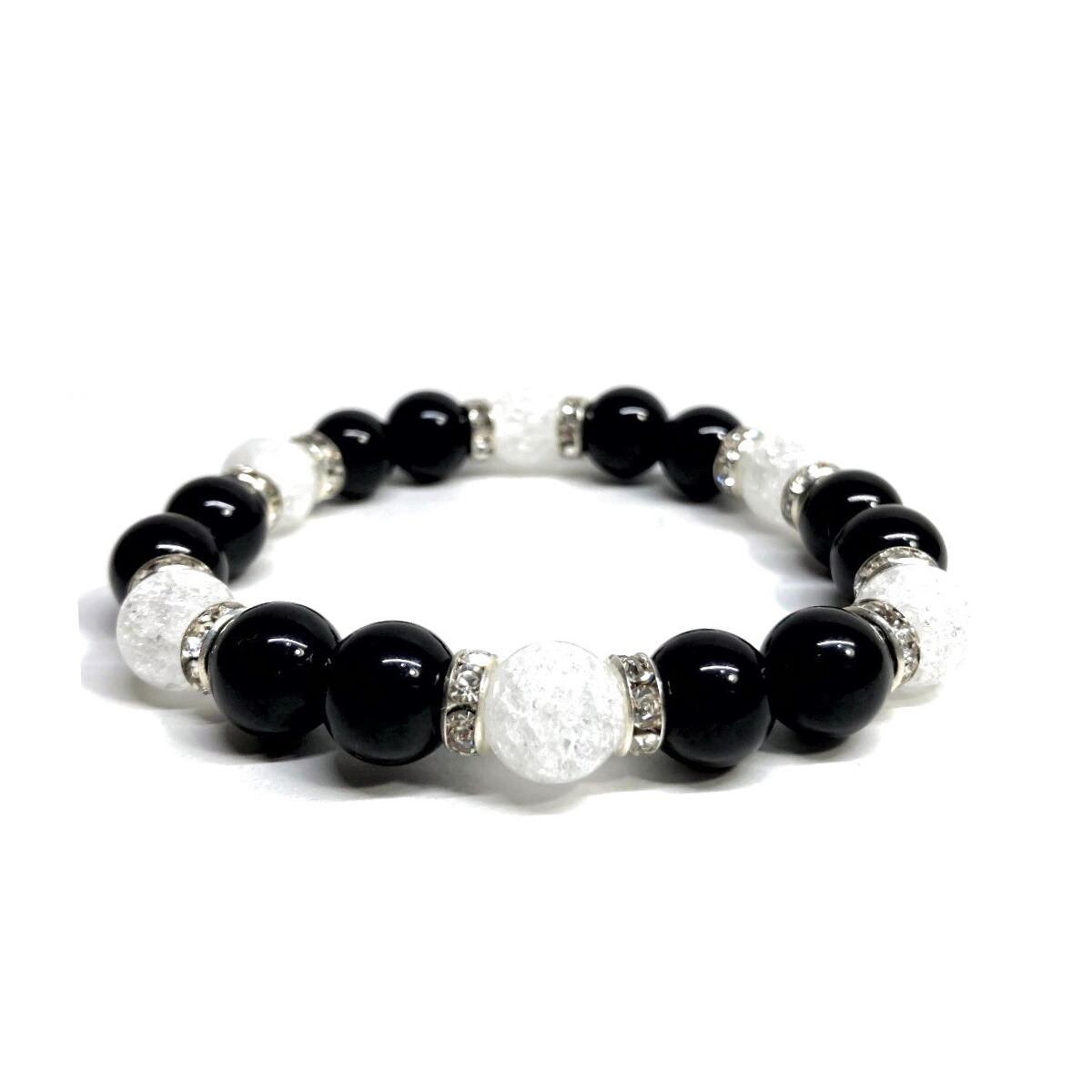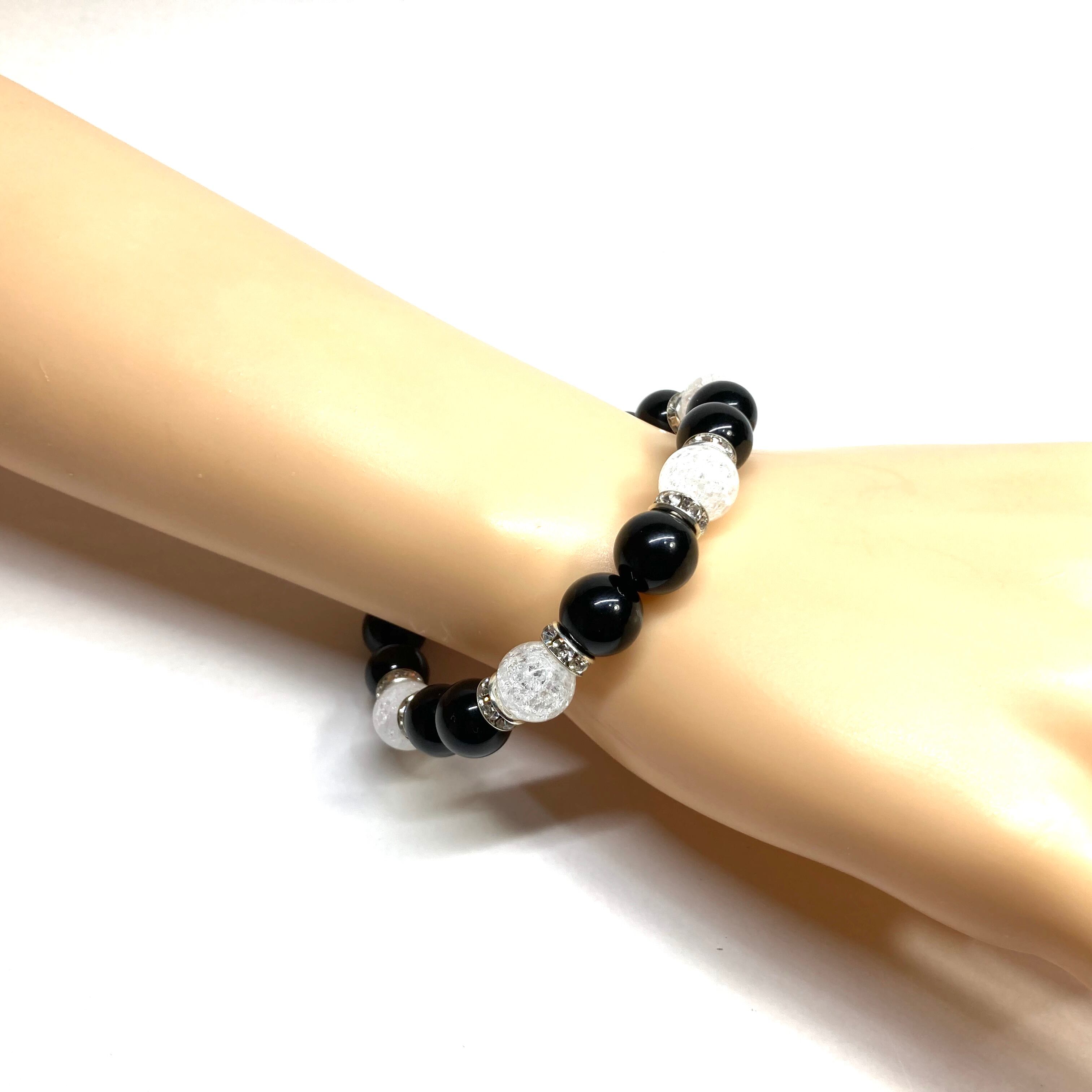 こちらは、モリオンとクラック水晶を組み合わせたパワーストーンブレスレットです。間にはロンデルを挟み高級感あるデザインに仕上げております。石大きさは腕にも馴染みやすいように10mm玉で内径約18cm(伸可能)です。 数に限りがございますので気になる方はお早めにどうぞ。