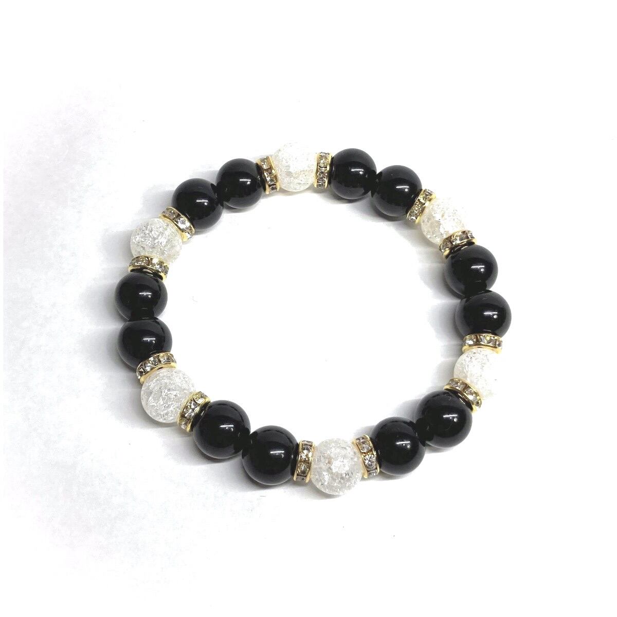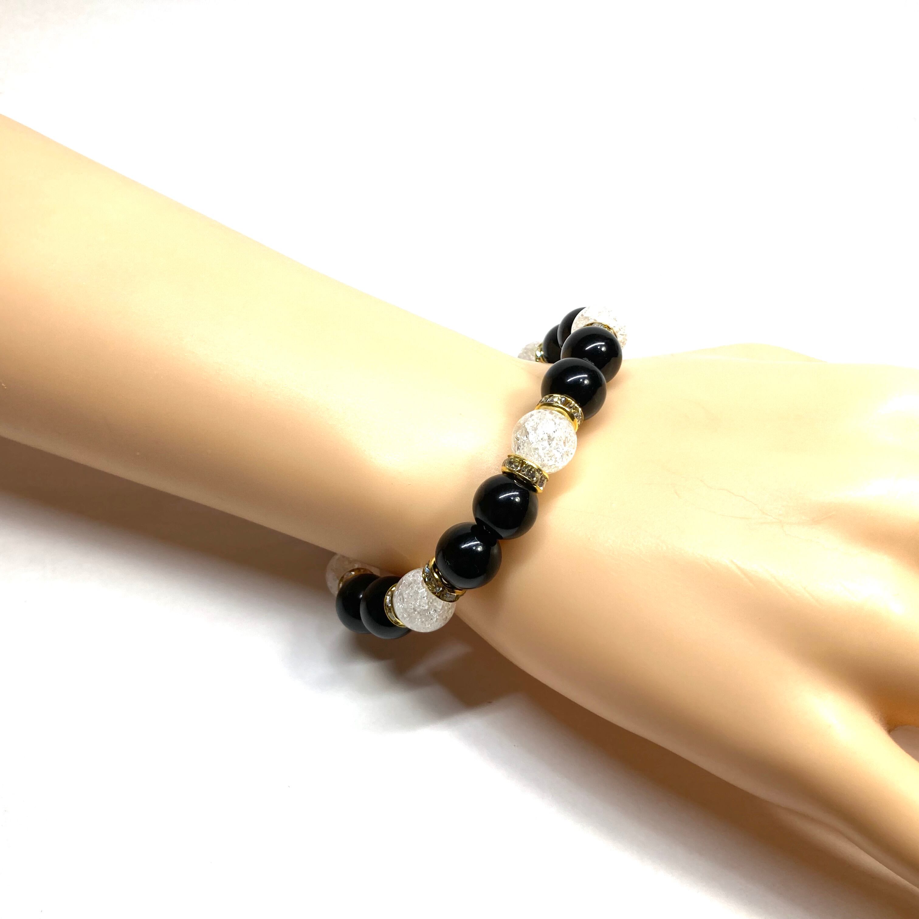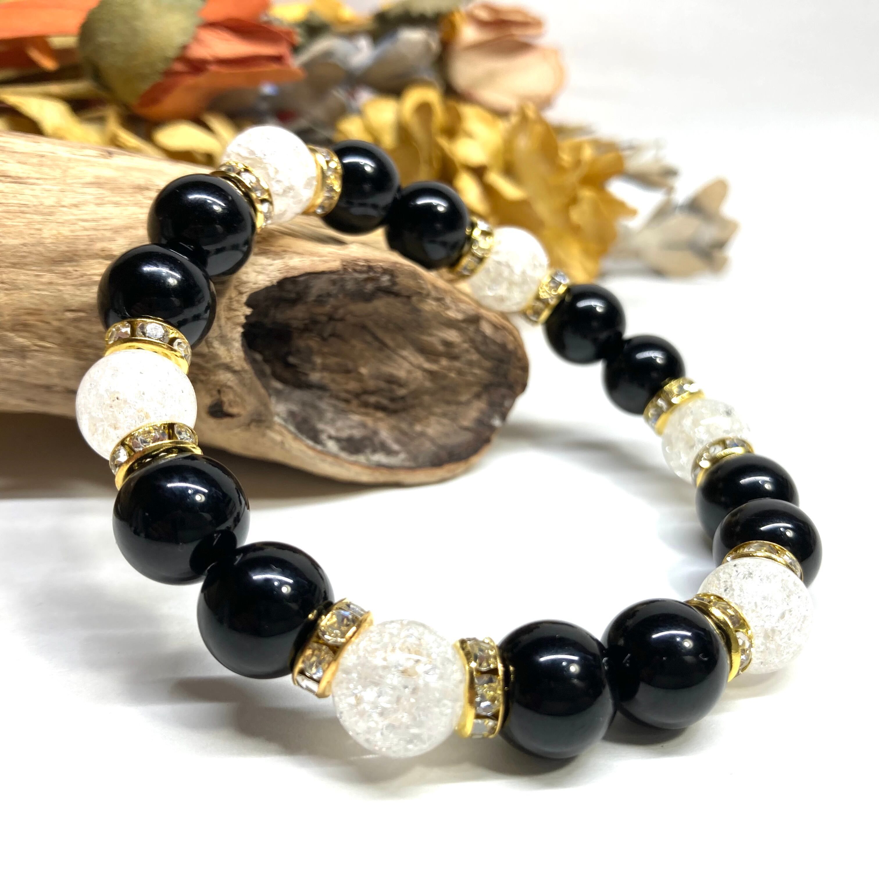 こちらは、モリオンとクラック水晶を組み合わせたパワーストーンブレスレットです。間にはロンデルを挟み高級感あるデザインに仕上げております。石大きさは腕にも馴染みやすいように10mm玉で内径約18cm(伸可能)です。 数に限りがございますので気になる方はお早めにどうぞ。