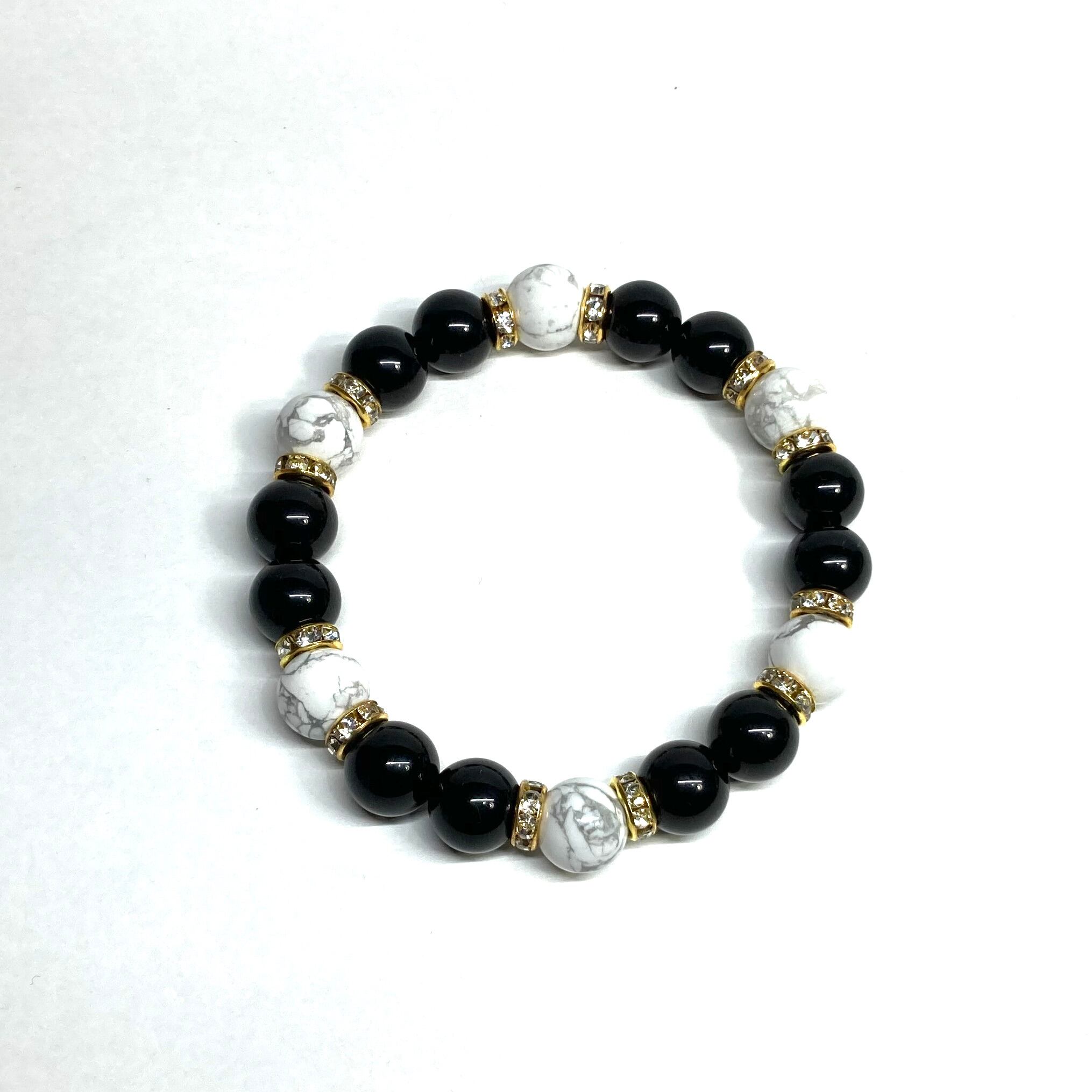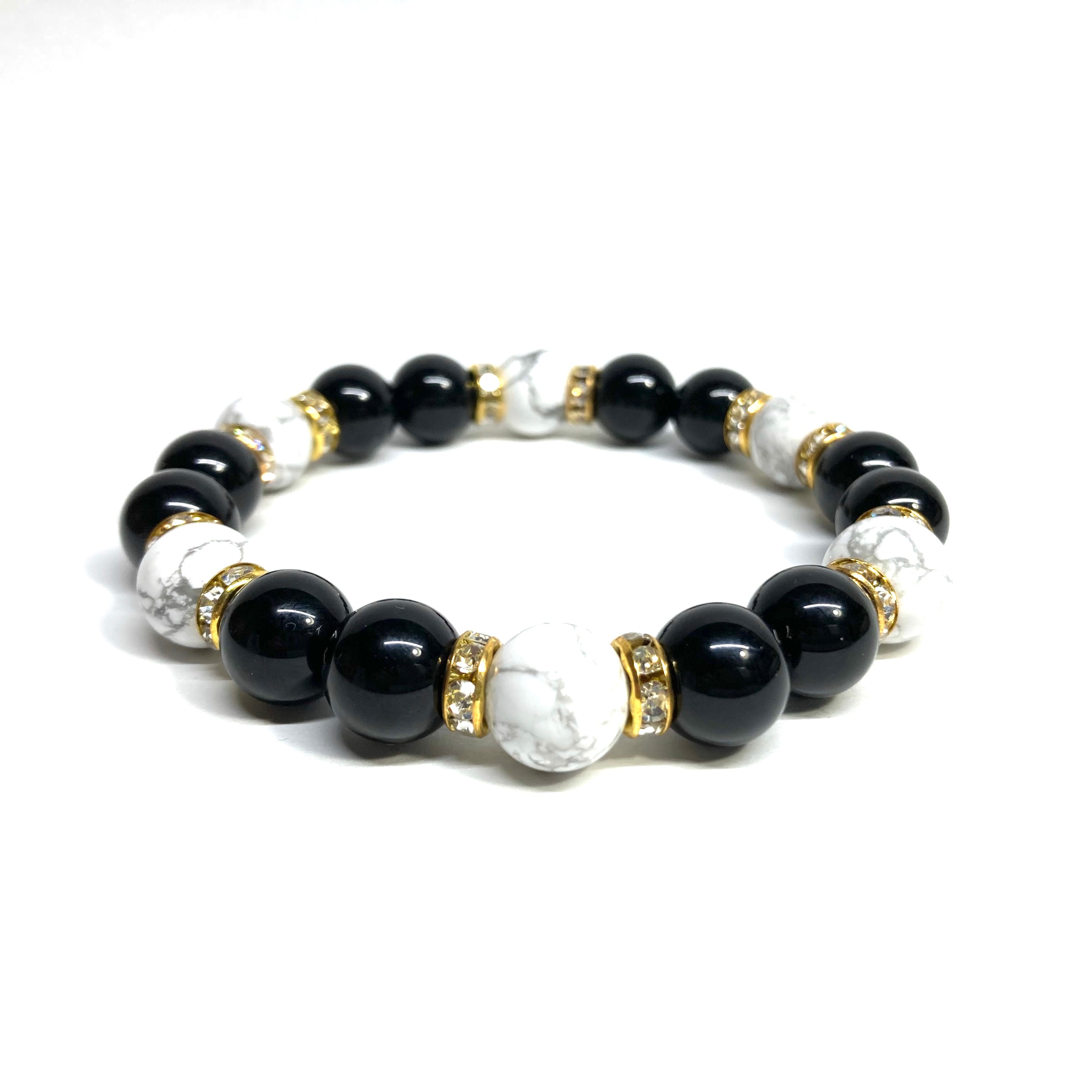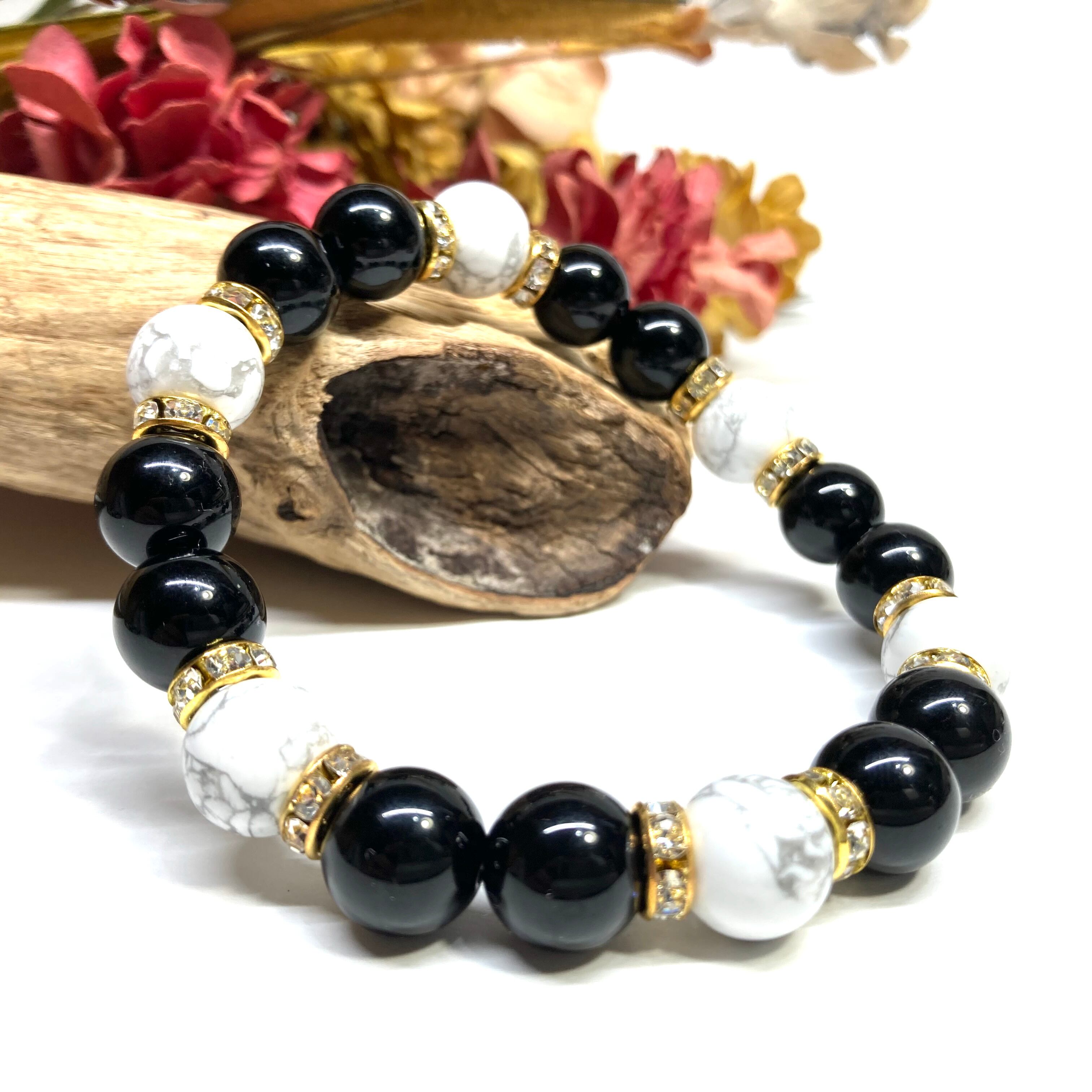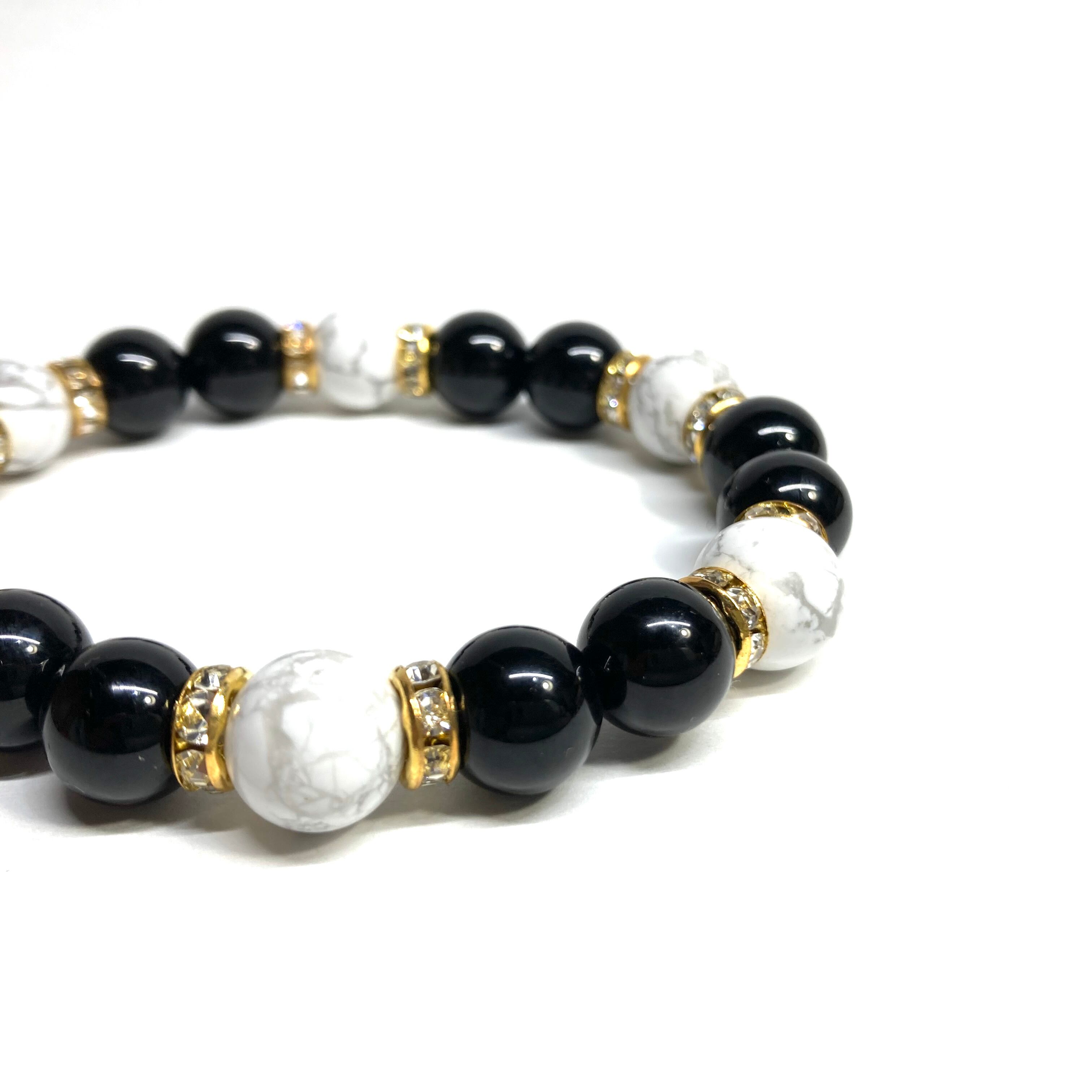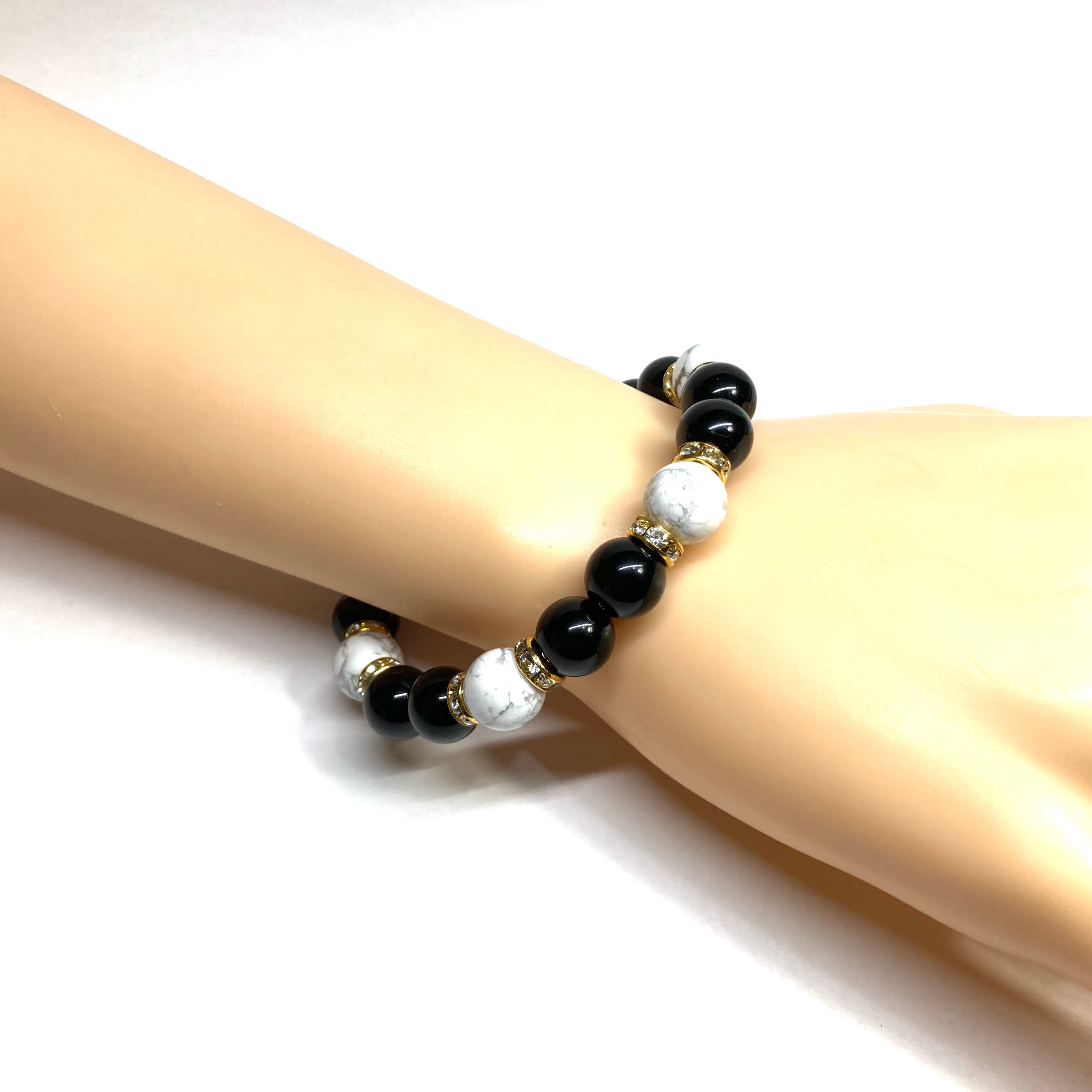 こちらは、モリオンとハウライトを組み合わせたパワーストーンブレスレットです。間にはロンデルを挟み高級感あるデザインに仕上げております。石大きさは腕にも馴染みやすいように10mm玉で内径約18cm(伸可能)です。 数に限りがございますので気になる方はお早めにどうぞ。