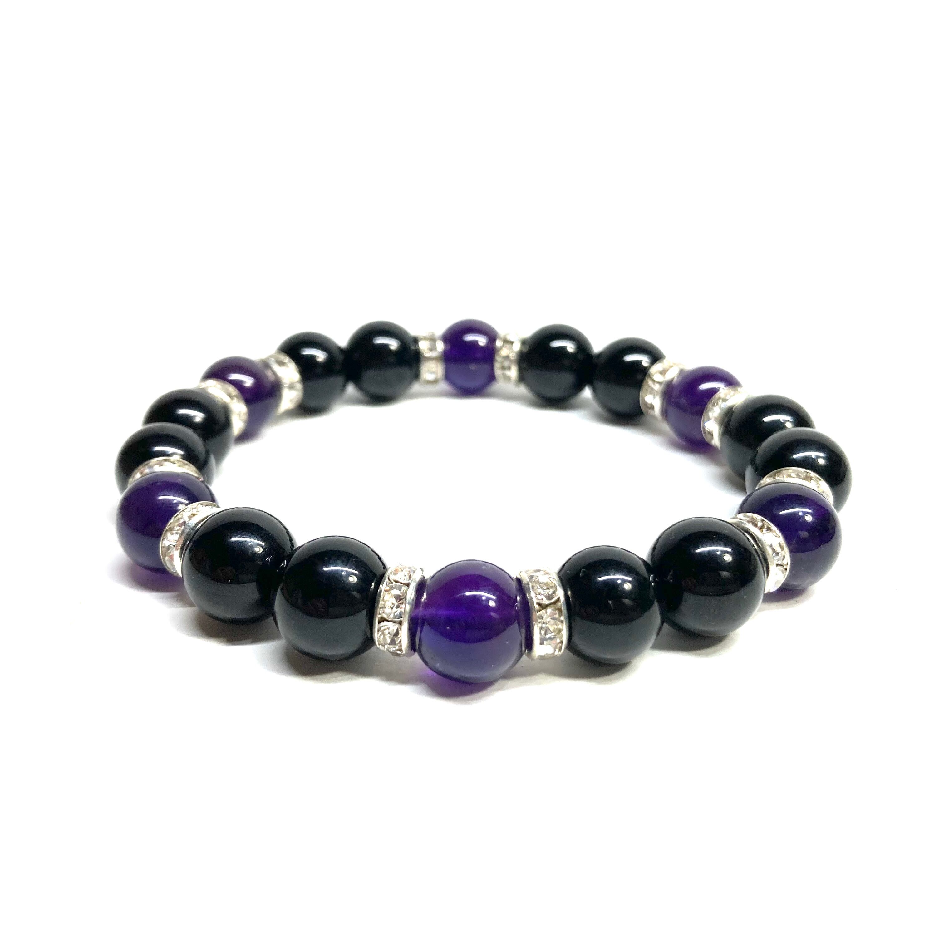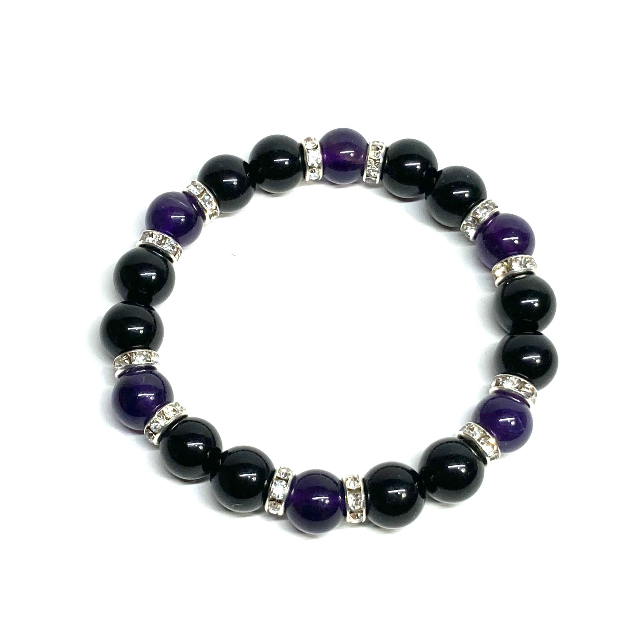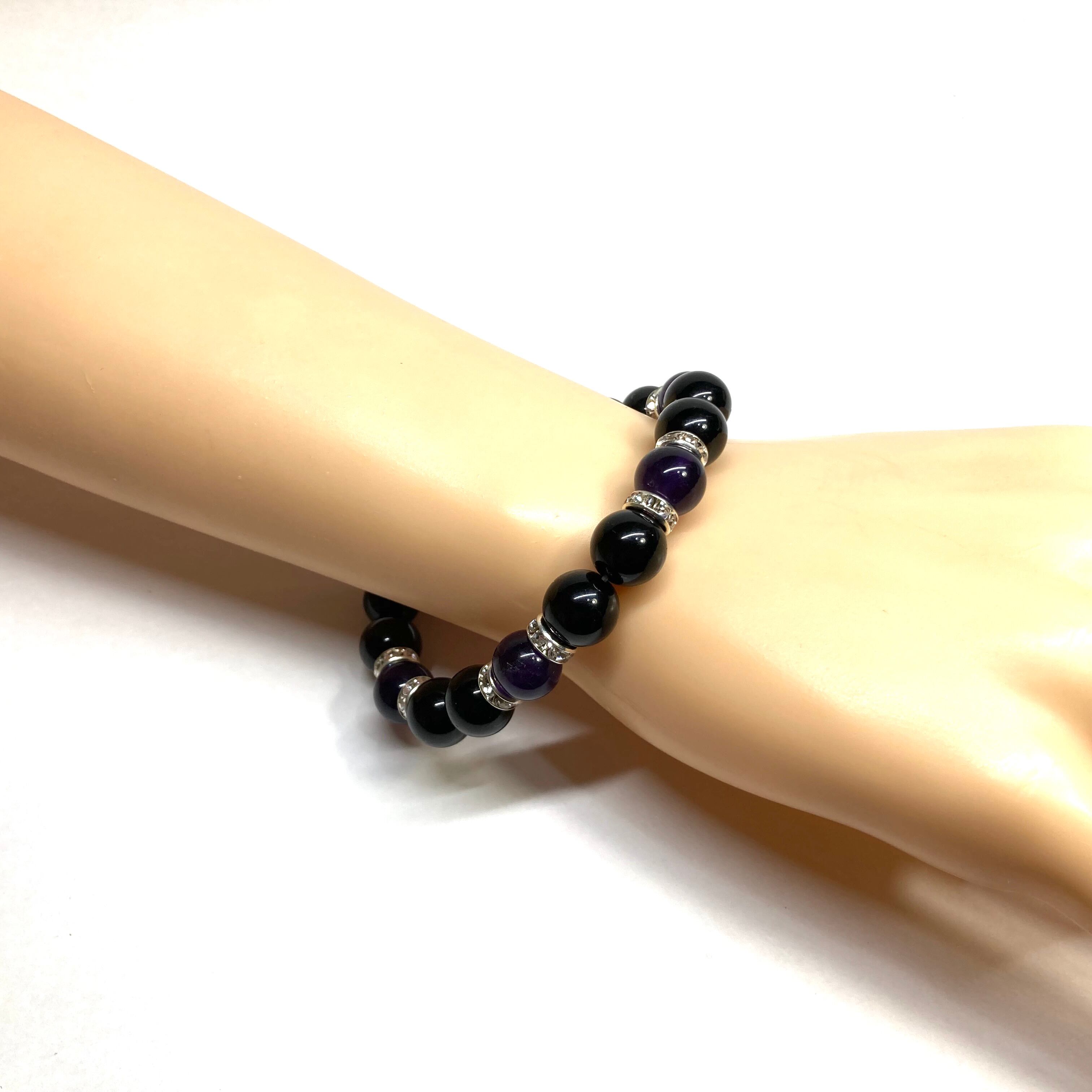 こちらは、モリオンとアメジストを組み合わせたパワーストーンブレスレットです。間にはロンデルを挟み高級感あるデザインに仕上げております。石大きさは腕にも馴染みやすいように10mm玉で内径約18cm(伸可能)です。 数に限りがございますので気になる方はお早めにどうぞ。