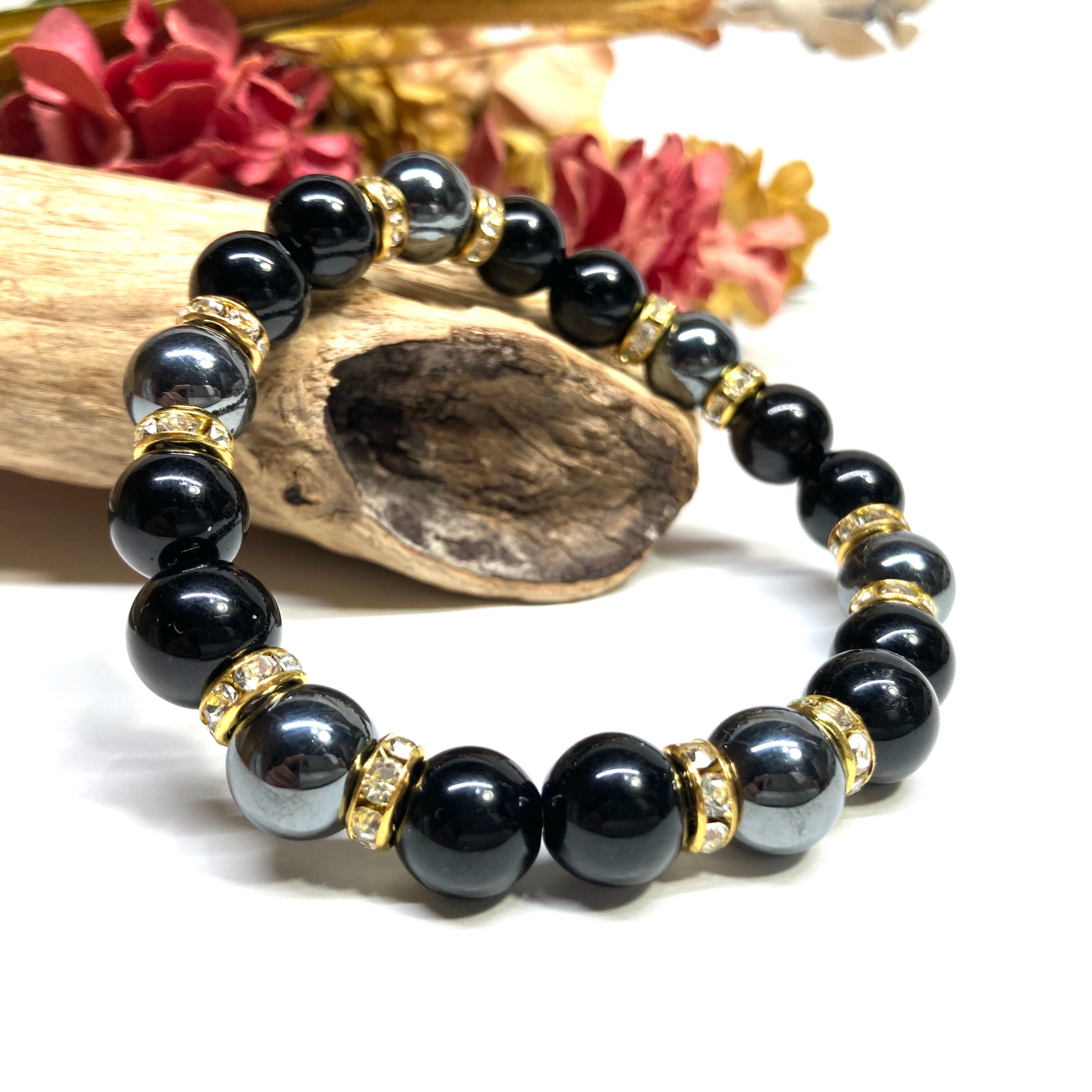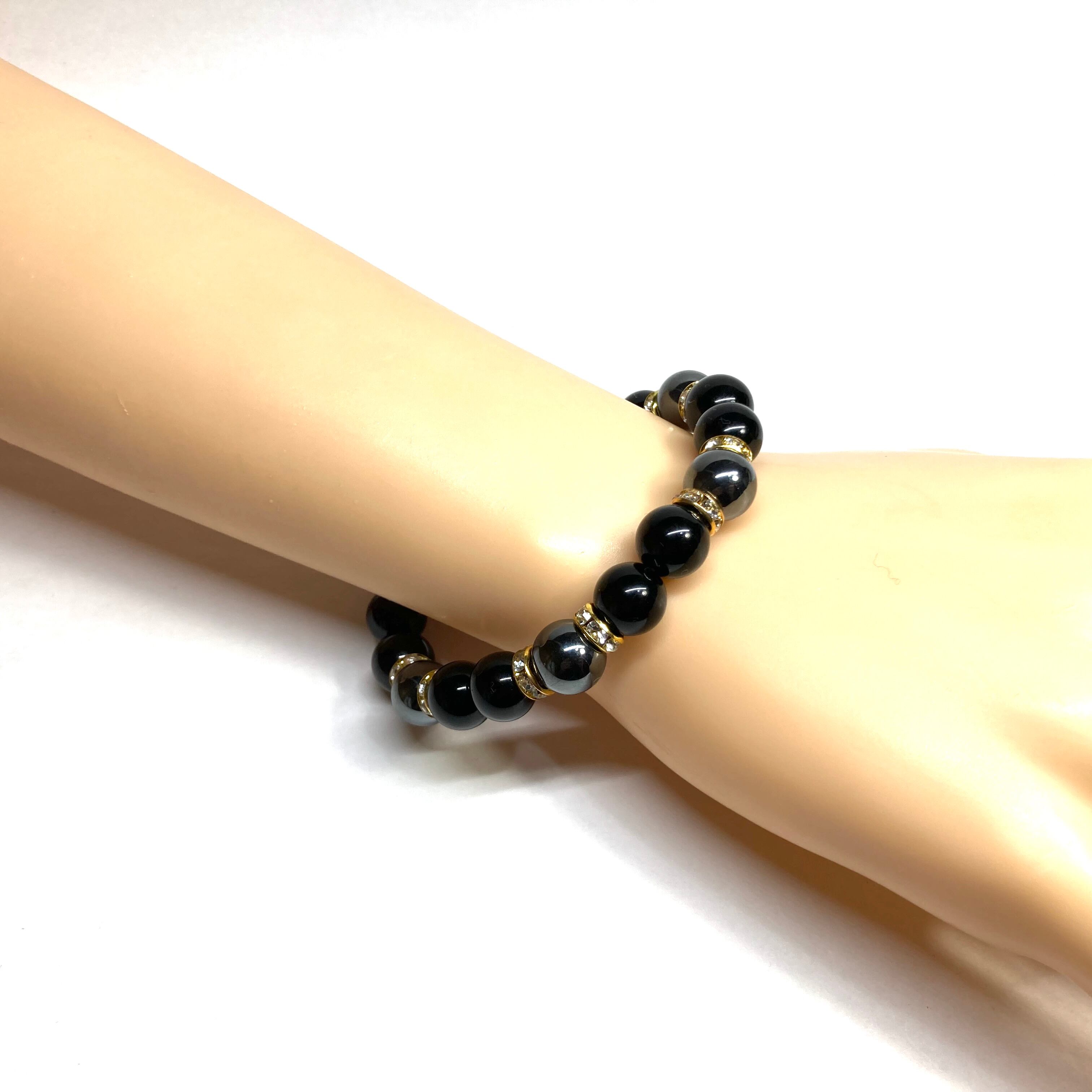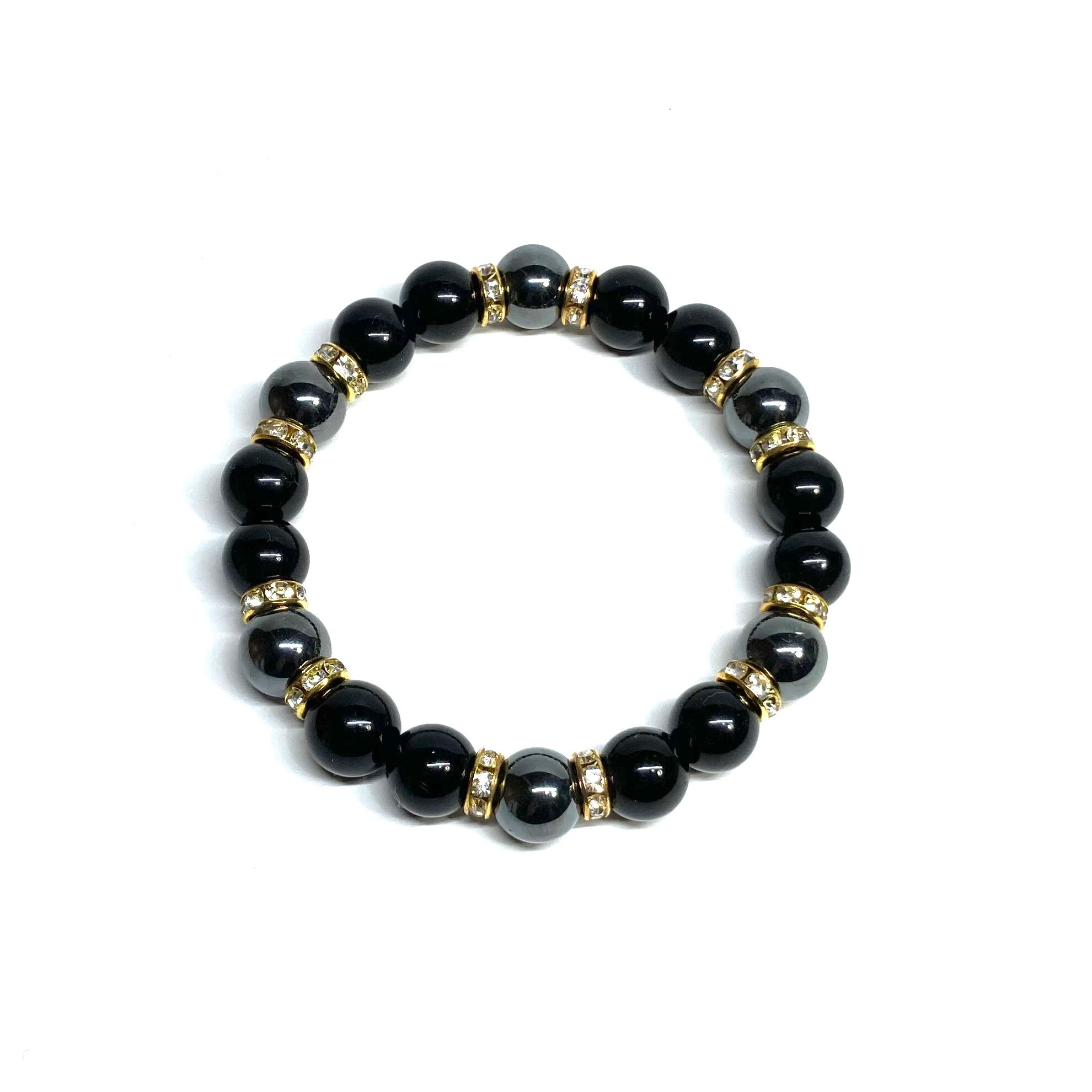 こちらは、モリオンとヘマタイトを組み合わせたパワーストーンブレスレットです。間にはロンデルを挟み高級感あるデザインに仕上げております。石大きさは腕にも馴染みやすいように10mm玉で内径約18cm(伸可能)です。 数に限りがございますので気になる方はお早めにどうぞ。